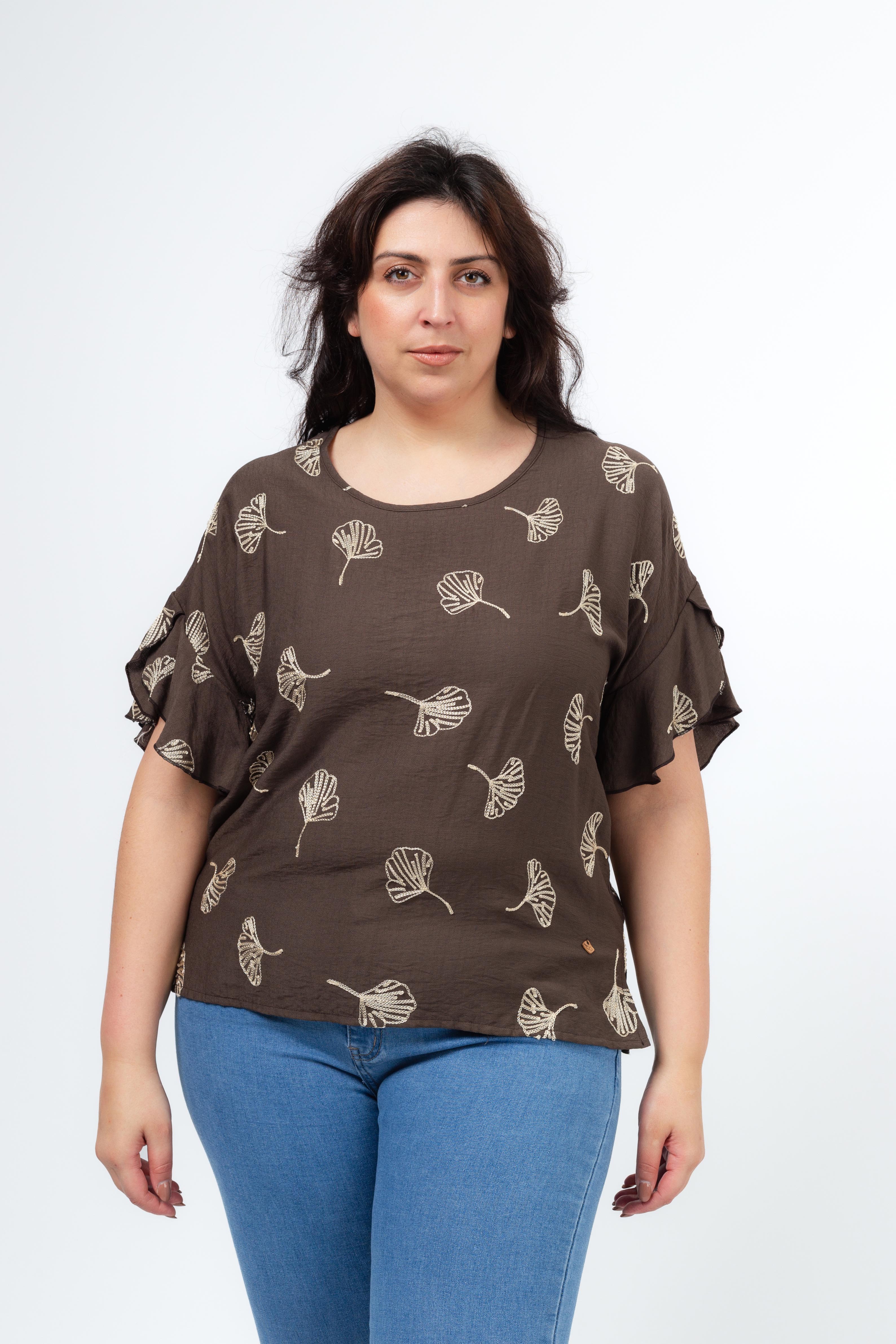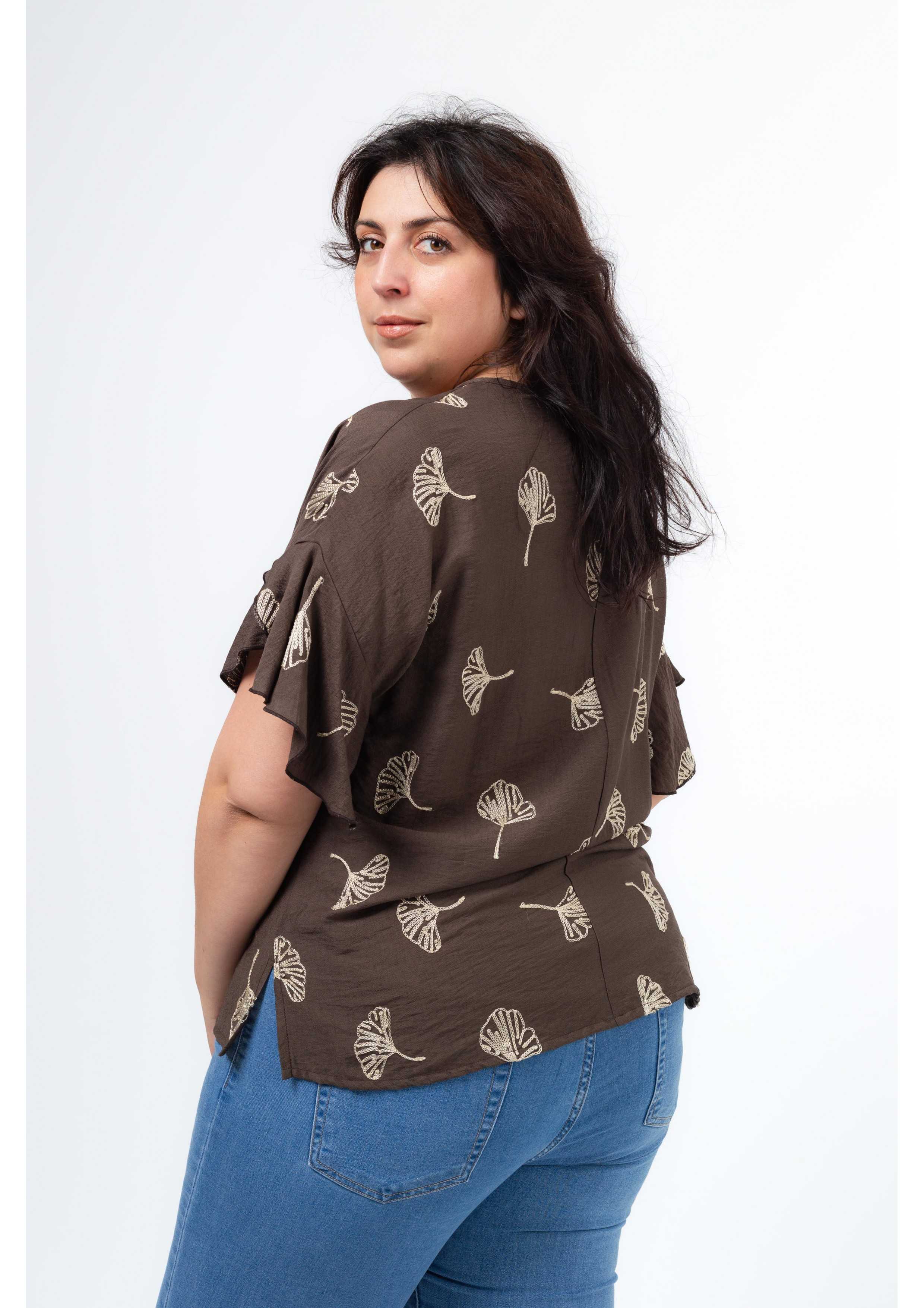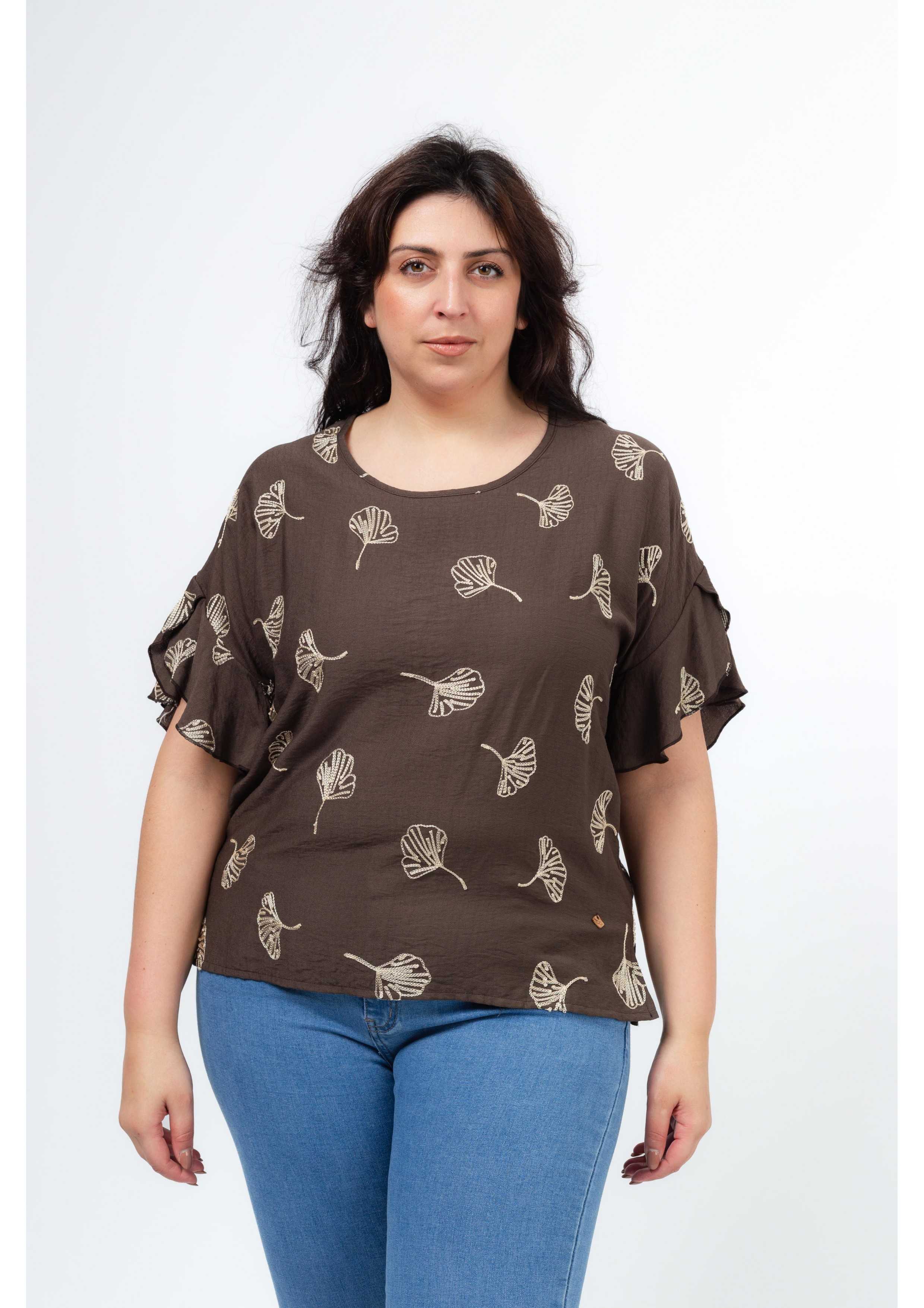 Tunique en tissu uni avec broderie de feuilles sur le tissu. Encolure ronde, découpe au dos avec larme fermée. Manches à volants superposés, avec ourlet roulé et fentes latérales.