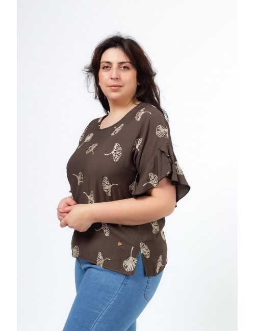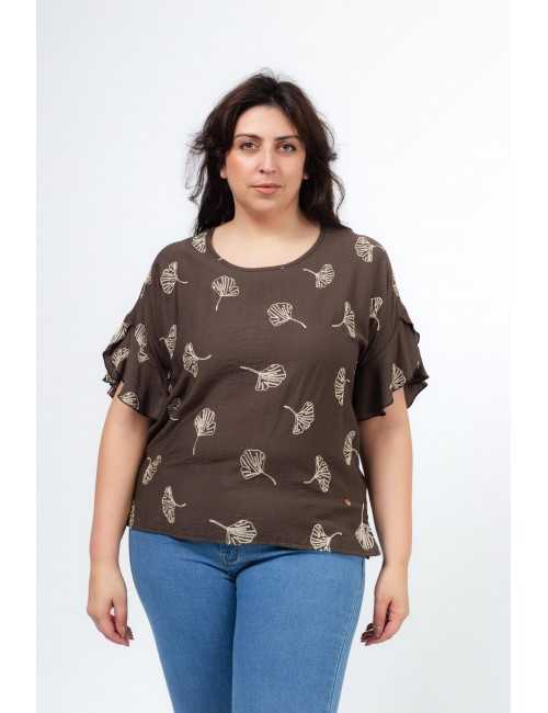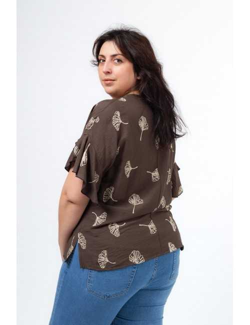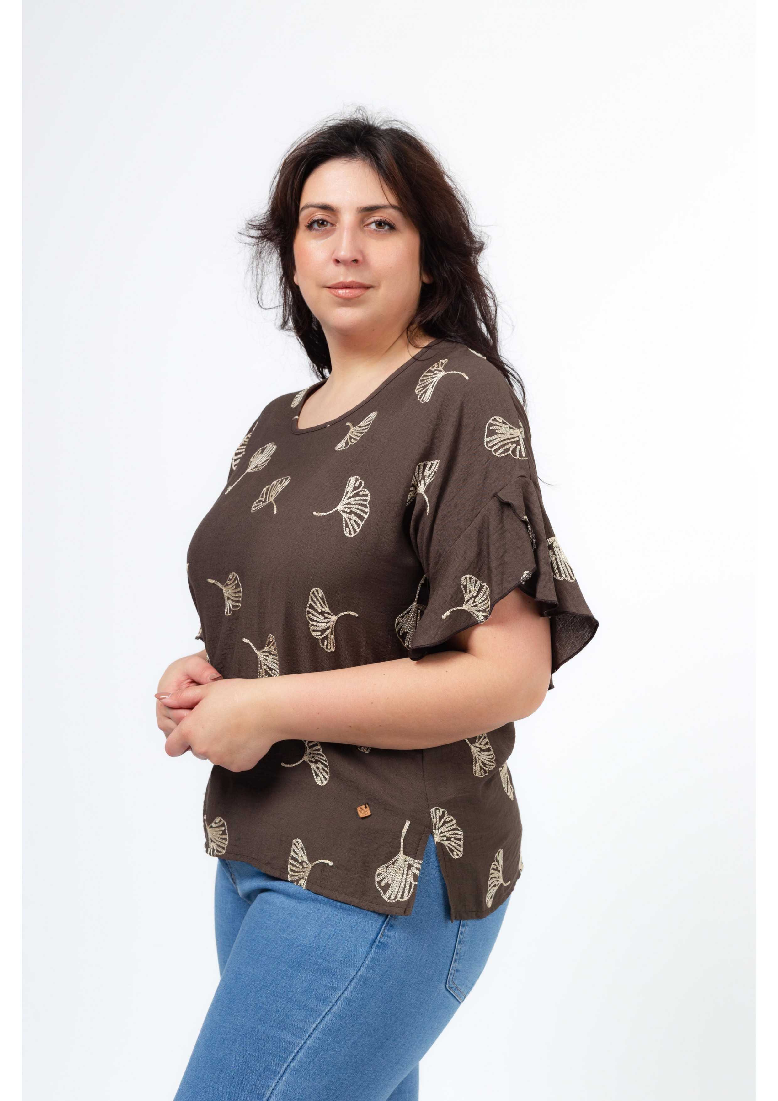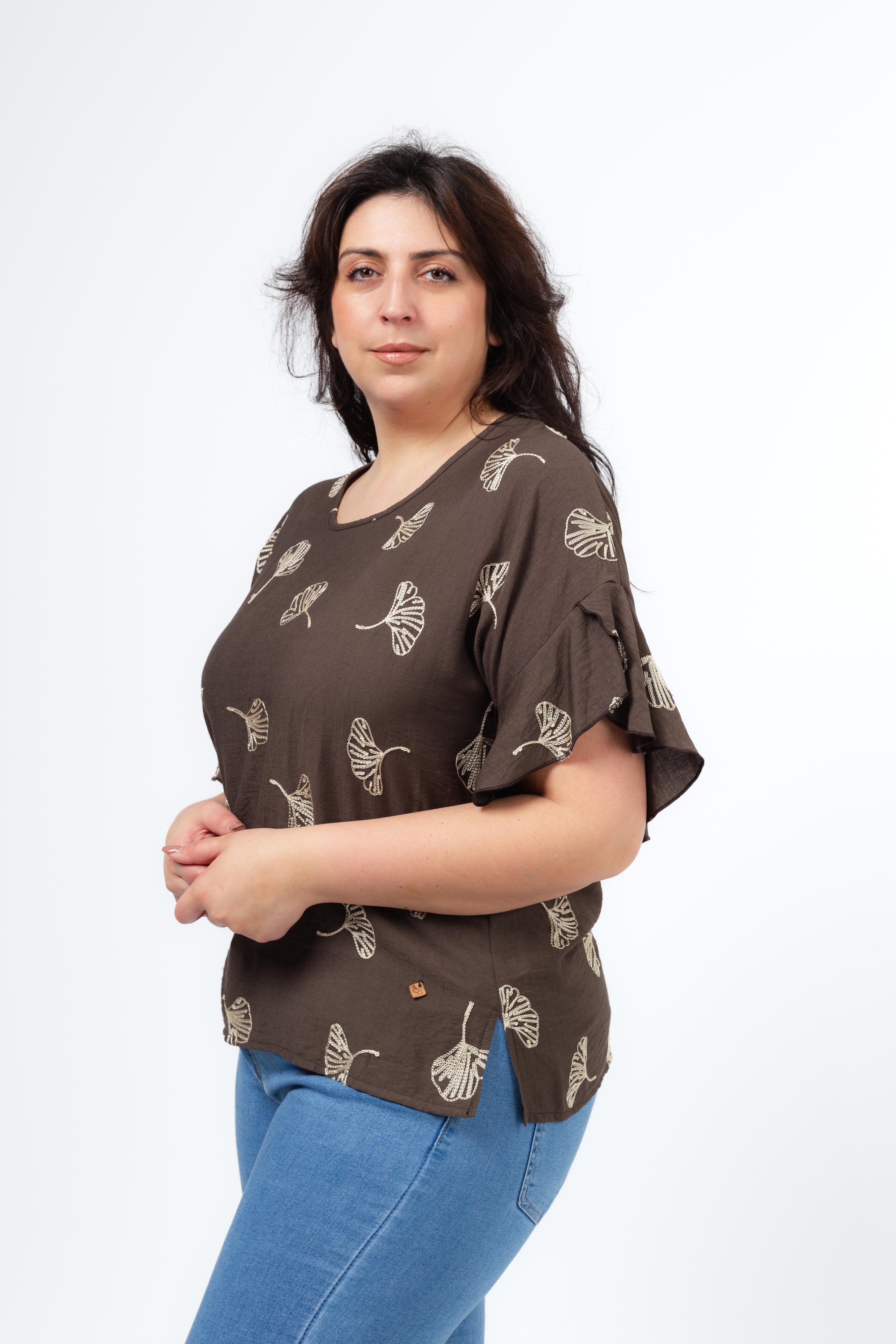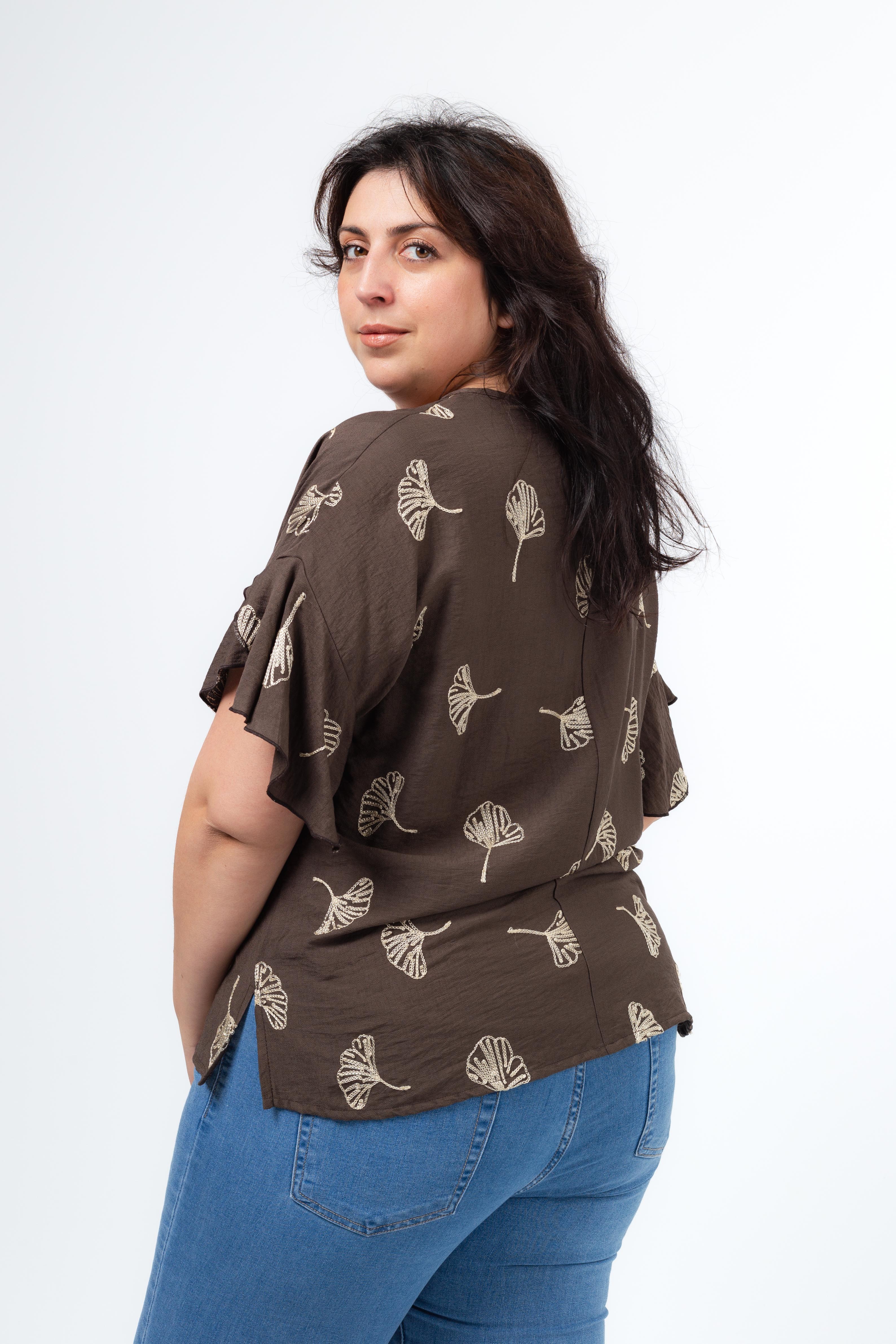 Tunique en tissu uni avec broderie de feuilles sur le tissu. Encolure ronde, découpe au dos avec larme fermée. Manches à volants superposés, avec ourlet roulé et fentes latérales.