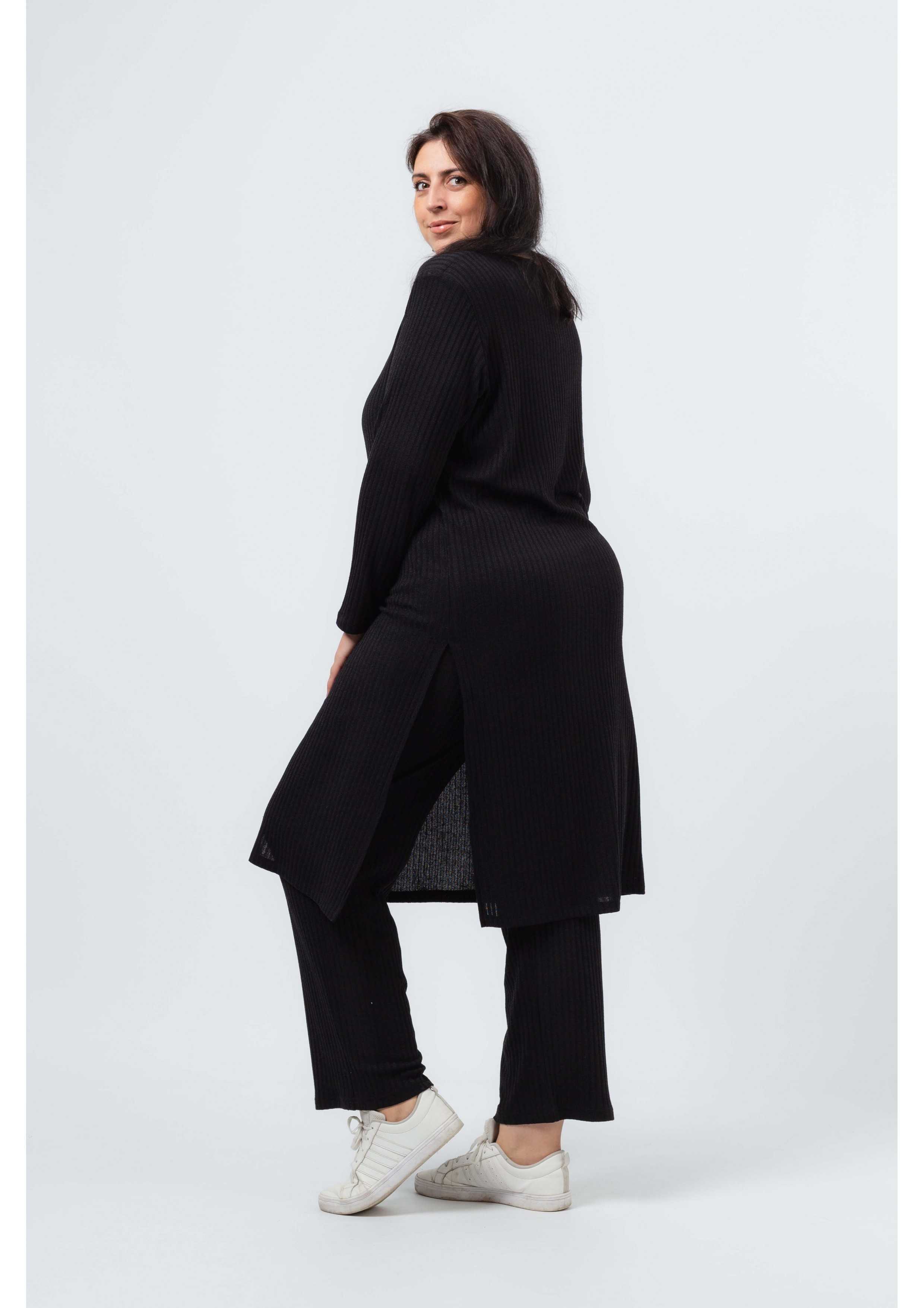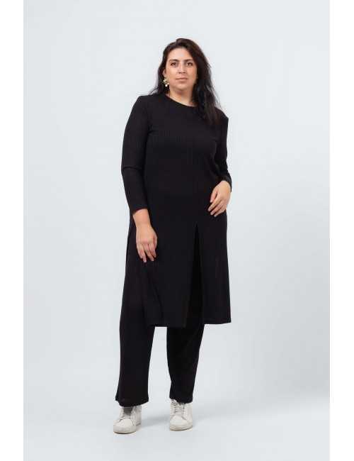 Conjunto em malha lisa, calça a direito elástico na cintura, túnica comprida ombreiras, rachas laterais e na frente. Coleção: Outono Inverno Modelo: Altura 1.70m e está a vestir o tamanho 2XL. |