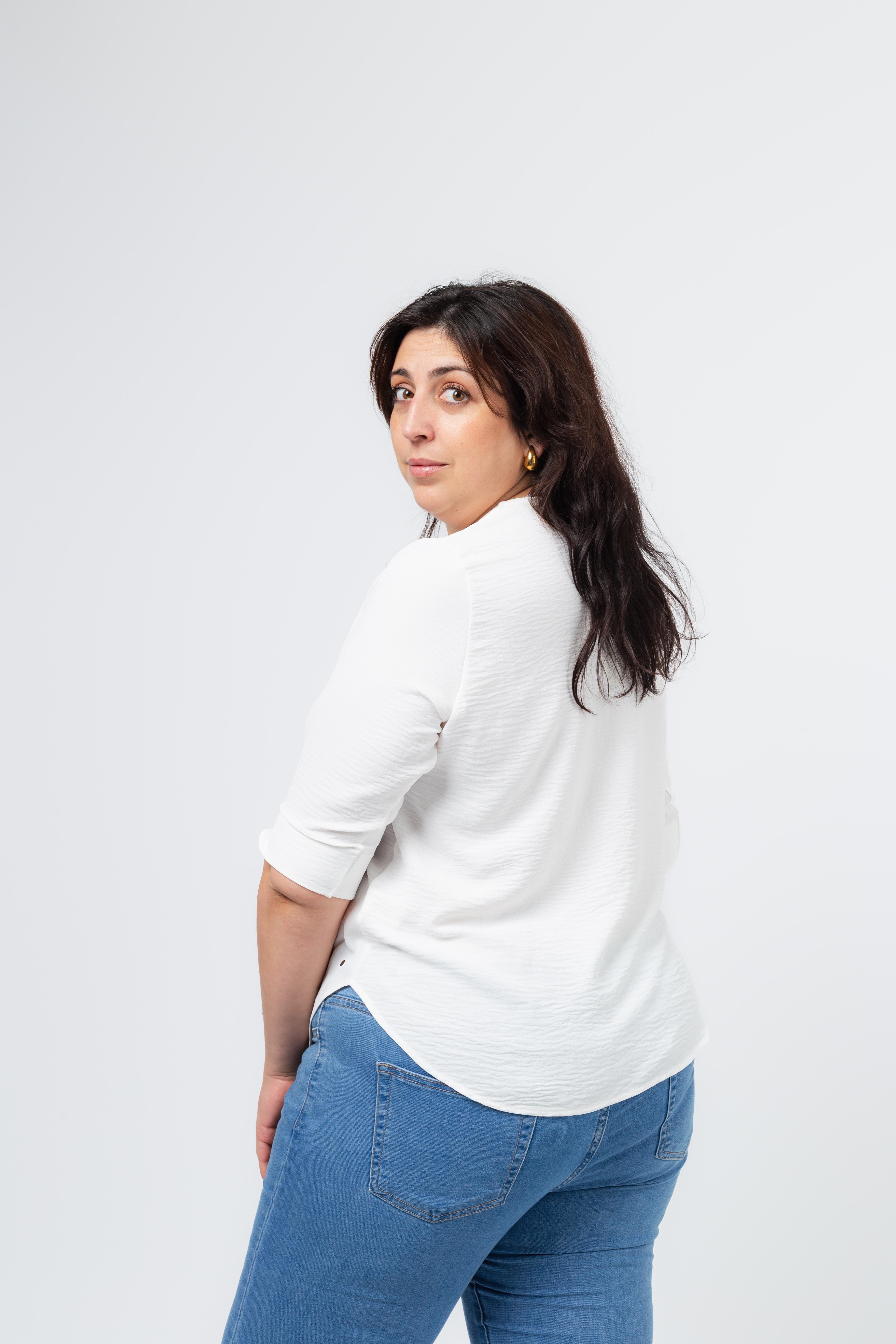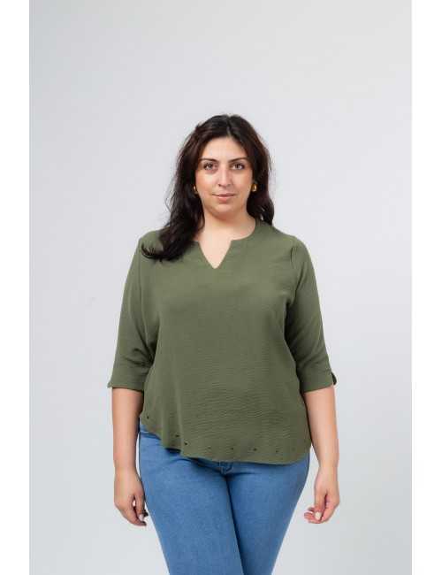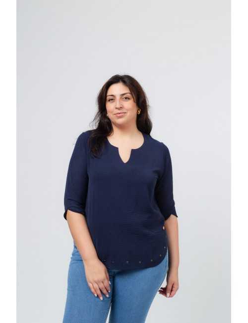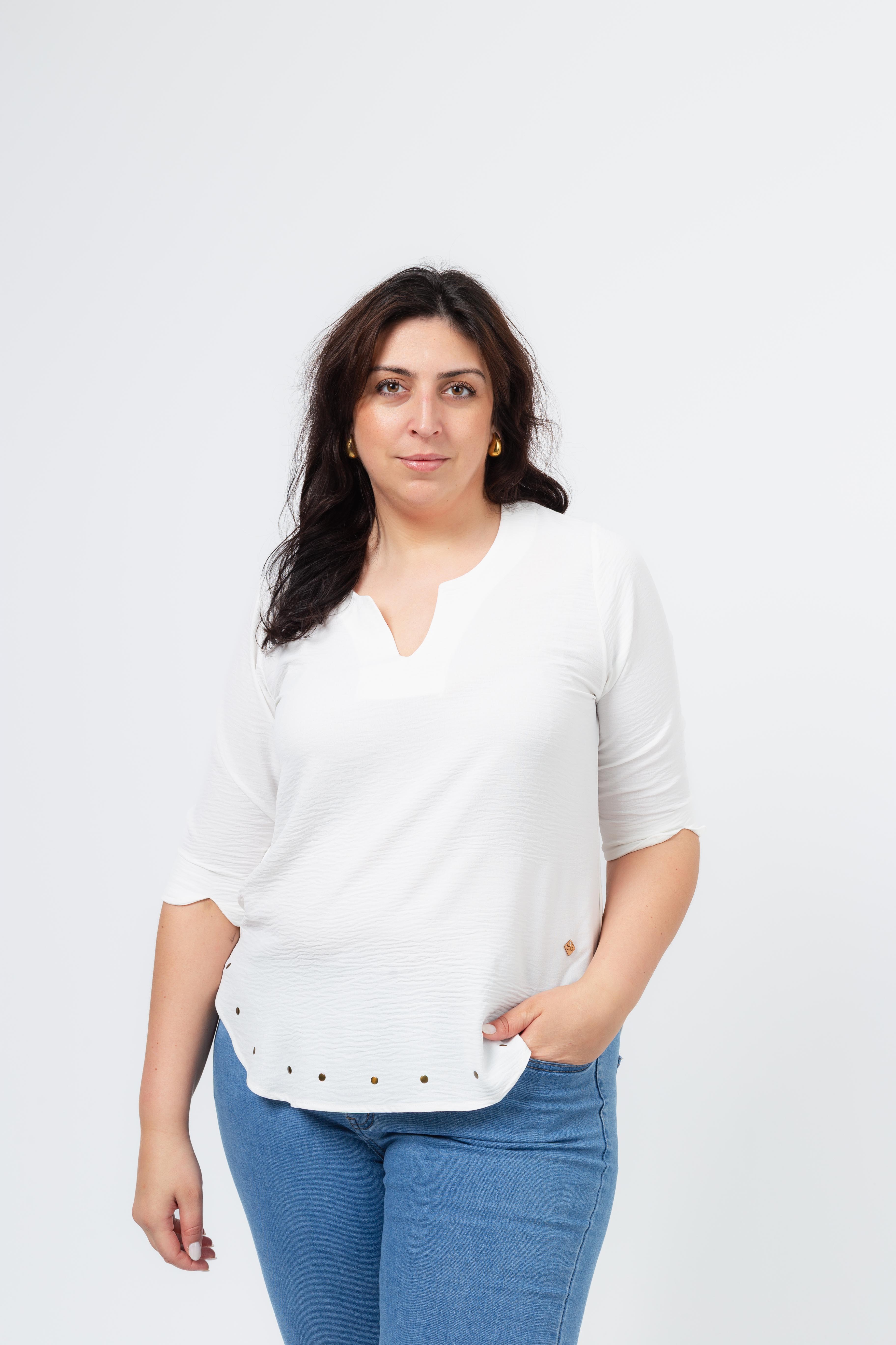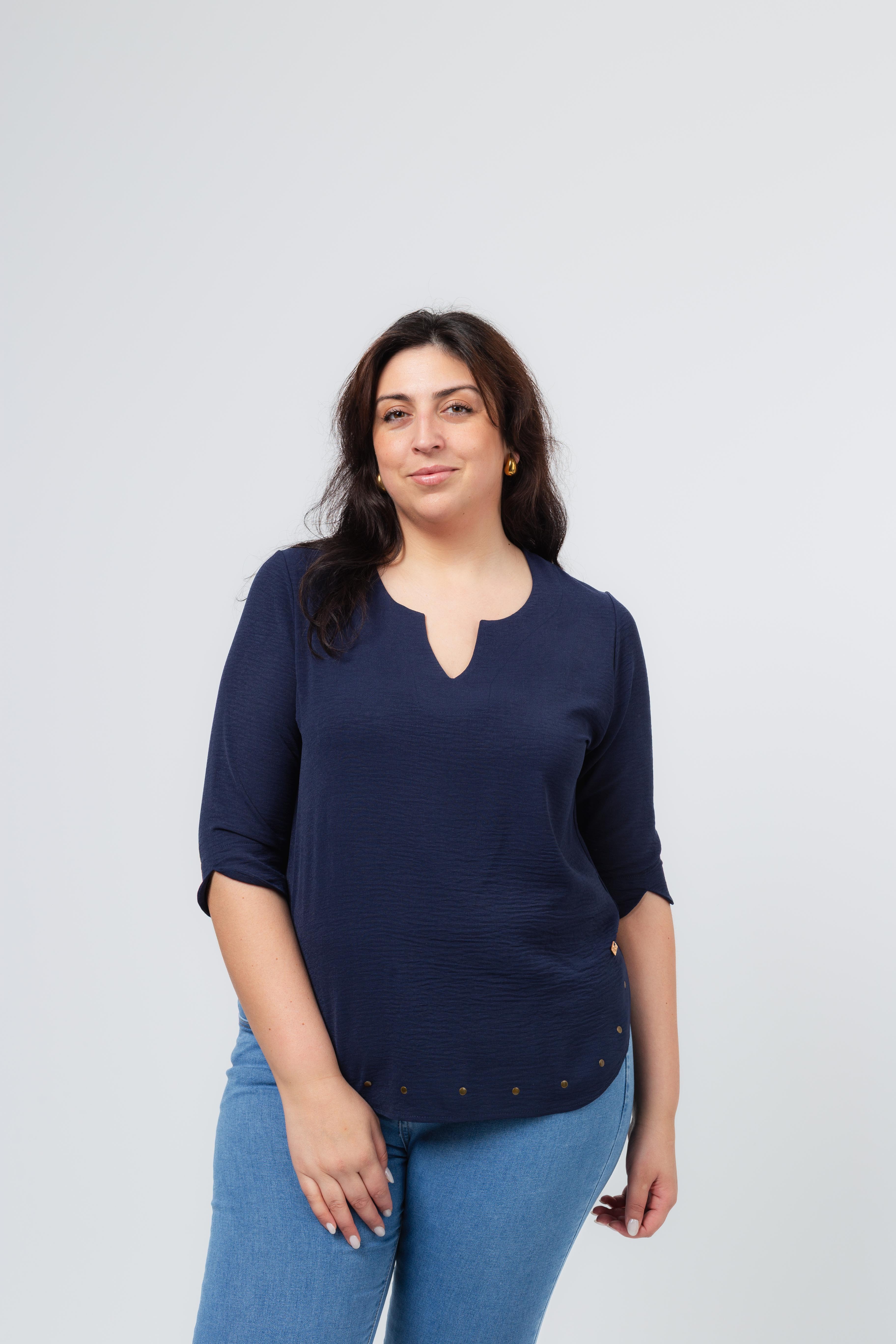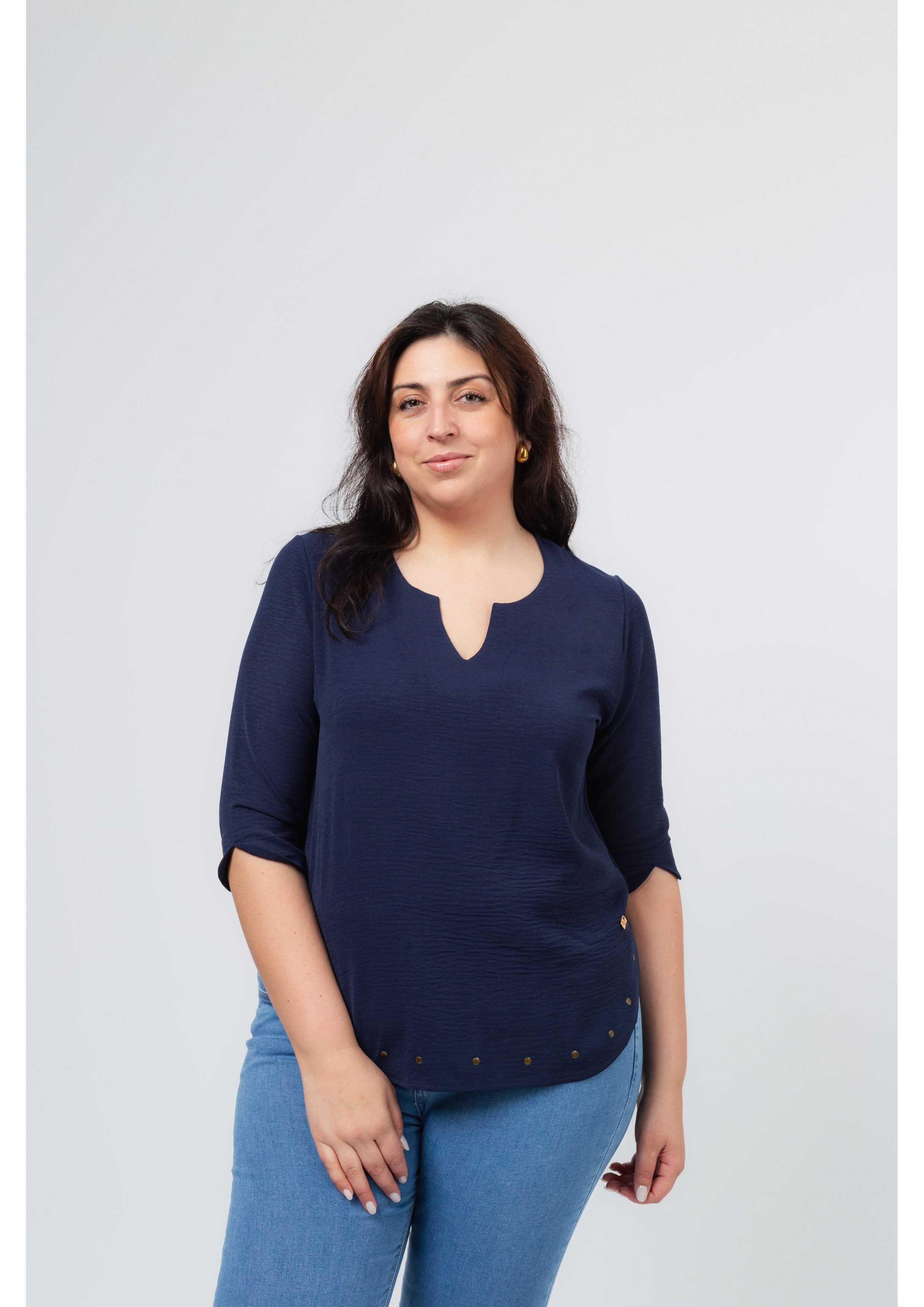 Túnica em tecido liso, manga 3/4 com punho e racha exterior. Decote redondo com abertura em lágrima. Base arredondada com aplicação de tachas na frente. Modelo: Altura 1.82m e está a vestir o tamanho 3XL.
