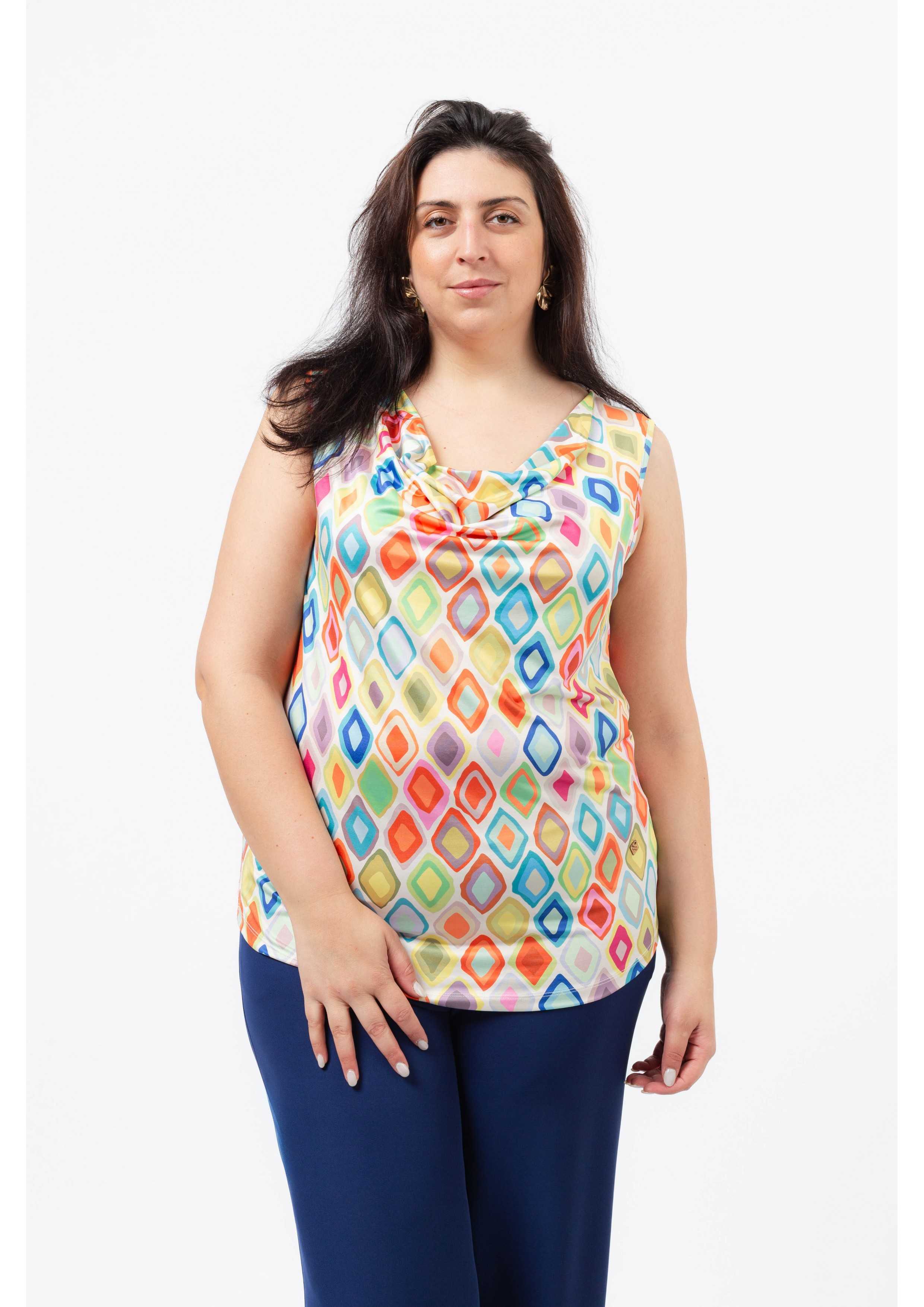 Top em malha estampada, decote drapeado, base arredondada. Disponível em Tamanhos Grandes Produto de desenho e fabrico próprio. Somos uma marca de confeção de vestuário com mais de 50 anos de experiência Modelo: Altura 1.82m e está a vestir o tamanho 3XL.