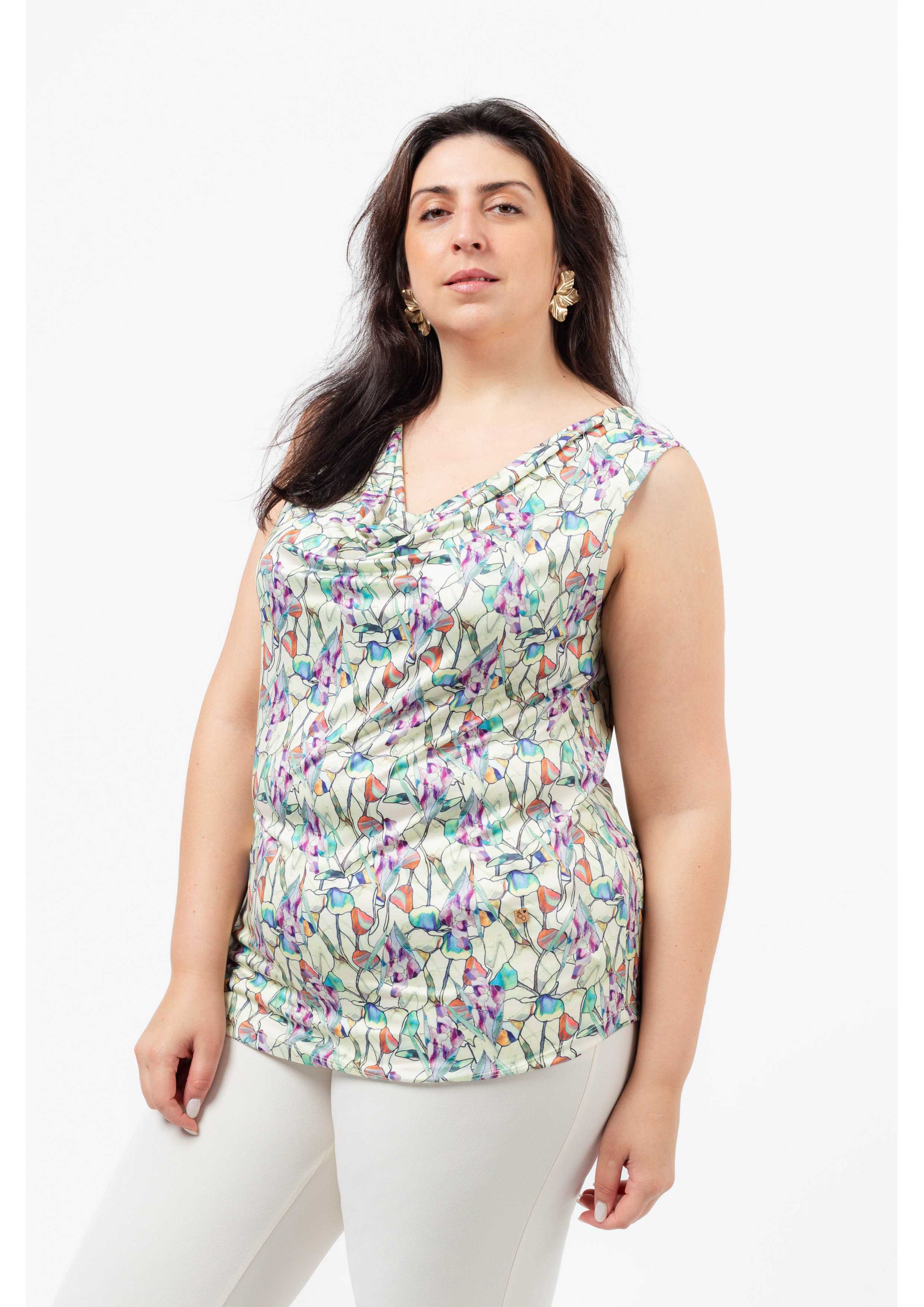 Top em malha estampada, tons verde, decote drapeado, base arredondada.