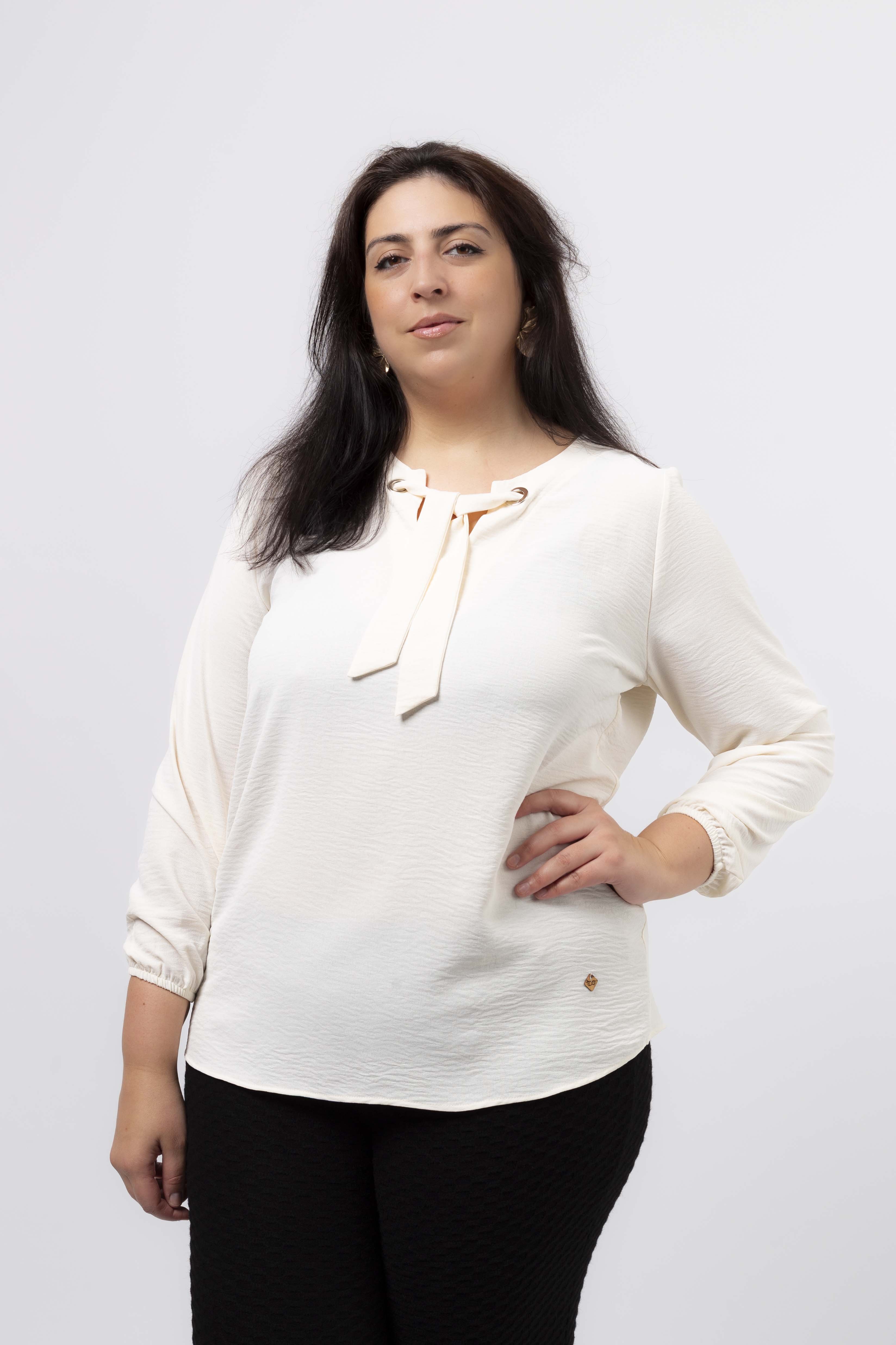 Blusa em tecido liso, manga comprida com elástico no fundo. Corte a direito. Decote redondo com carcela em lágrima, com 2 ilhós e laçada. Disponível em Tamanhos Grandes Produto de desenho e fabrico próprio. Somos uma marca de confeção de vestuário com mais de 50 anos de experiência Modelo: Altura 1.73m e está a vestir o tamanho 4XL.