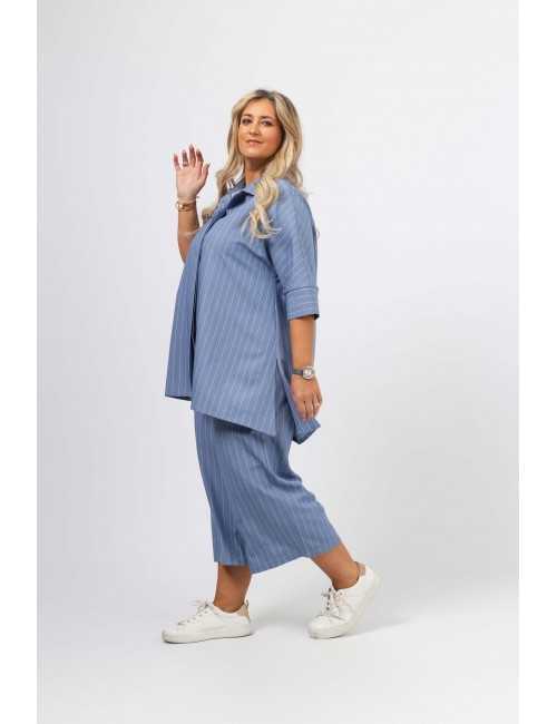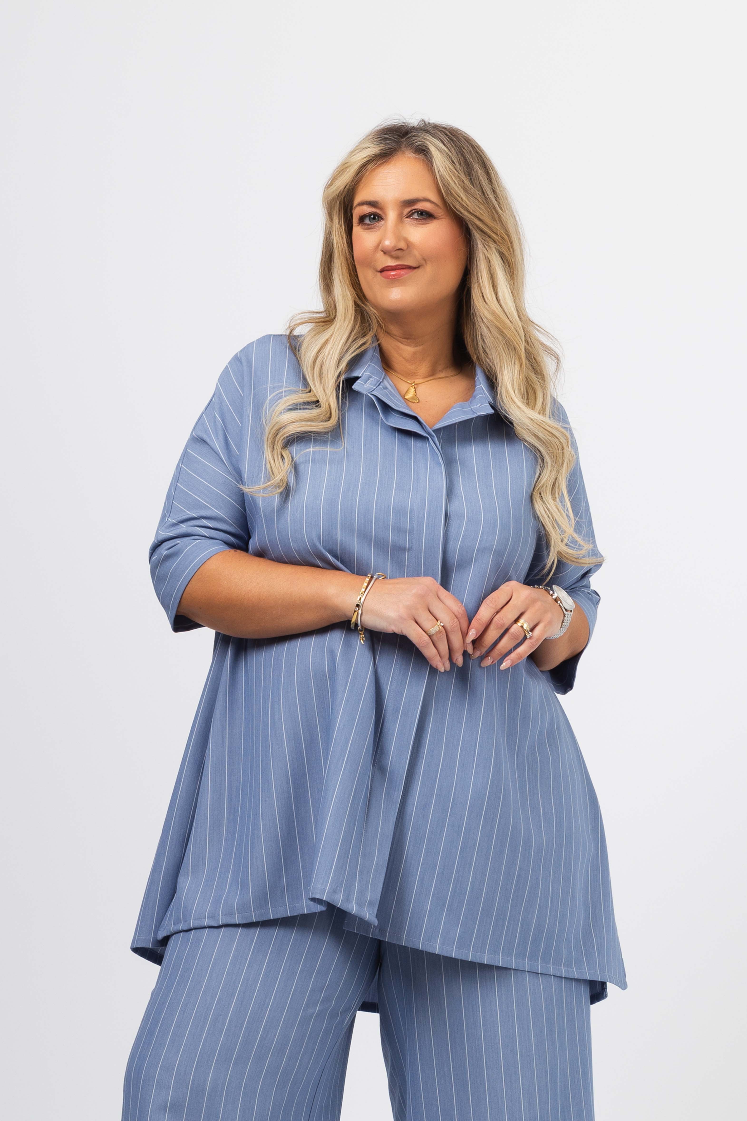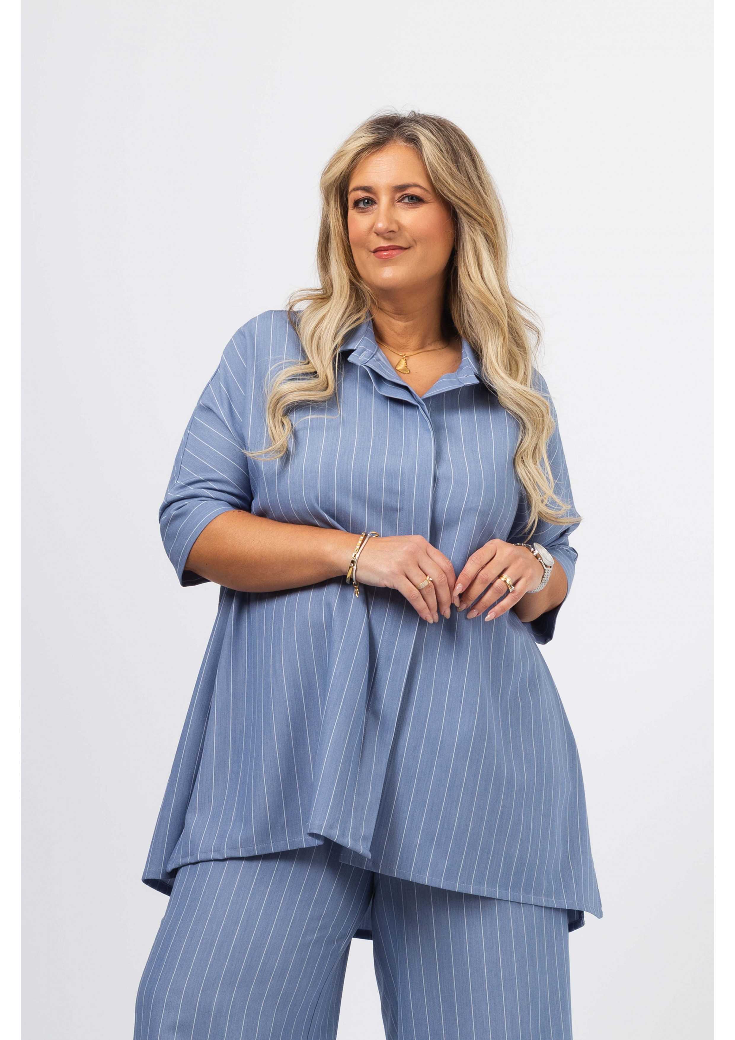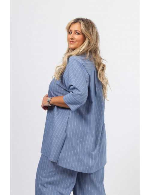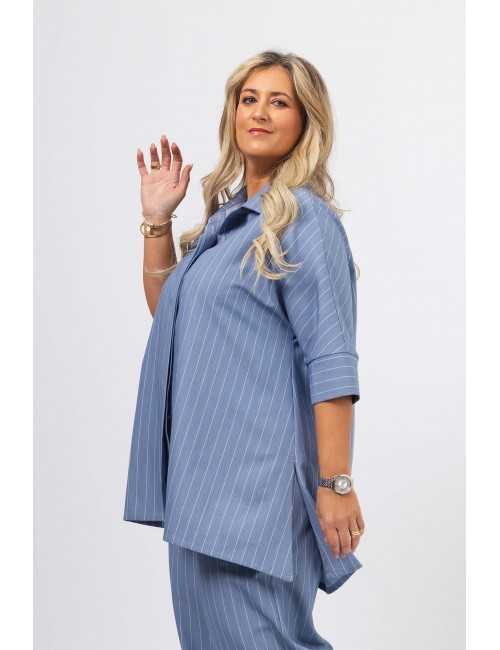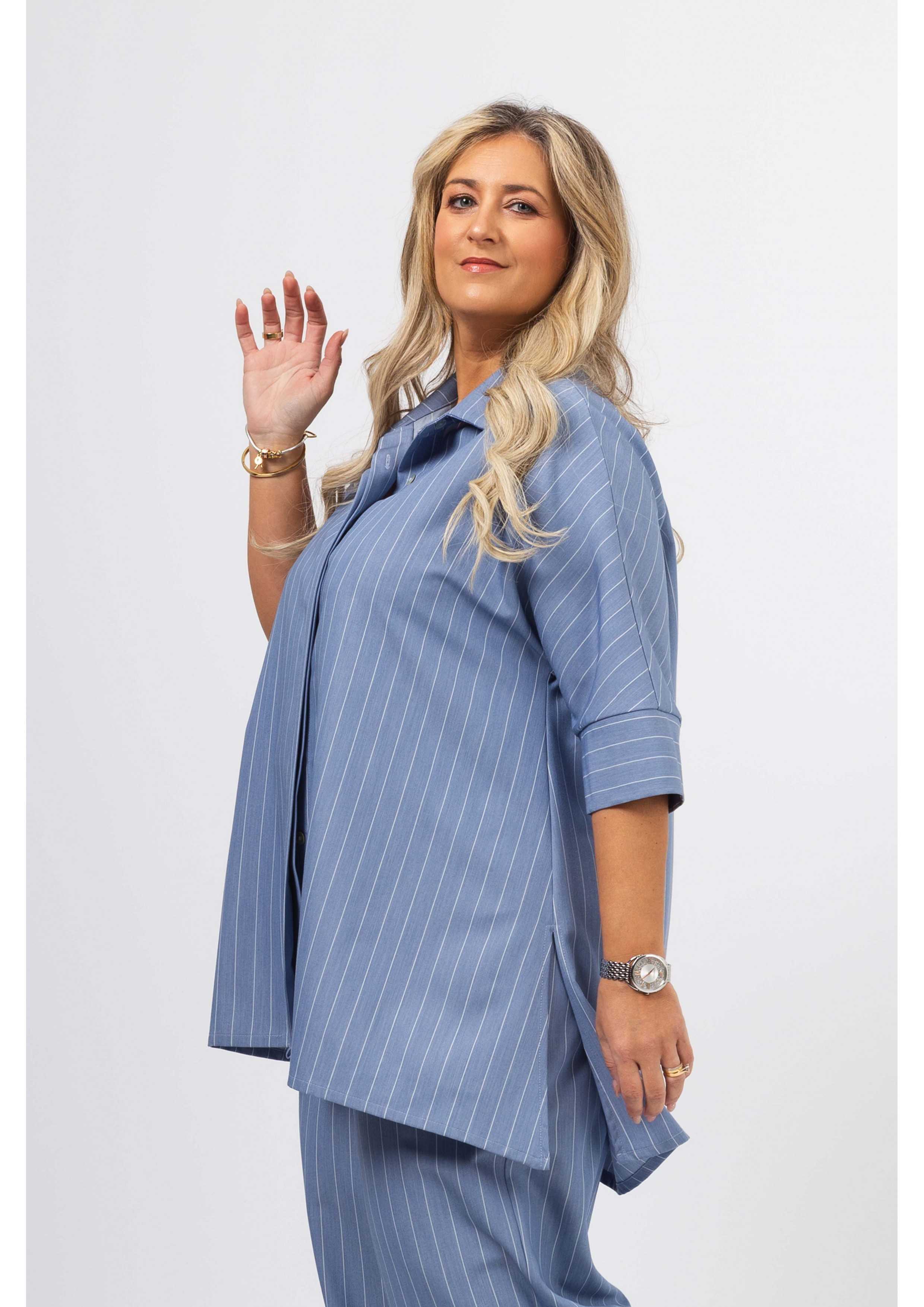 Blusa em tecido liso com risca vertical. Modelo evasé com rachas altas na lateral, Carcela escondida. Escapulário e macho nas costas. Manga 3/4 com punhos fechados.
