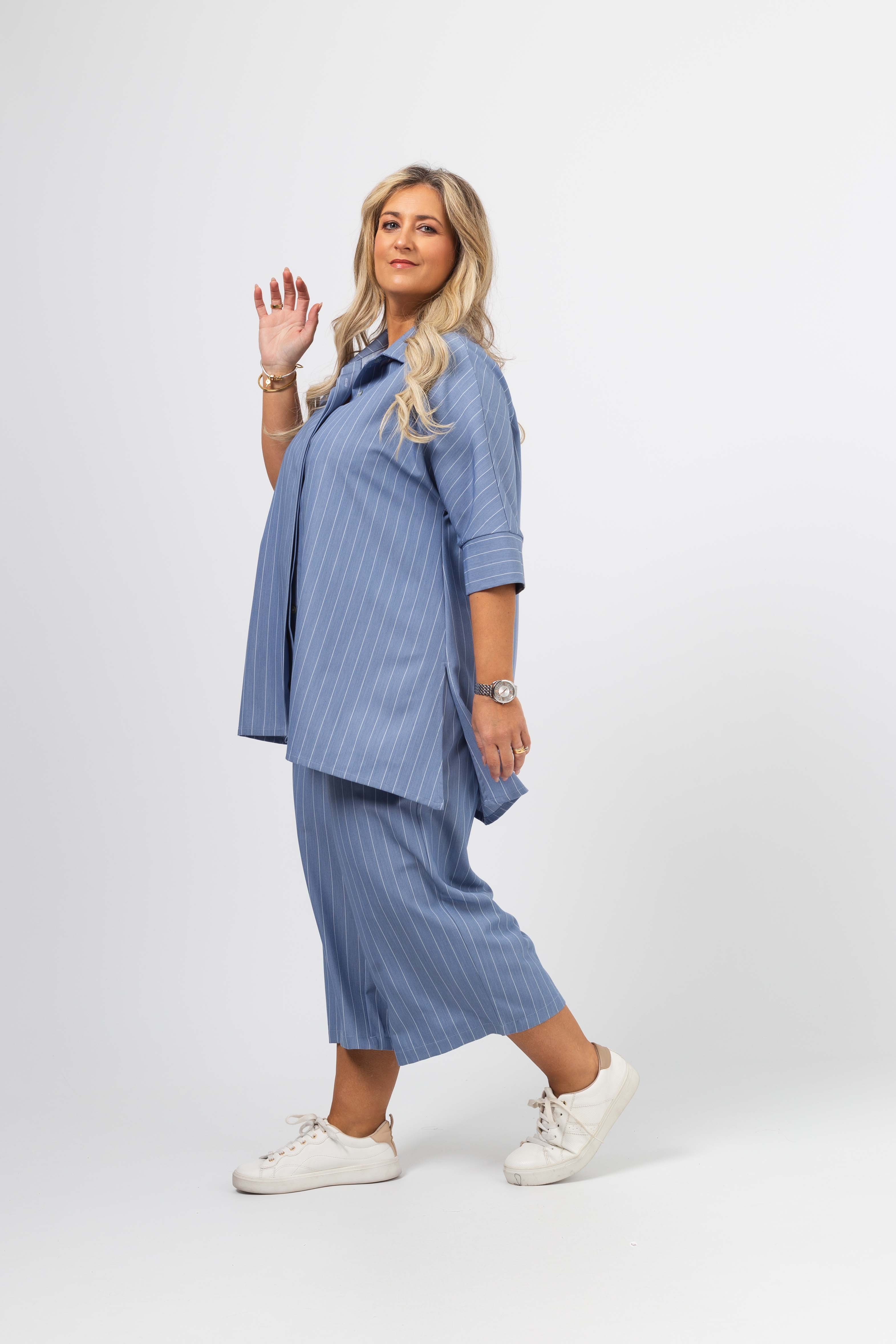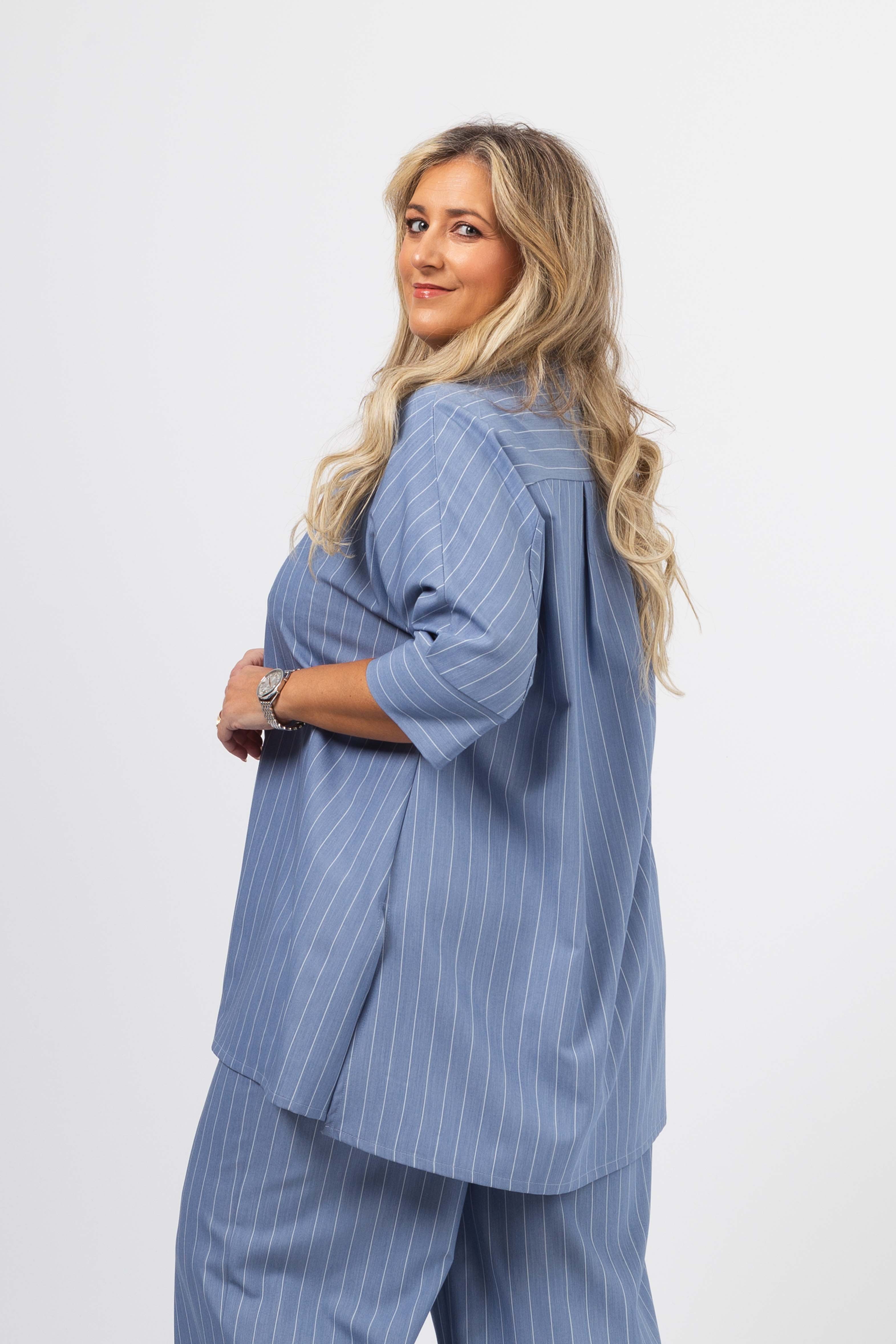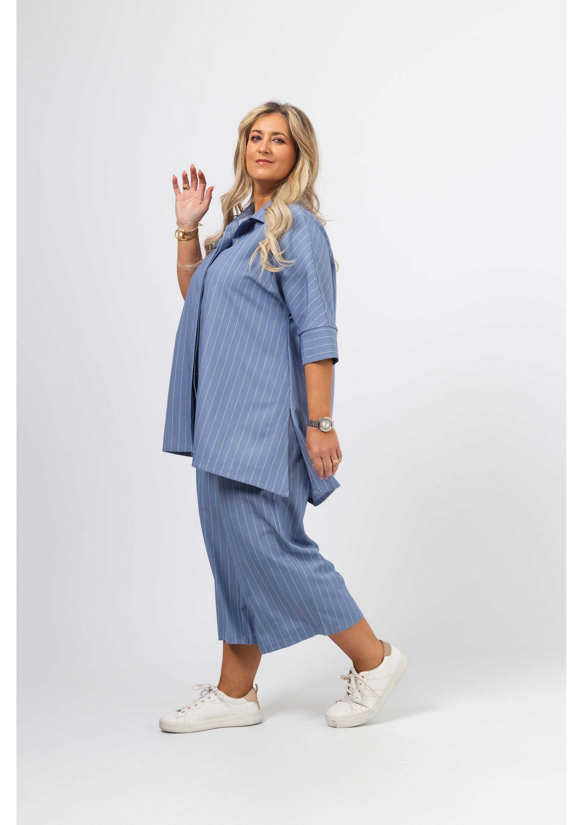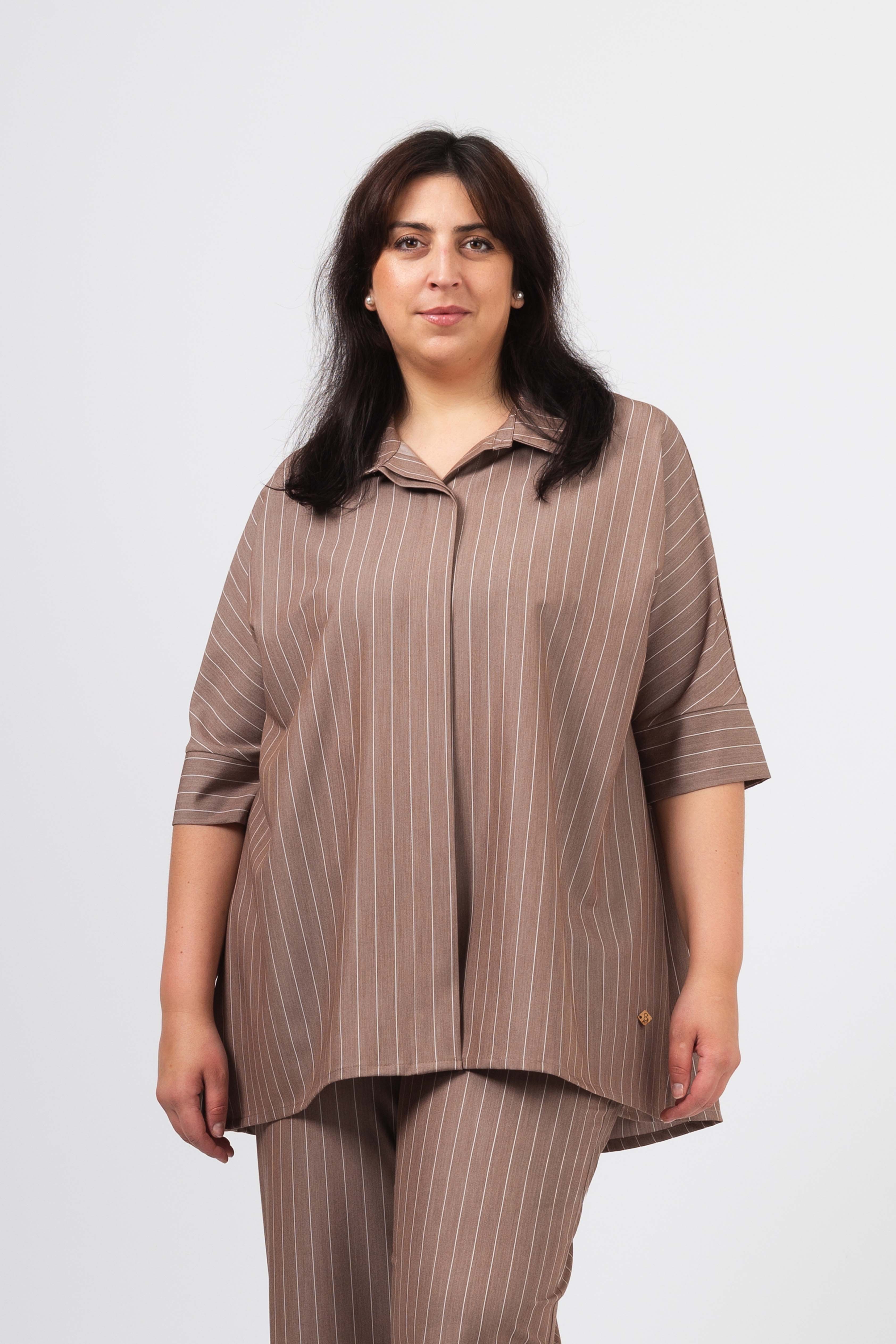 Blusa em tecido liso com risca vertical. Modelo evasé com rachas altas na lateral, Carcela escondida. Escapulário e macho nas costas. Manga 3/4 com punhos fechados.