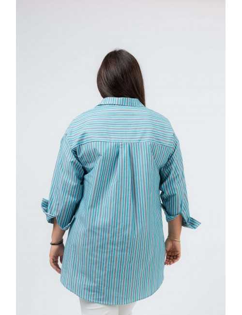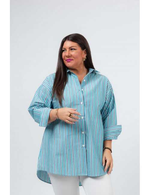 Blusa em tecido risca vertical, tons turquesa, manga comprida, colarinho e pé de gola, modelo evasé. Disponível em Tamanhos Grandes Produto de desenho e fabrico próprio. Somos uma marca de confeção de vestuário com mais de 50 anos de experiência