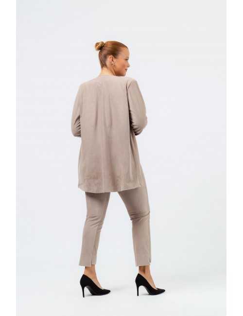 Calça em tecido liso, tipo pele de pêssego, vincadas com rachas laterais e elástico cravado na cintura