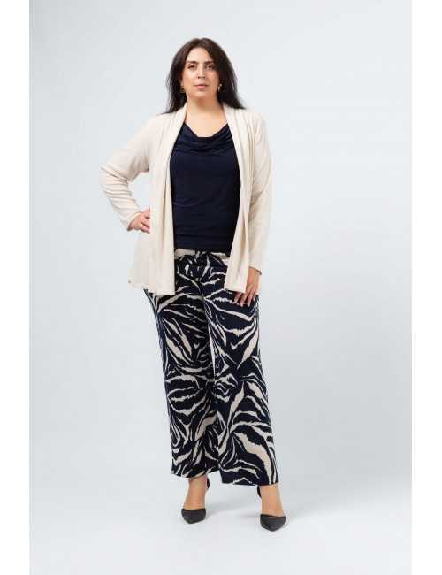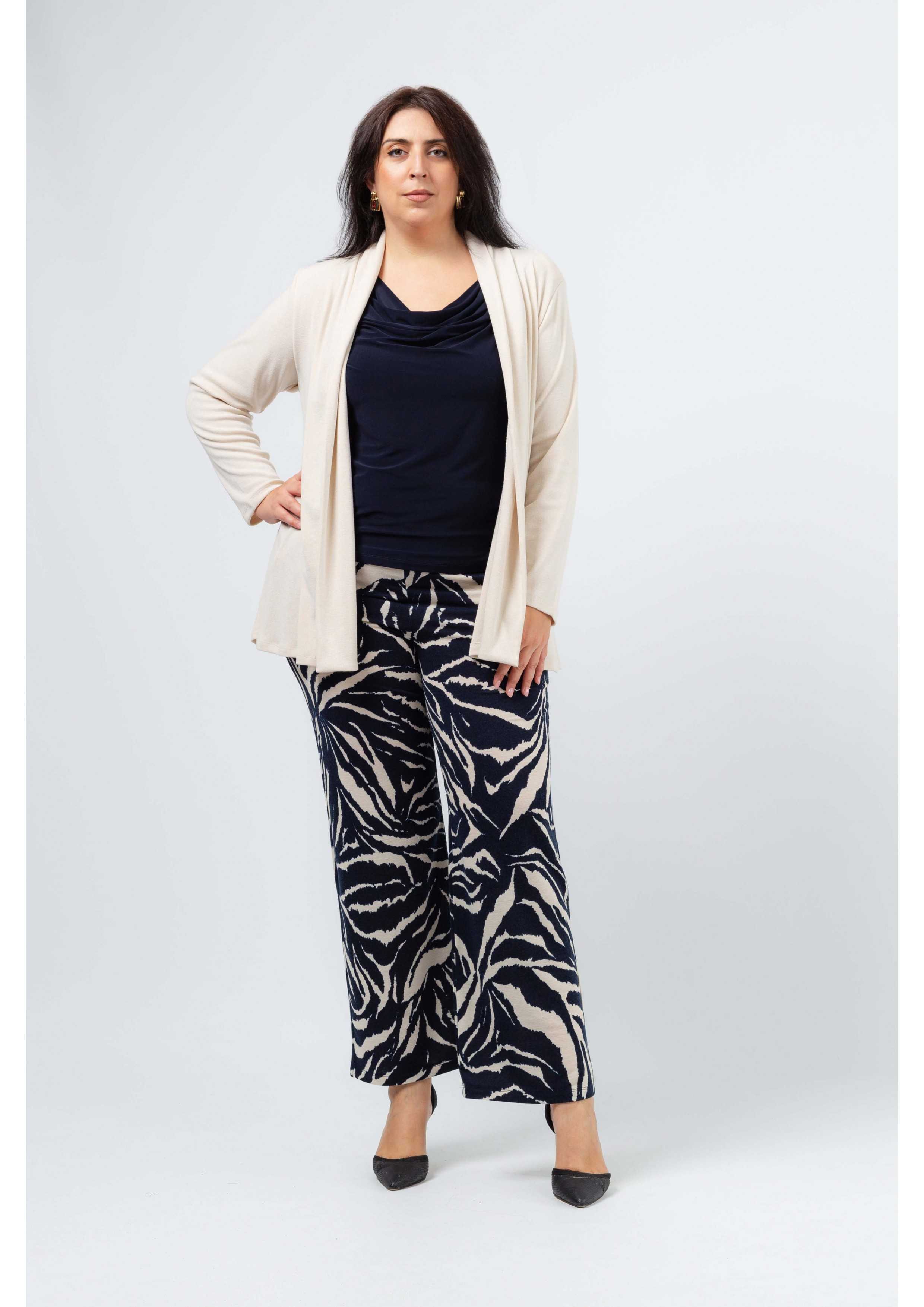 Calça em malha estampada marinho, base larga com corte a direito. elástico aplicado na cintura. Bolsos laterais. Disponível em Tamanhos Grandes Produto de desenho e fabrico próprio. Somos uma marca de confeção de vestuário com mais de 50 anos de experiência Modelo: Altura 1.73m e está a vestir o tamanho 3XL.