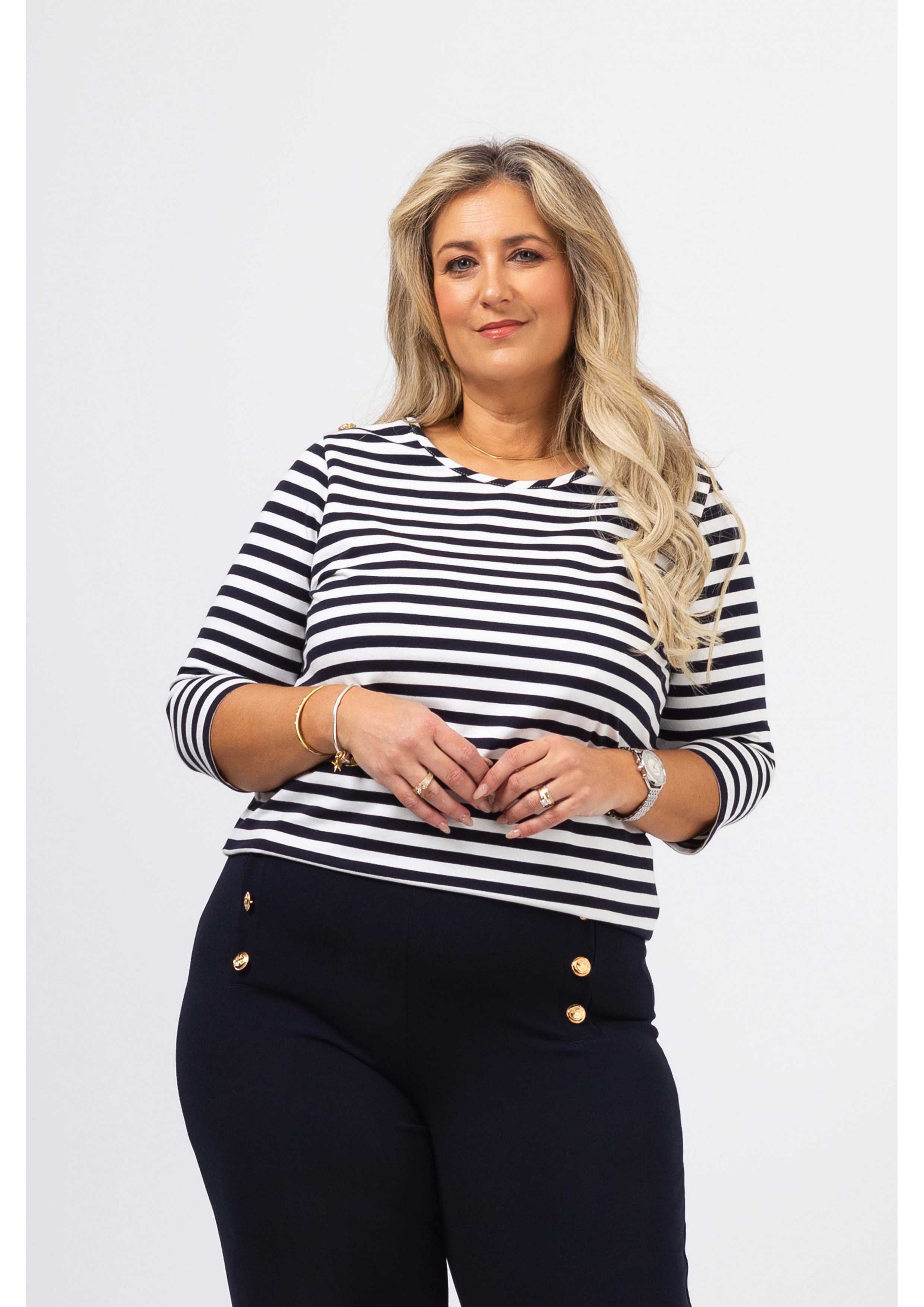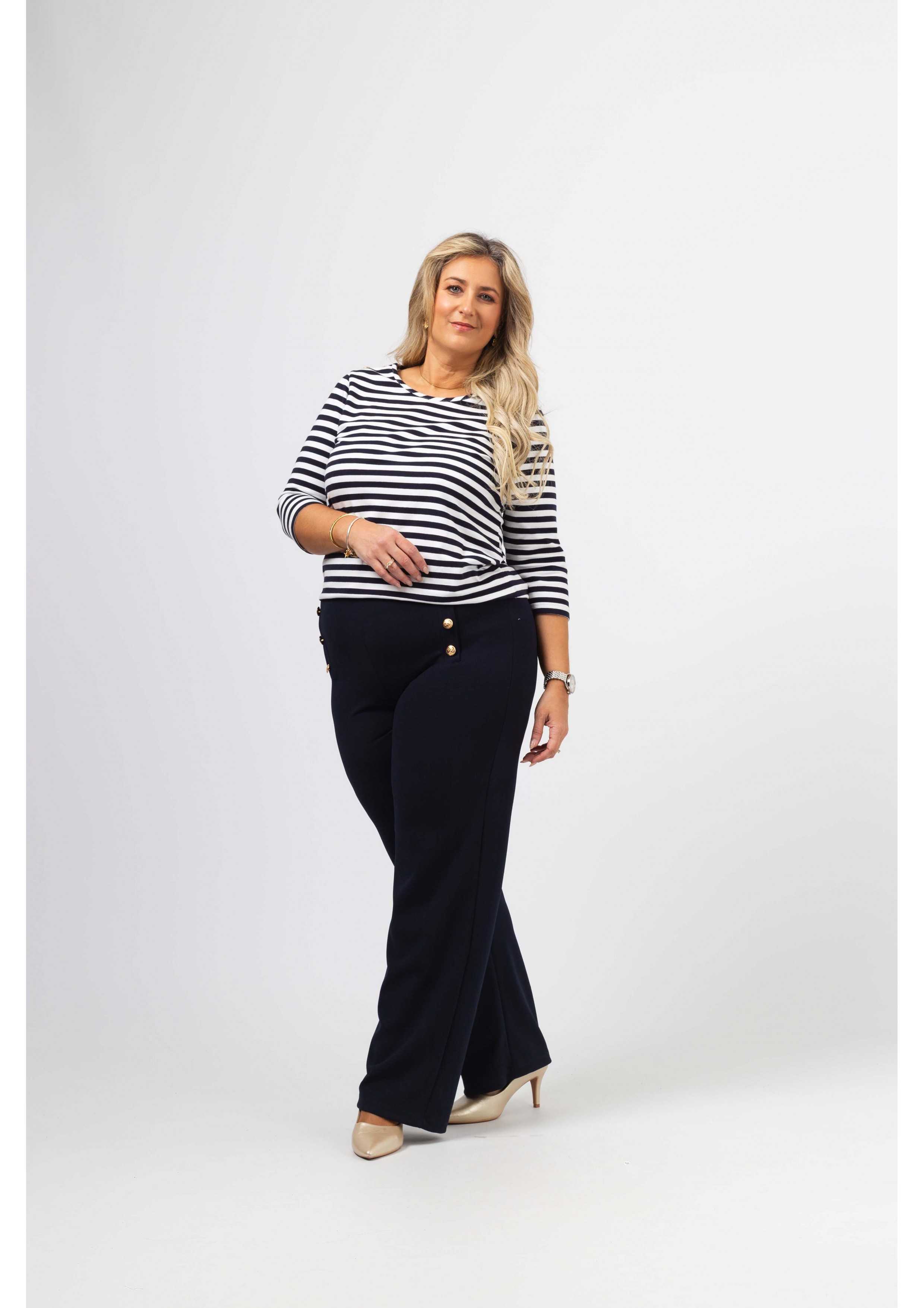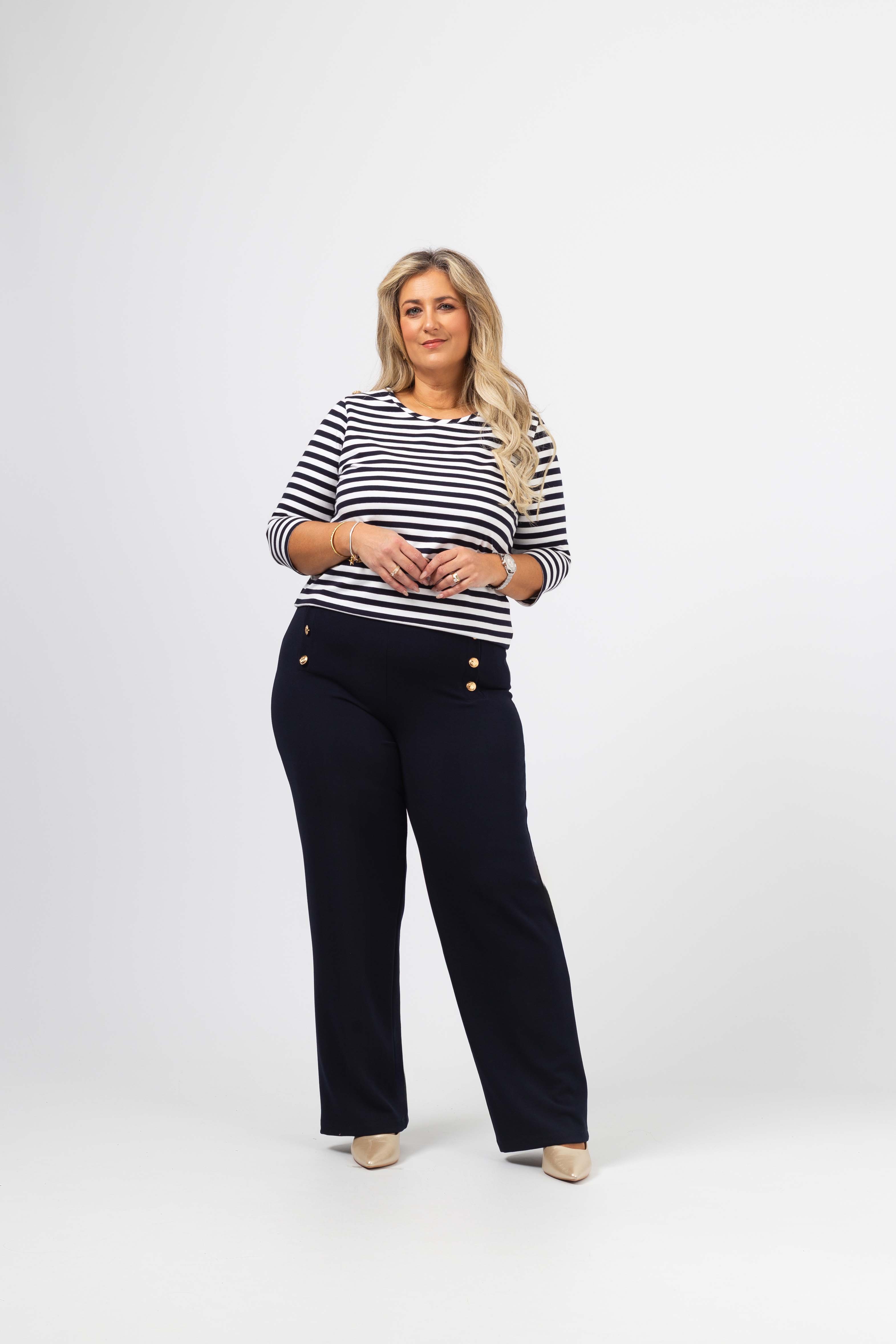 Calça em tecido liso, com elasticidade. Cinto com elástico. Imitação de duas carcelas na frente lateral com aplicação de botões motivo marinheiro. Corte a direito.