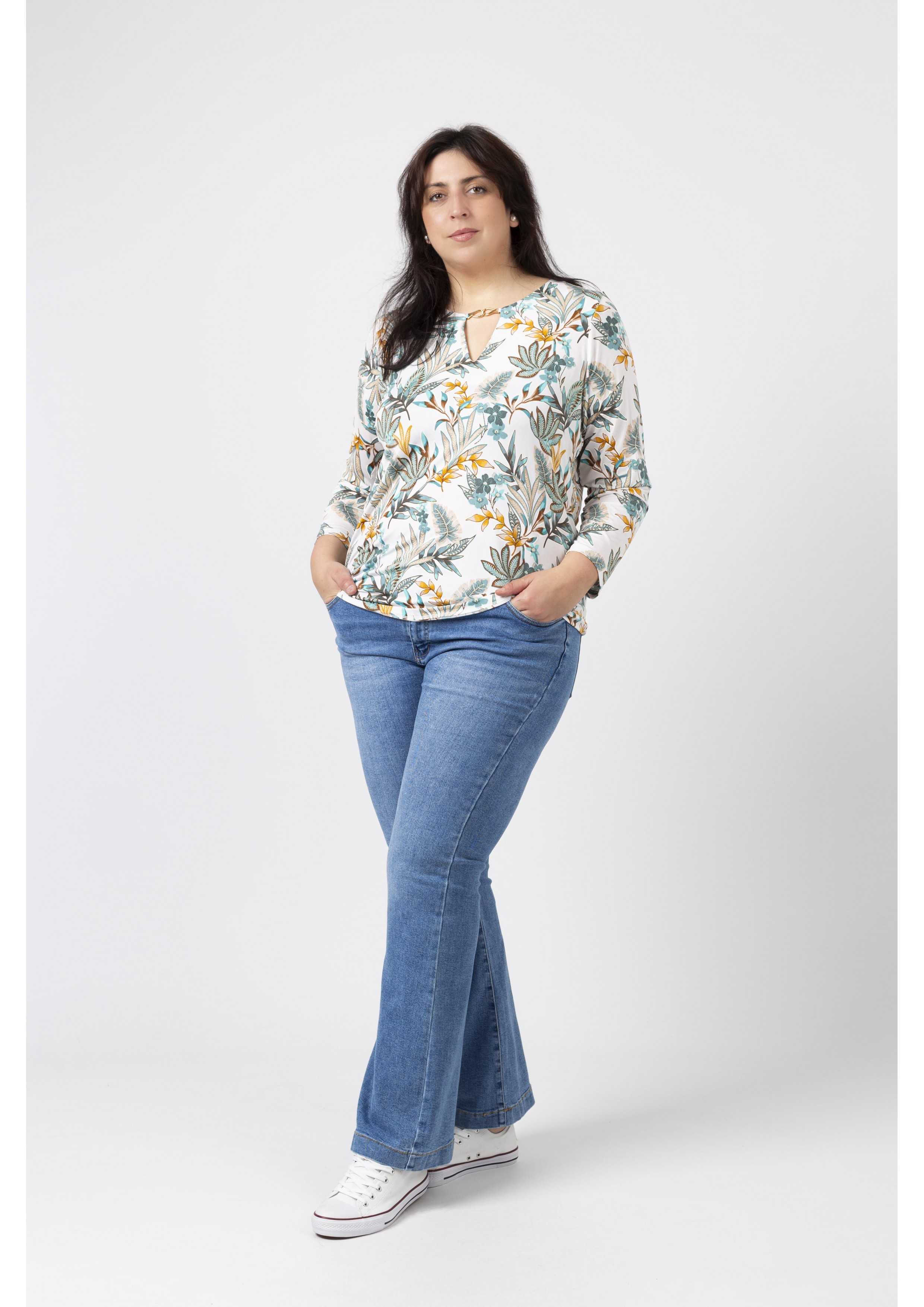 Calça de ganga boca de sino. Disponível em Tamanhos Grandes Somos uma marca de confeção de vestuário com mais de 50 anos de experiência Modelo: Altura 1.82m e está a vestir o tamanho 48. Composição: |