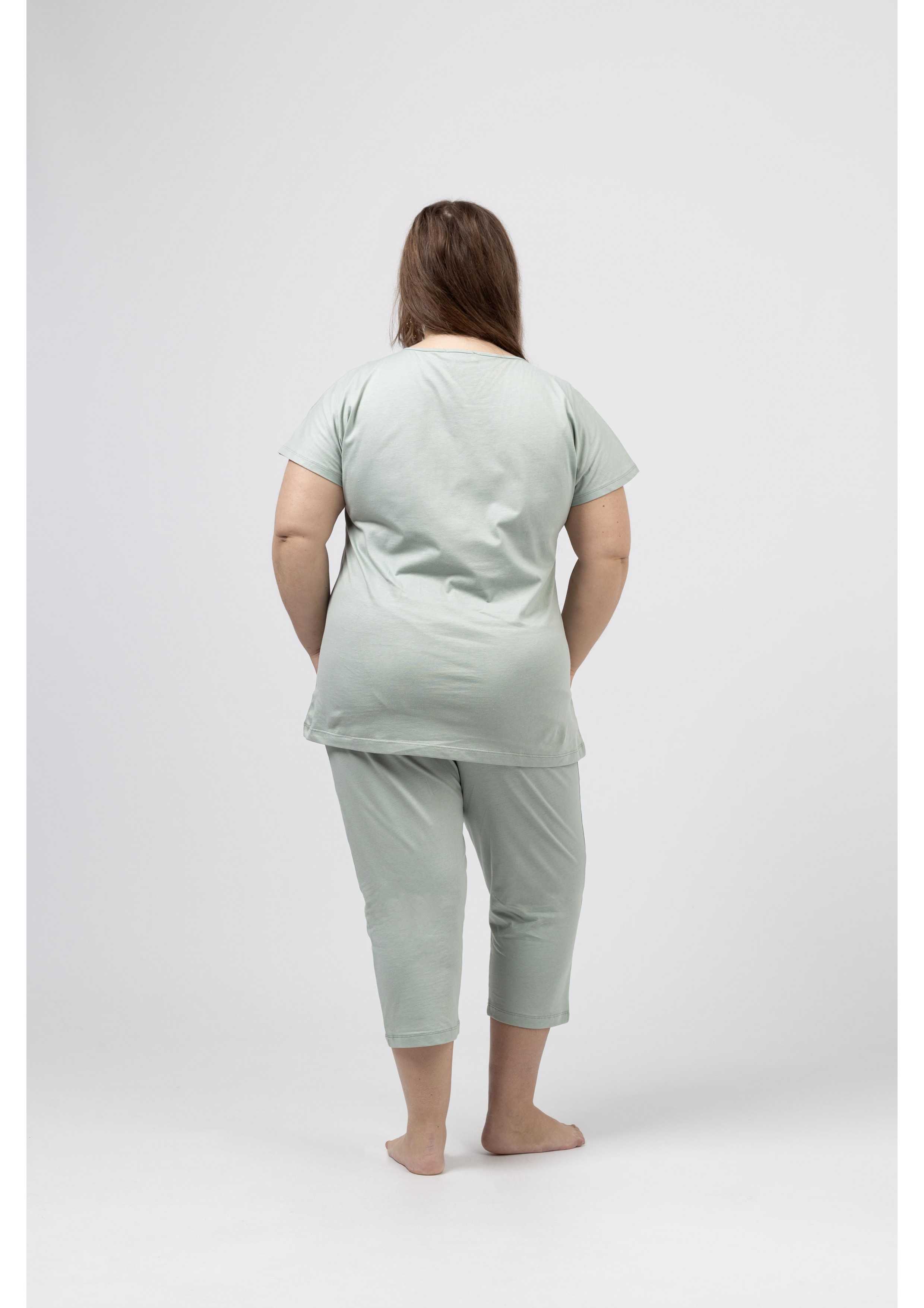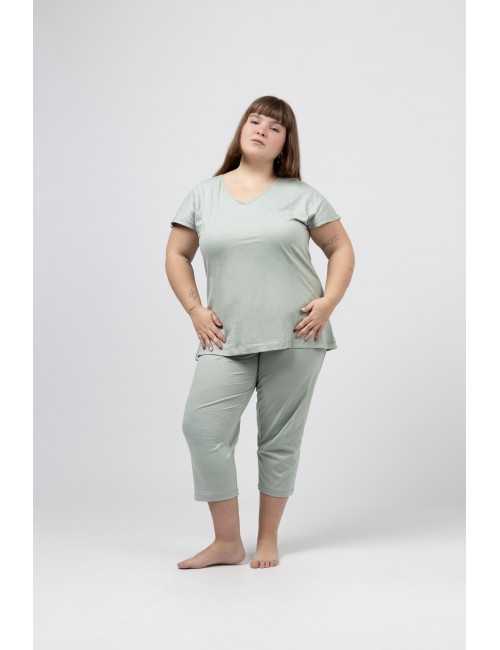 Pijama em malha lisa, camisola decote em bico ombros caídos. Corsário com elástico na cintura recoberto. Modelo: Altura 1.70m e está a vestir o tamanho 2XL. |