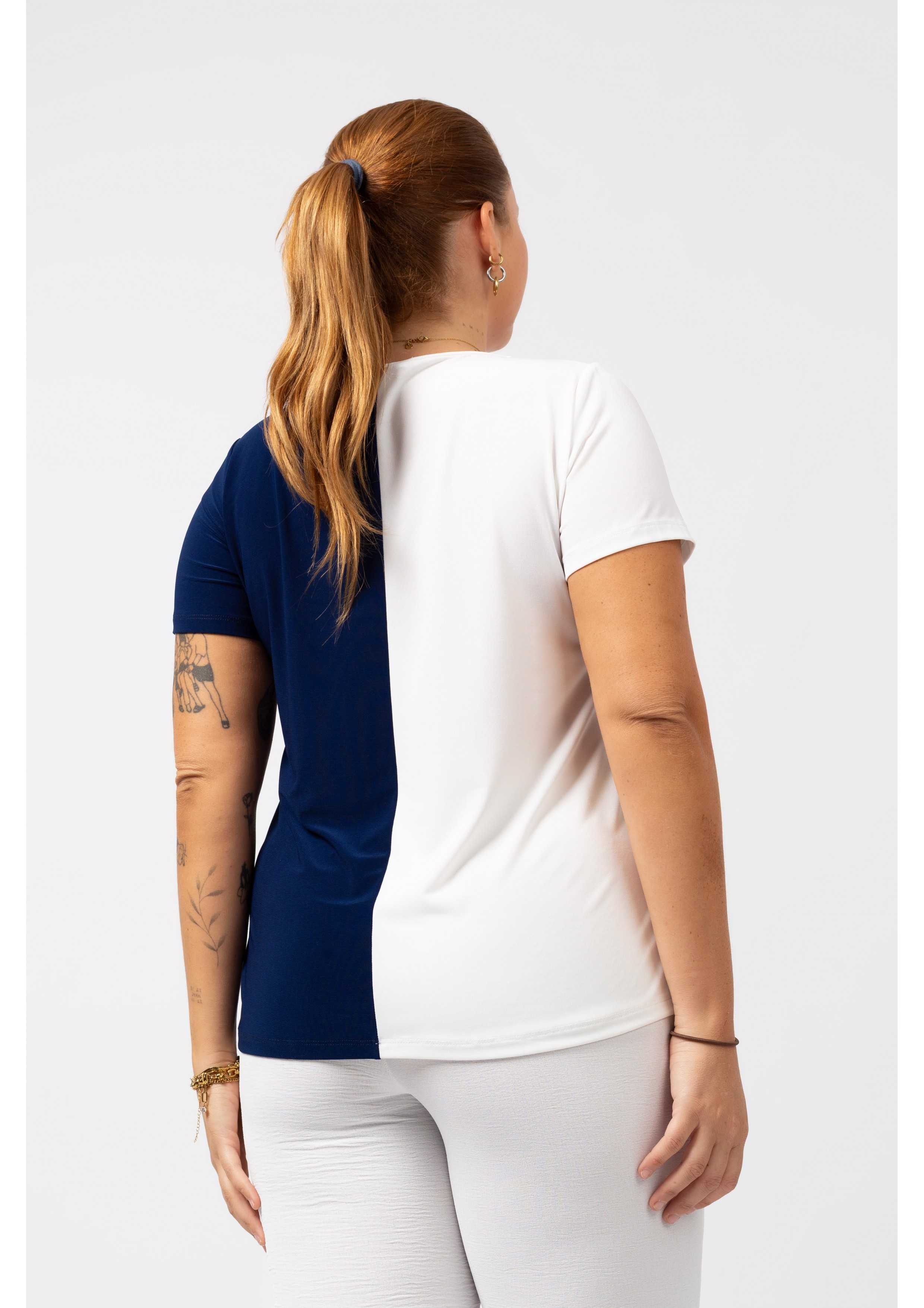 Camisola em malha lisa, com encaixes verticais na frente em malha lurex e etampada. Decote redodondo. Corte na costa.