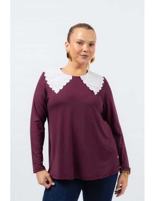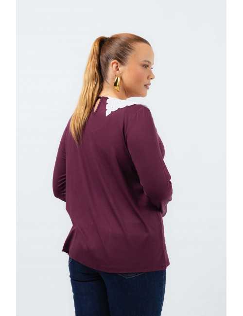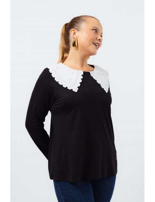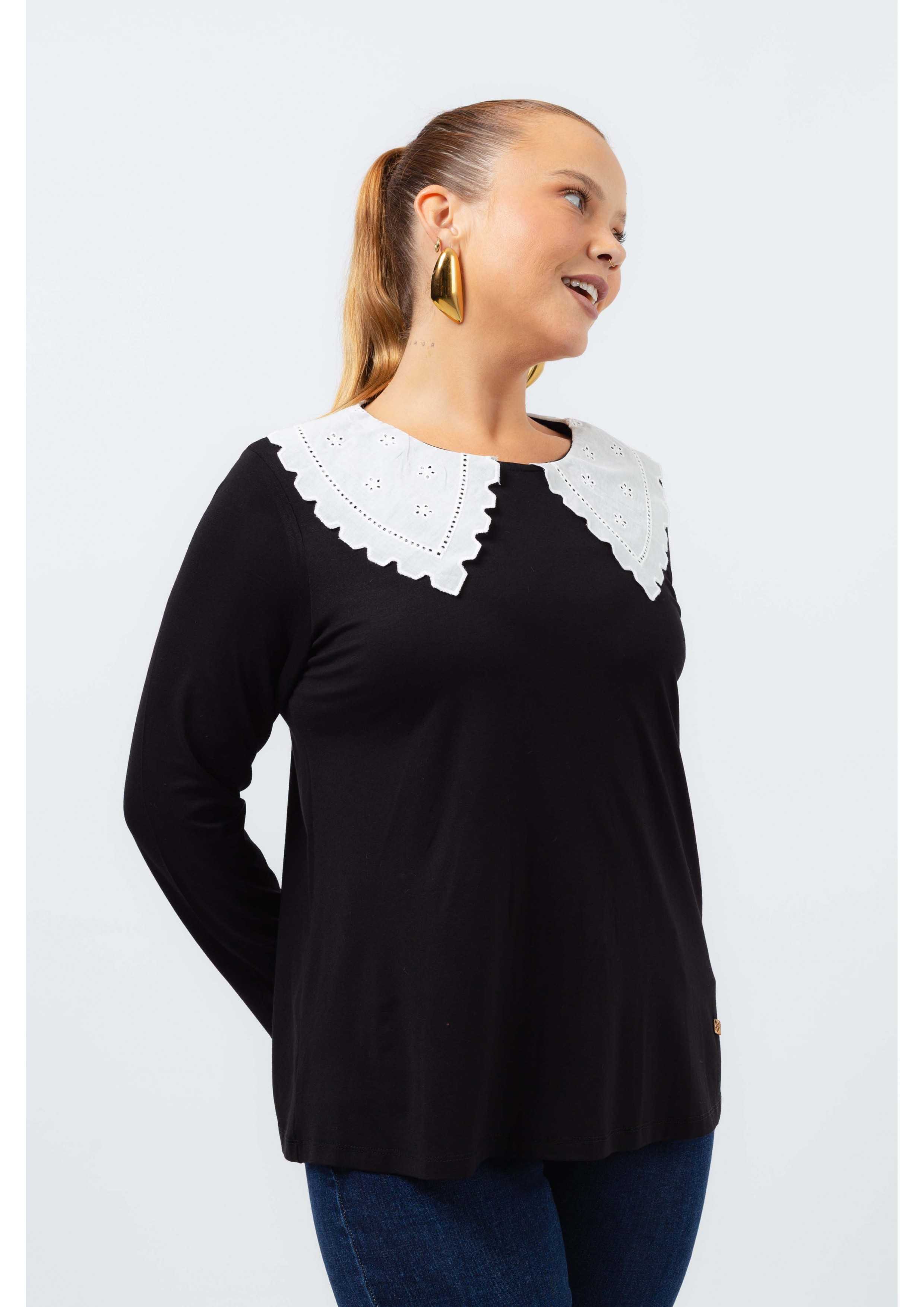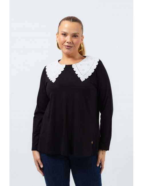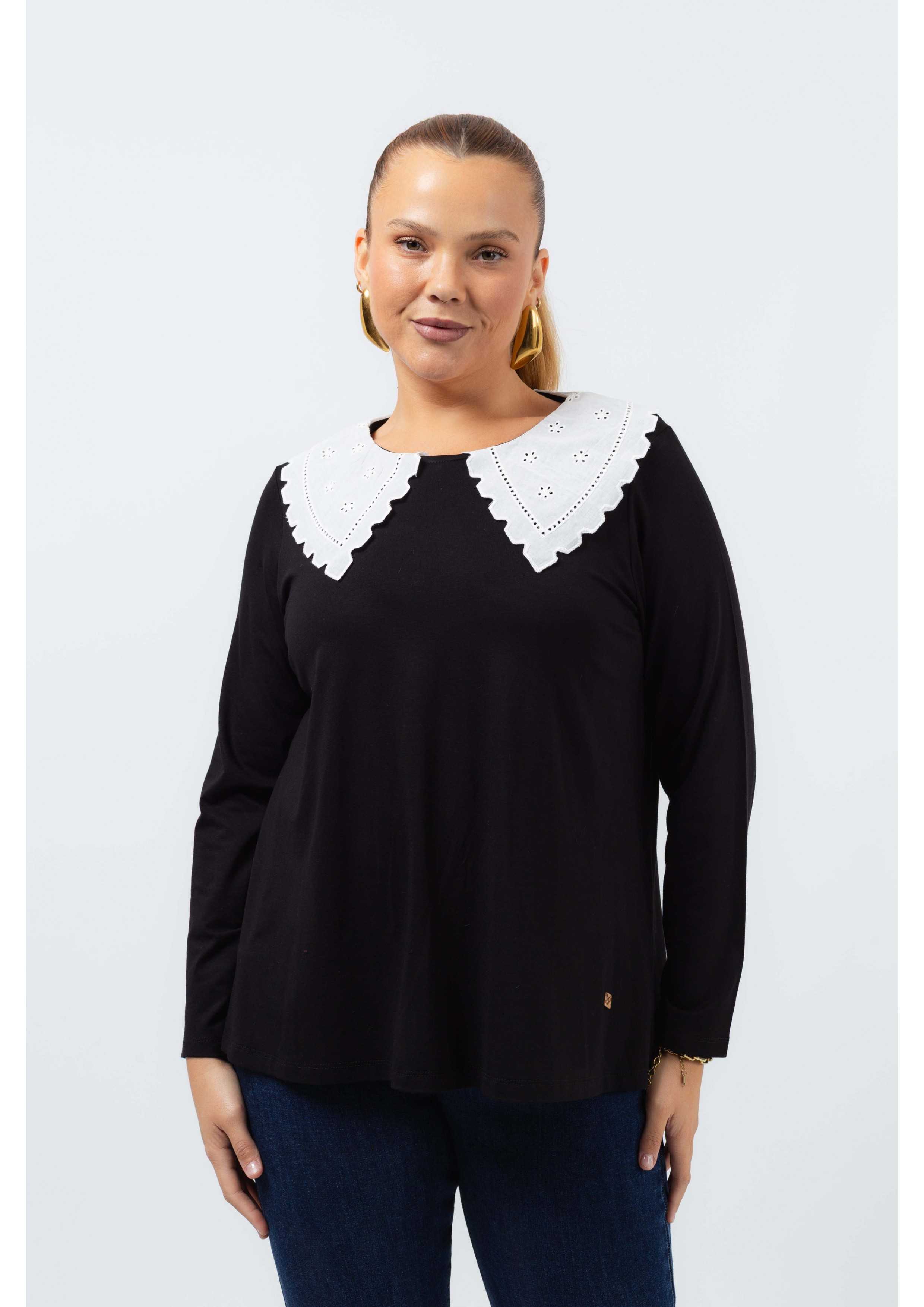 Camisola em malha lisa, manga comprida, decote redondo com aplicação de gola em tecido bordada. Lágrima na costa, aperta com 1 botão. Disponível em Tamanhos Grandes Produto de desenho e fabrico próprio. Somos uma marca de confeção de vestuário com mais de 50 anos de experiência Modelo: Altura 1.70m e está a vestir o tamanho XL.
