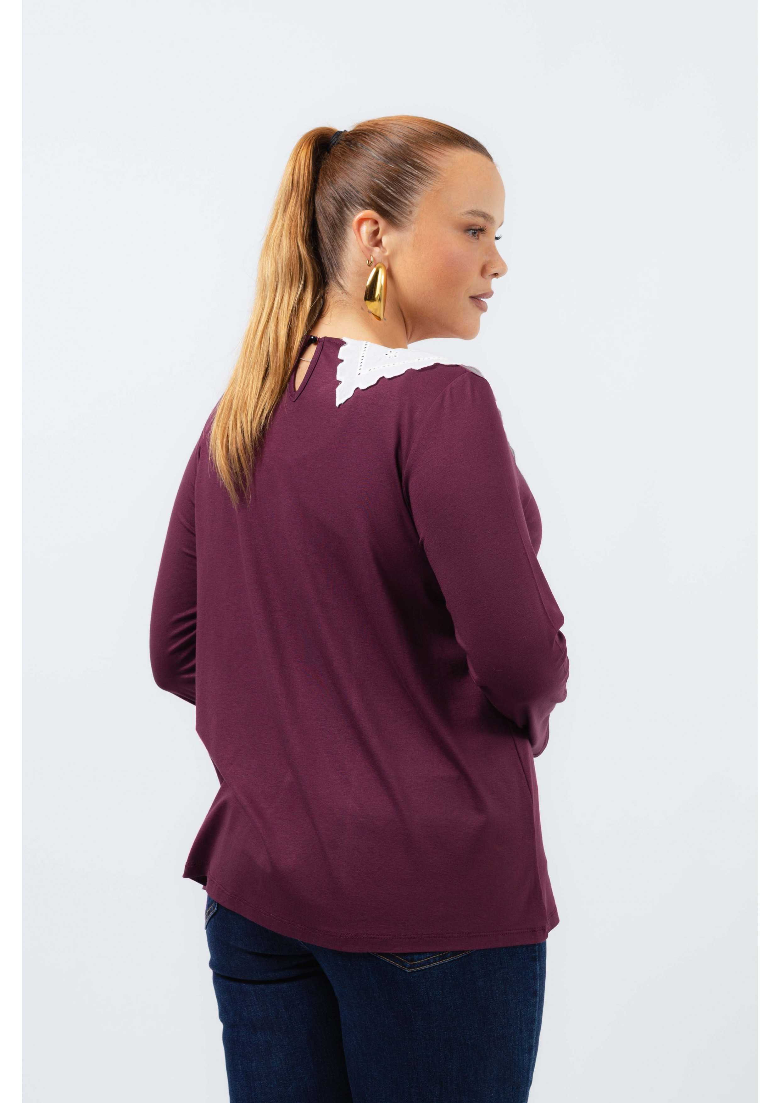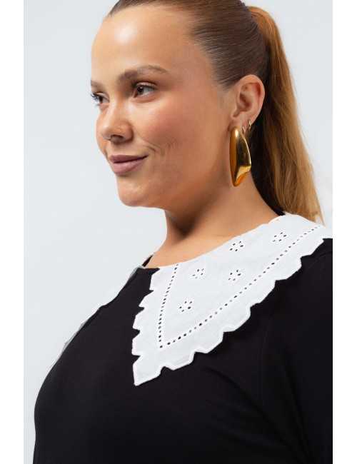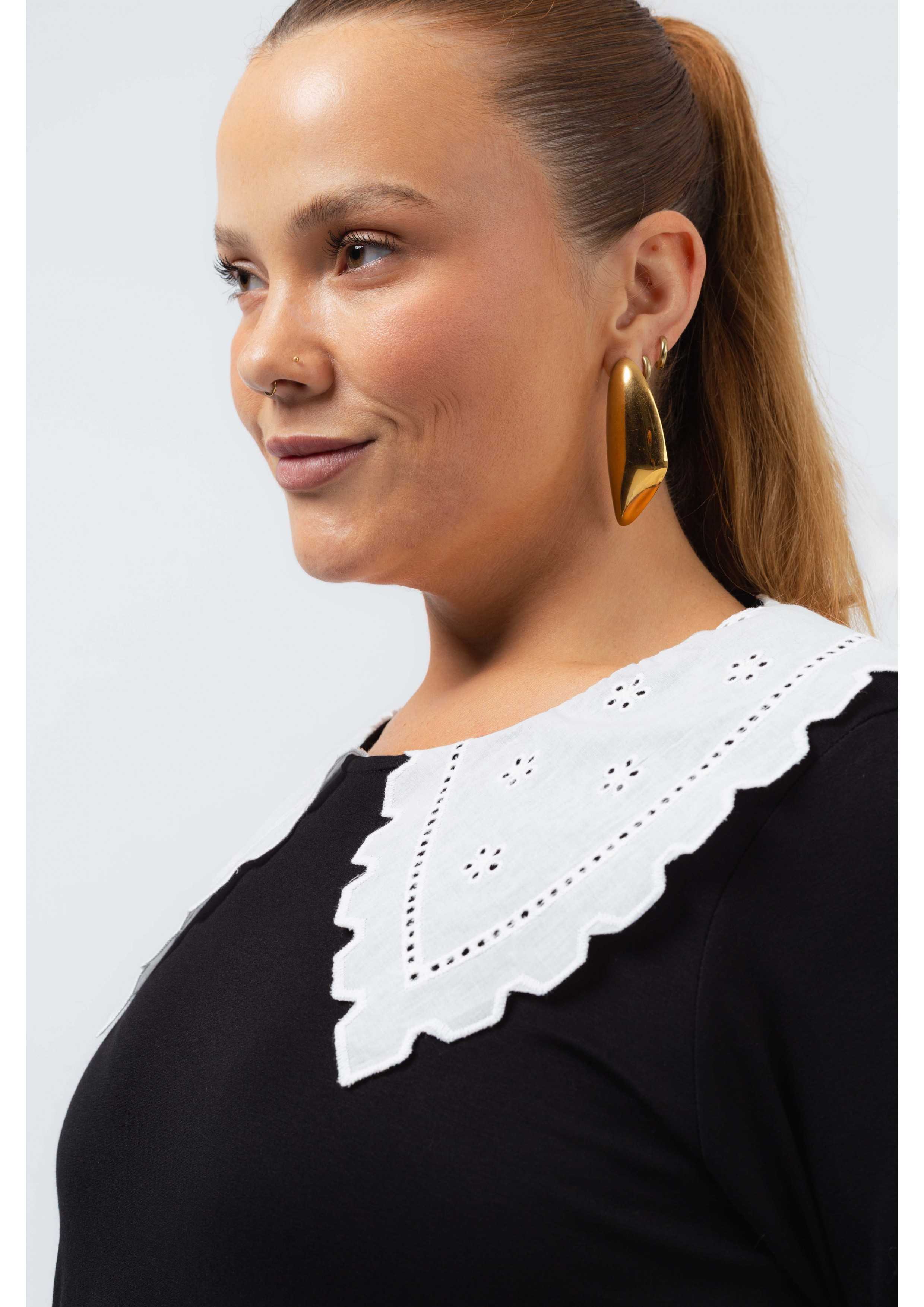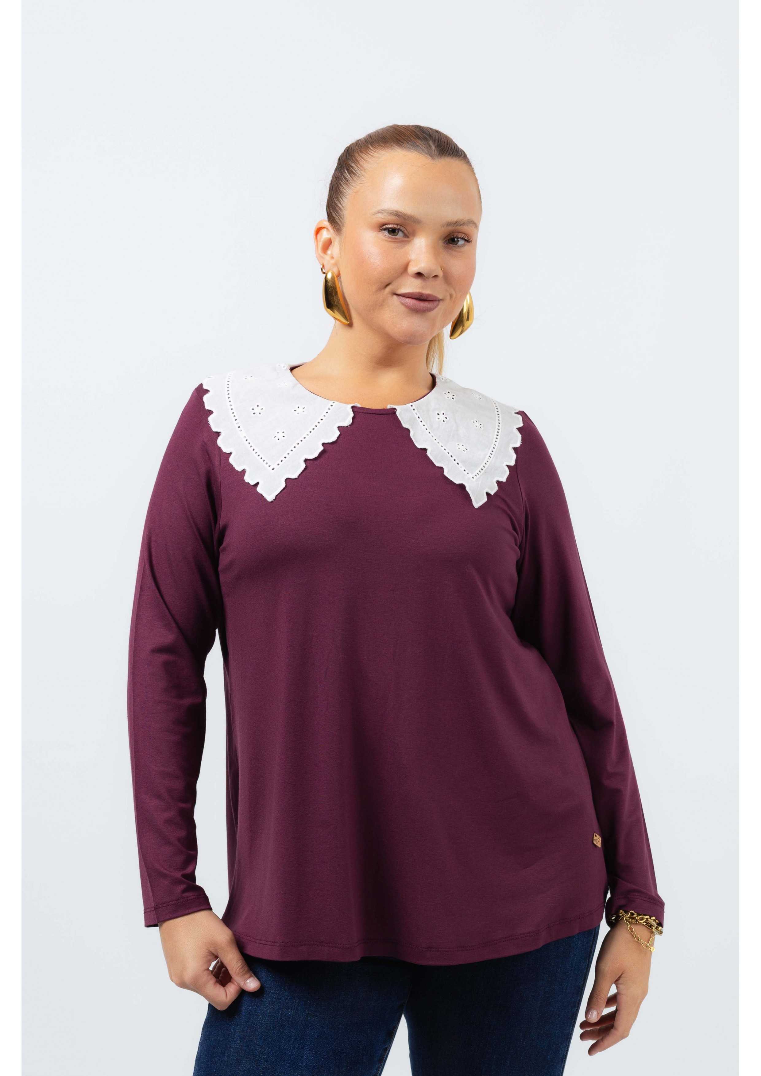 Camisola em malha lisa, manga comprida, decote redondo com aplicação de gola em tecido bordada. Lágrima na costa, aperta com 1 botão. Disponível em Tamanhos Grandes Produto de desenho e fabrico próprio. Somos uma marca de confeção de vestuário com mais de 50 anos de experiência Modelo: Altura 1.70m e está a vestir o tamanho XL.