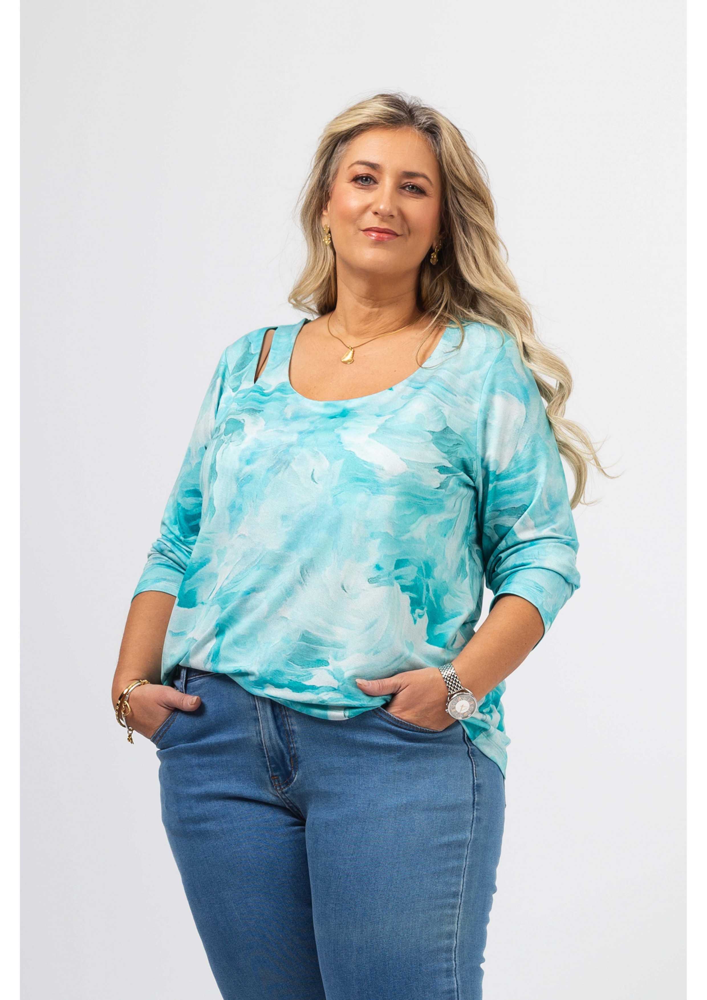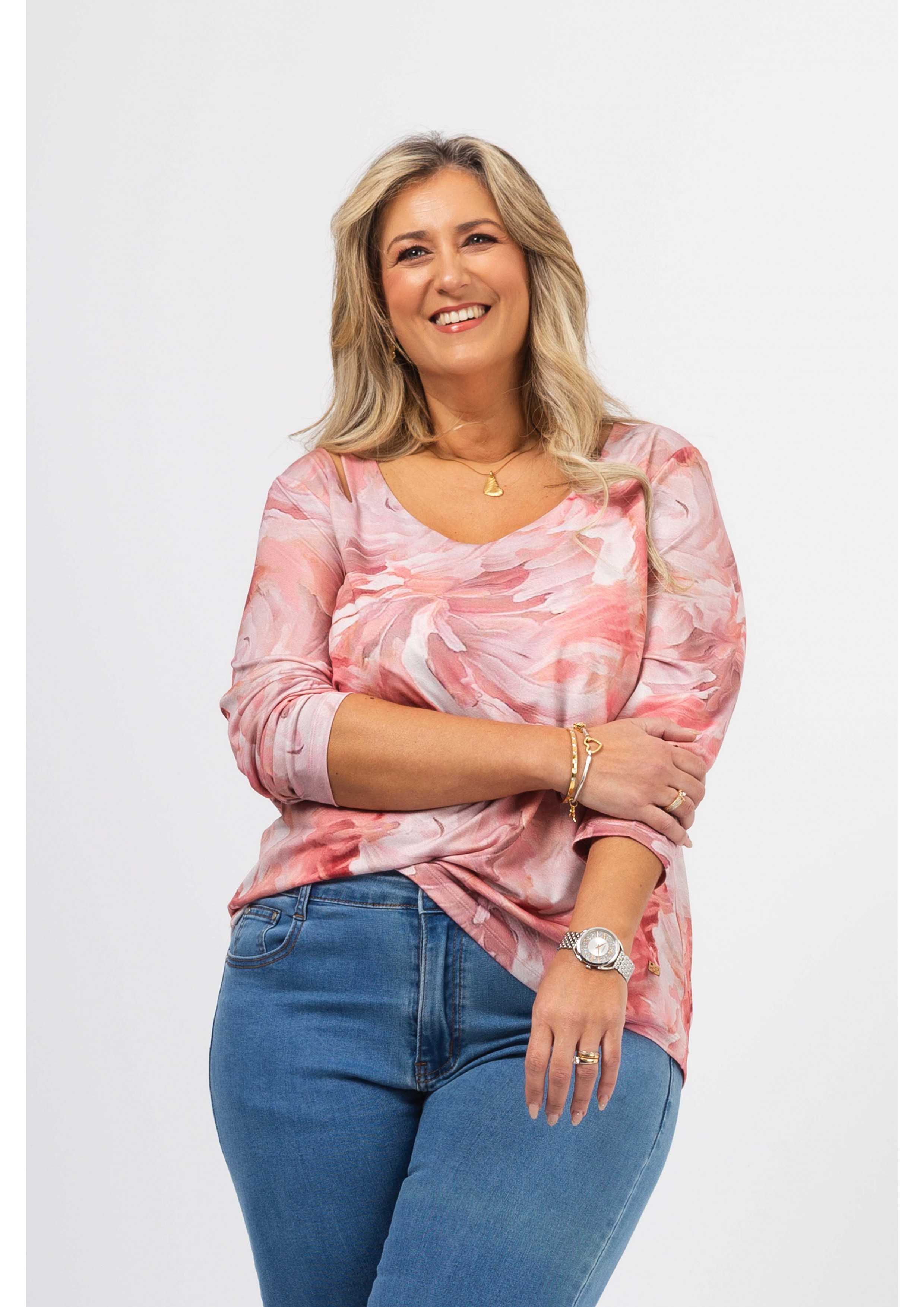 Camisola em malha estampada. Manga comprida. Decote redondo com lágrima lateral ombro. Disponível em Tamanhos Grandes Produto de desenho e fabrico próprio. Somos uma marca de confeção de vestuário com mais de 50 anos de experiência Modelo:Altura 1.65m e está a vestir o tamanho 2XL.