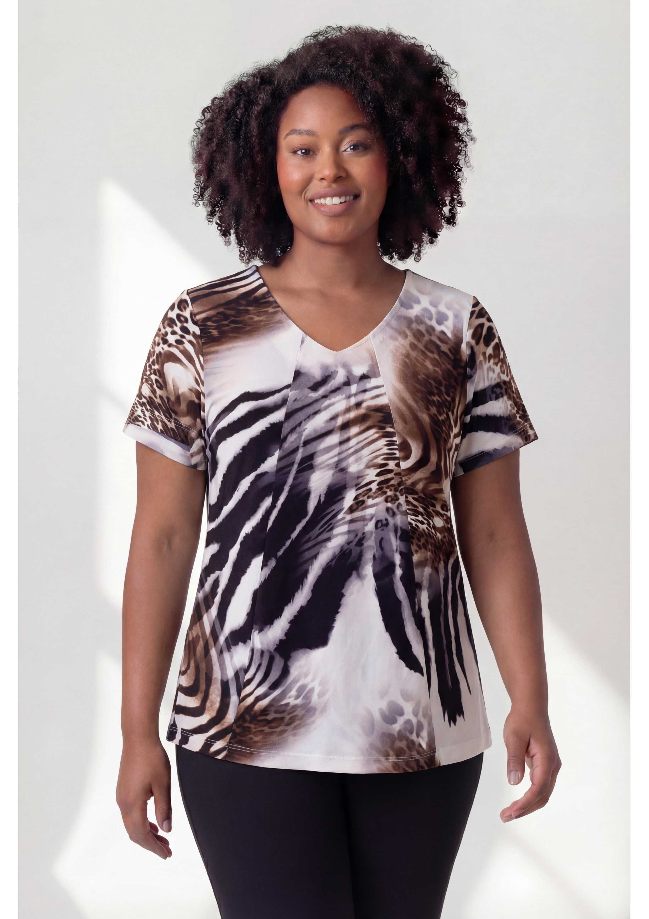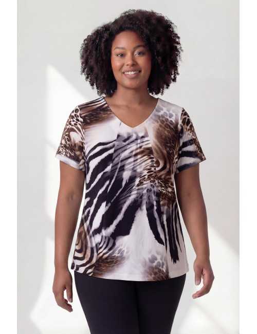 Camisola em malha estampada, tons castanhos, manga curta decote em bico com vista interior. Dois cortes diagonais na frente, modelo ligeiramente evasé. Disponível em Tamanhos Grandes Produto de desenho e fabrico próprio. Somos uma marca de confeção de vestuário com mais de 50 anos de experiência
