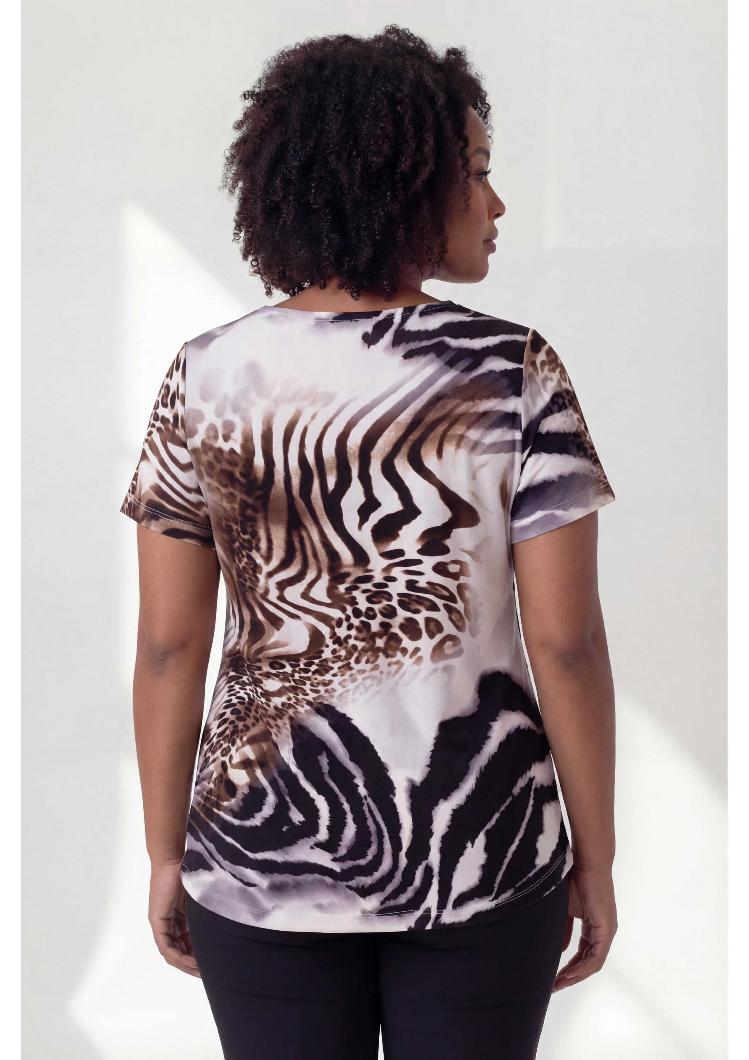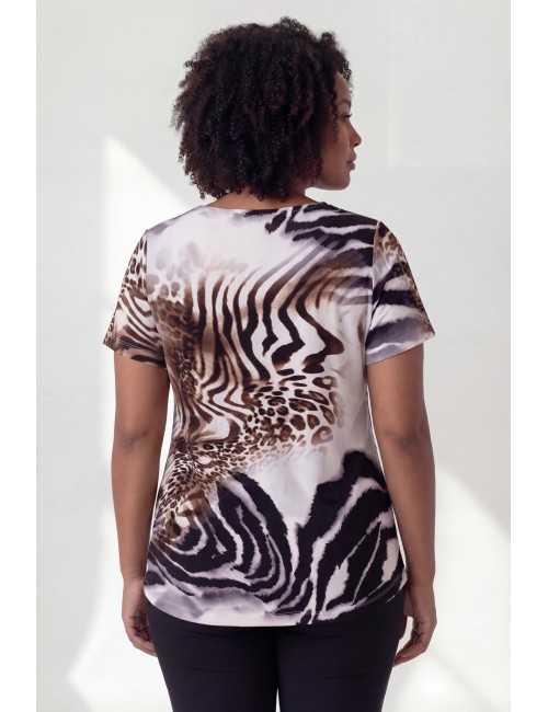 Camisola em malha estampada, tons castanhos, manga curta decote em bico com vista interior. Dois cortes diagonais na frente, modelo ligeiramente evasé.