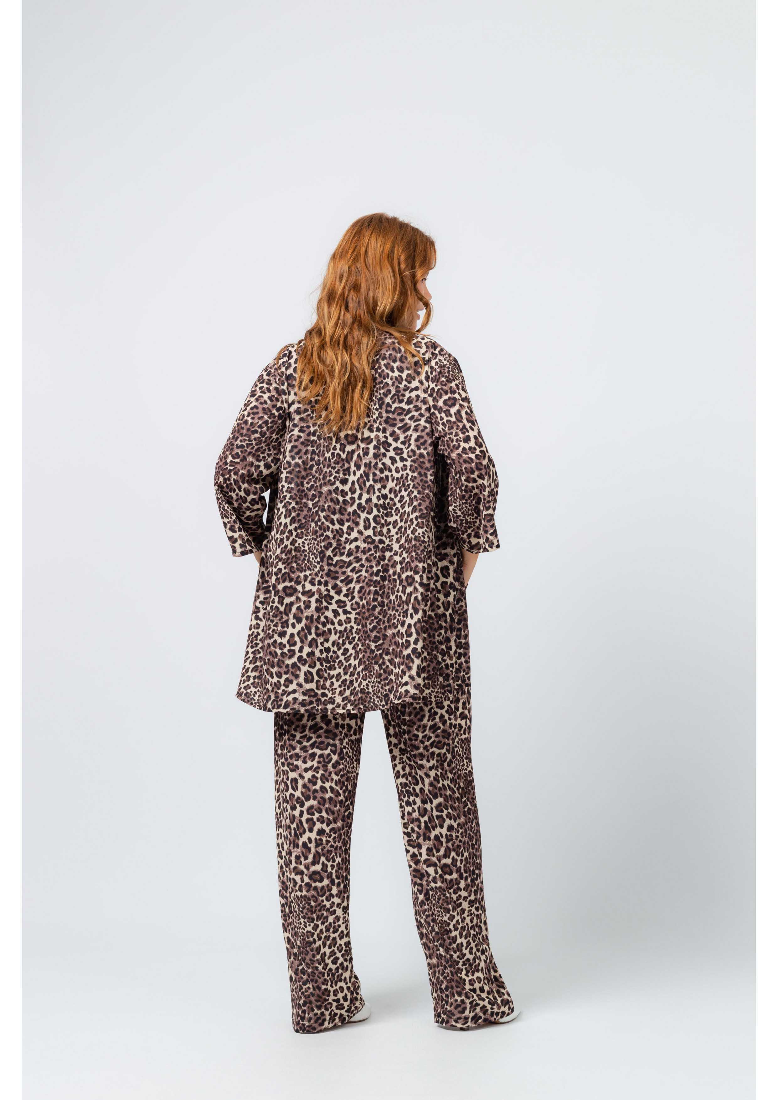 Casaco em tecido estampado castanho, manga 3/4 com pequena pinça vertical. Modelo largo, caído e aberto.