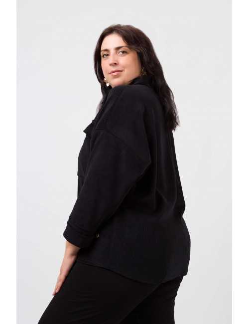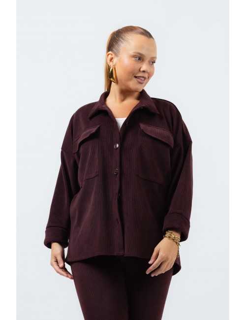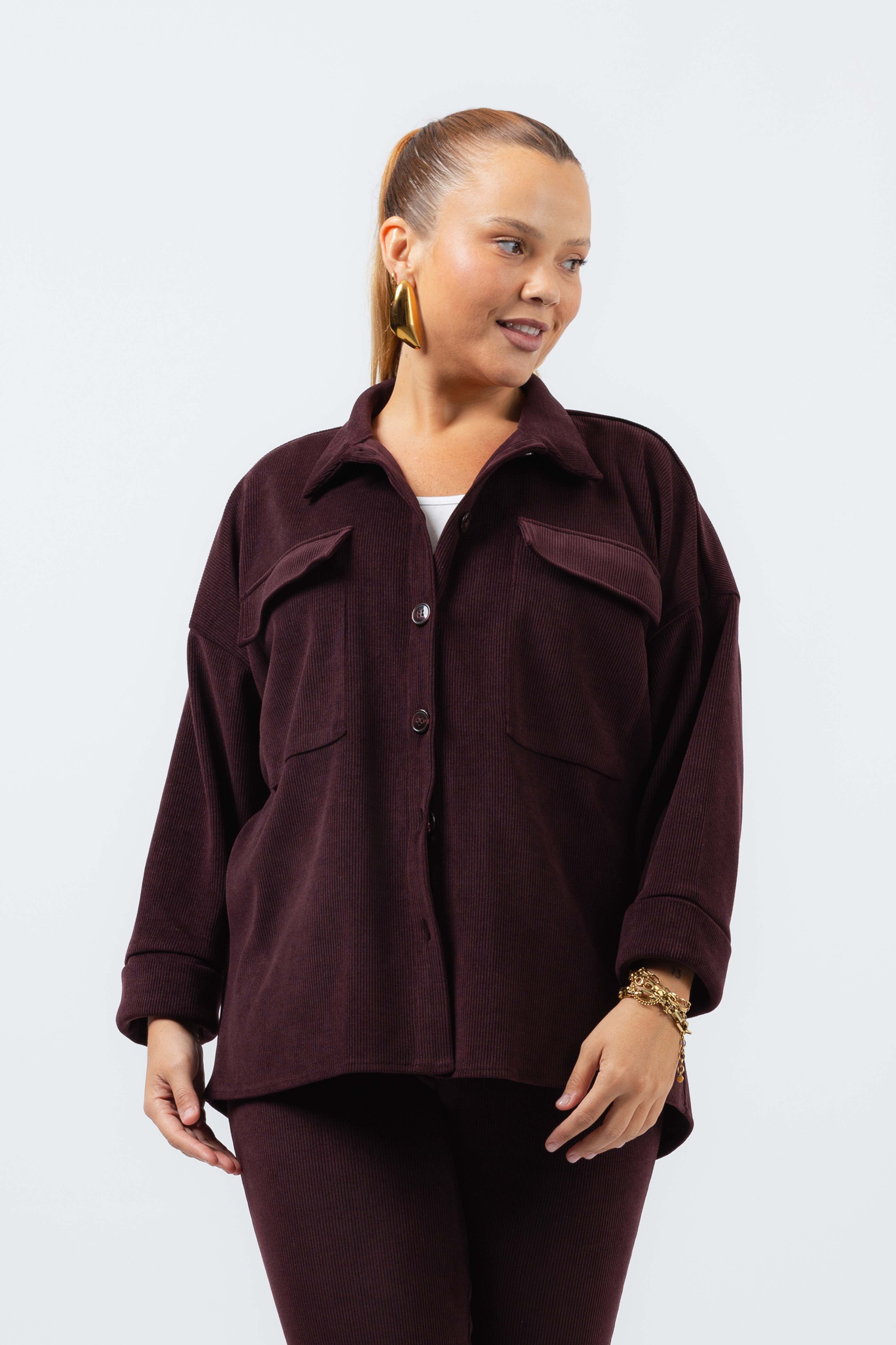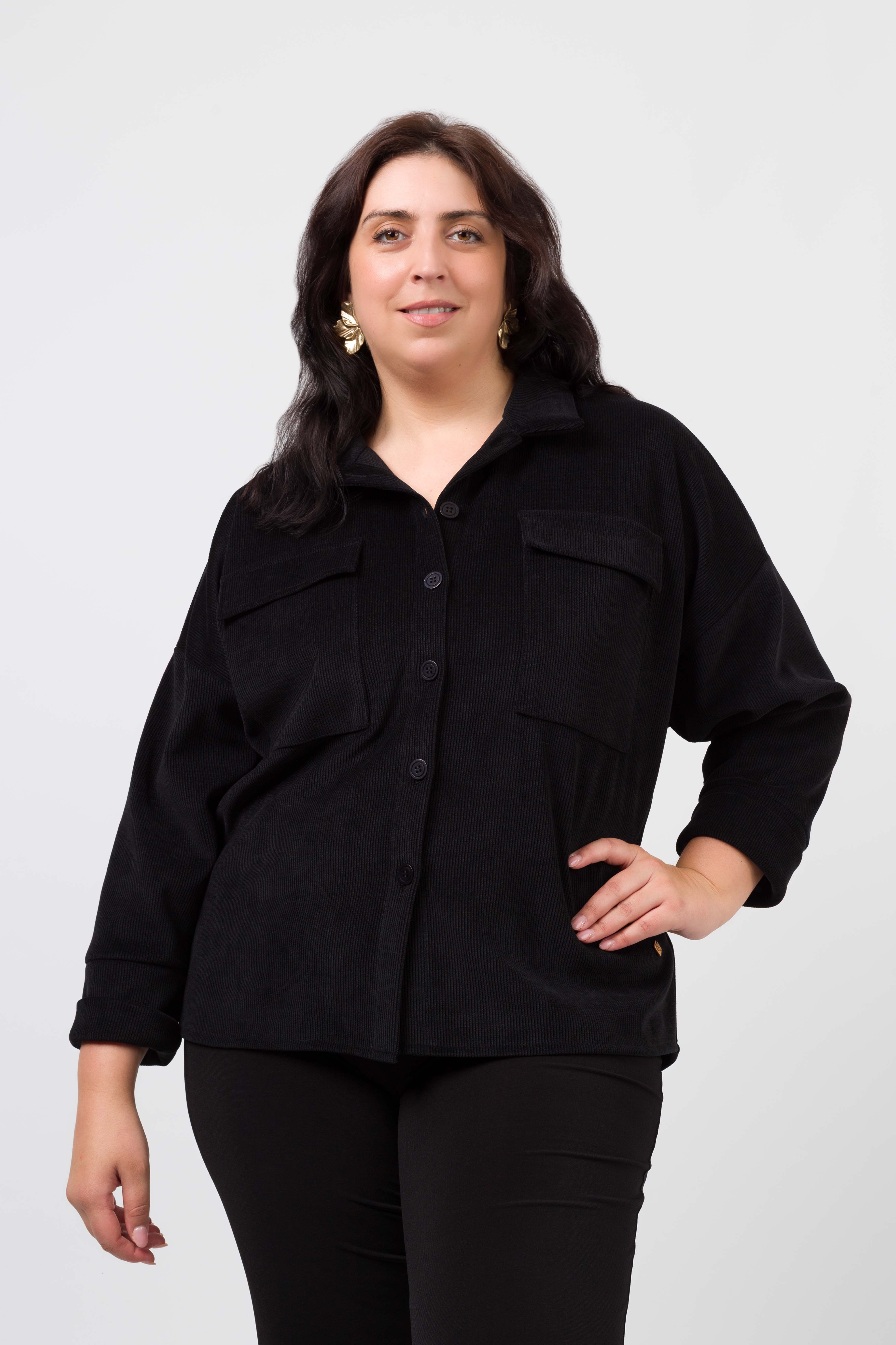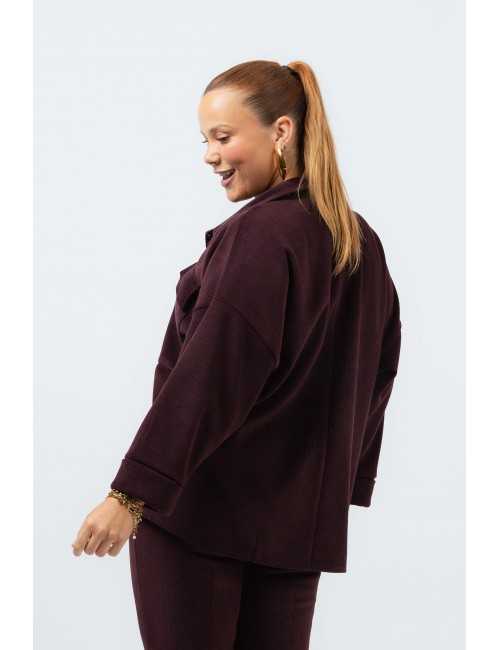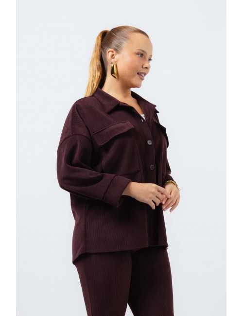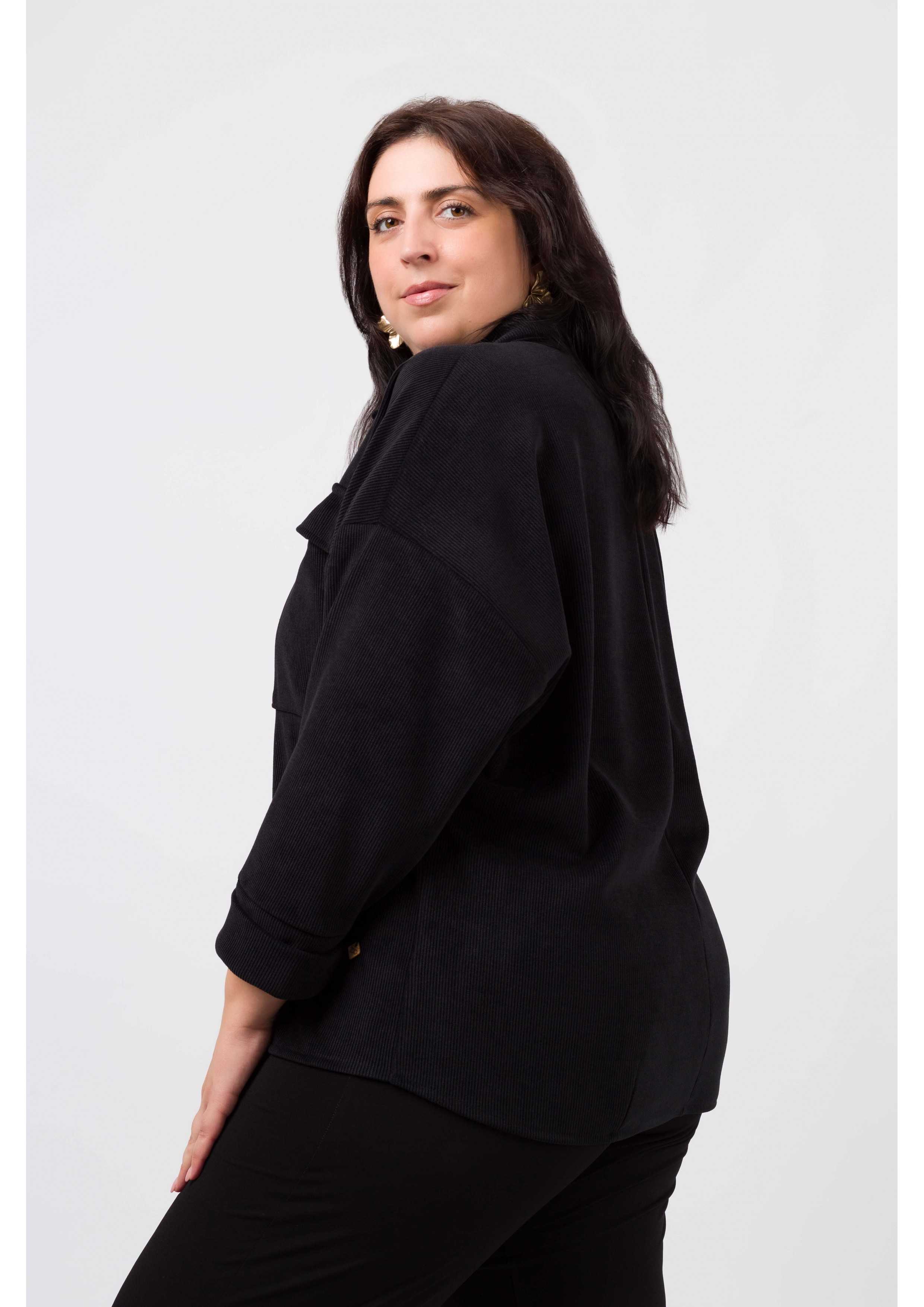 Casaco em malha lisa, bombazine. Modelo tipo camiseiro, manga francesa com punho dobrado não cravado, Bolsos de chapa com pala na frente, Decote com gola colarinho. Aperta com 6 botões. Costa com pinças inferiores.