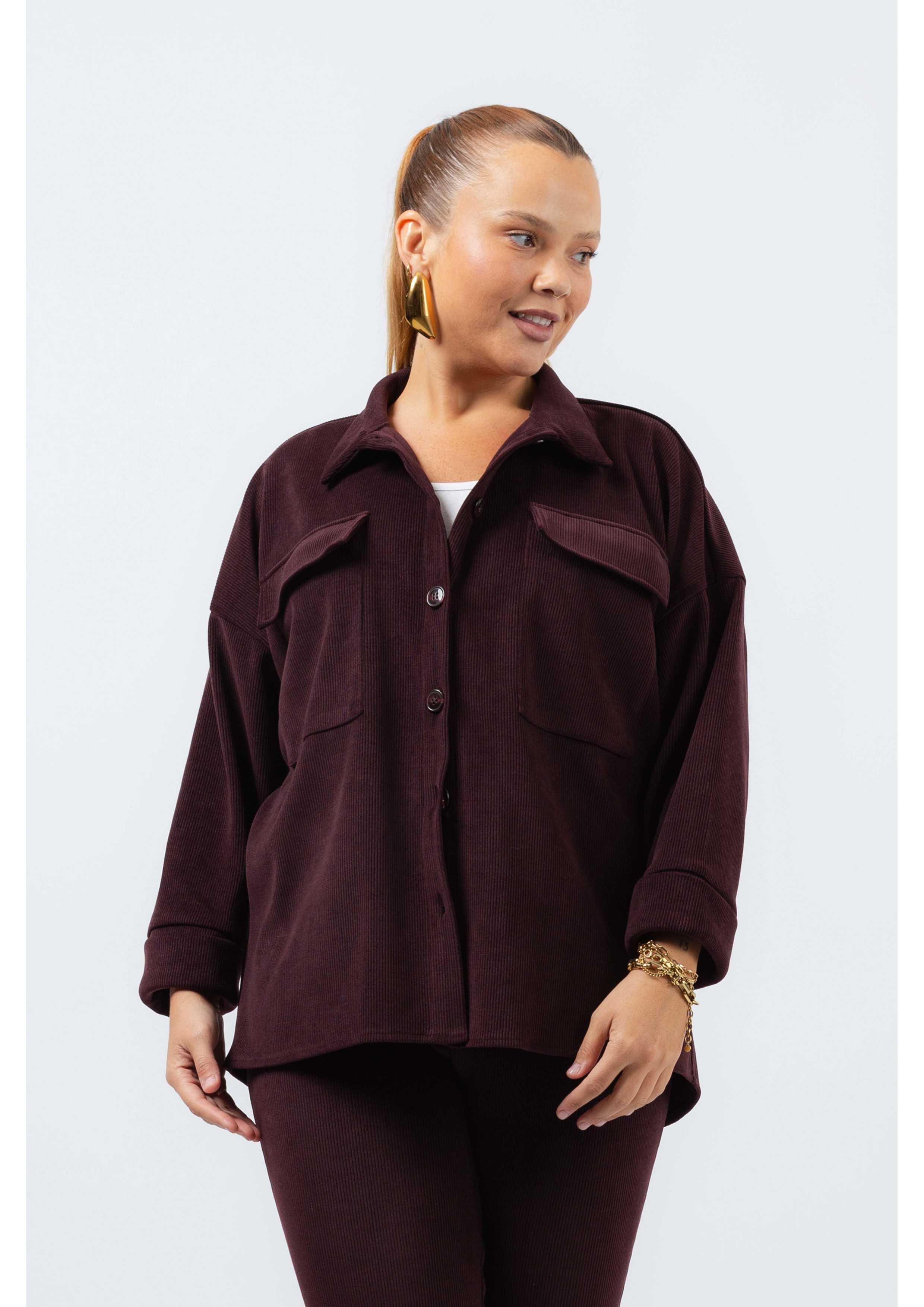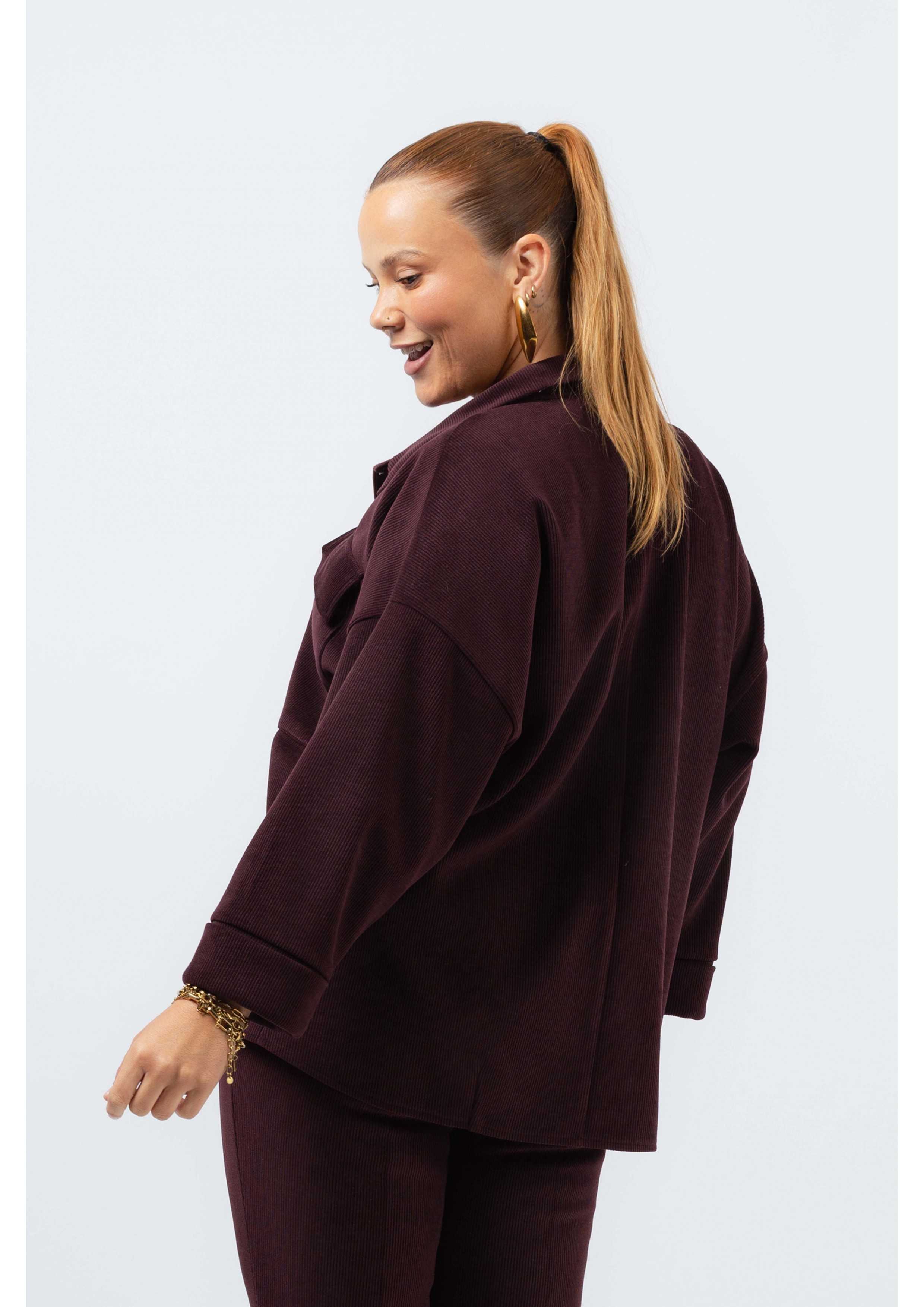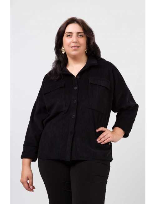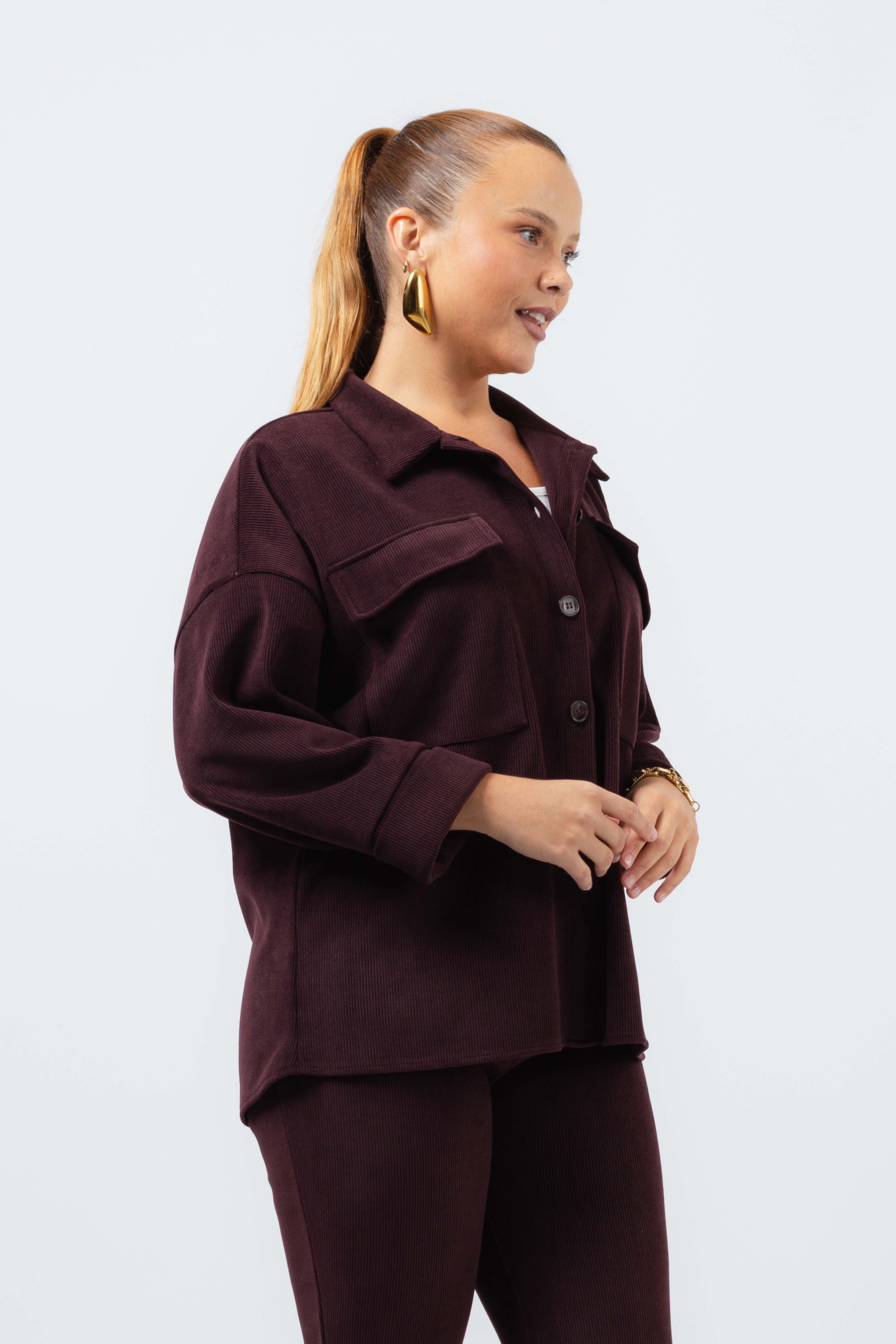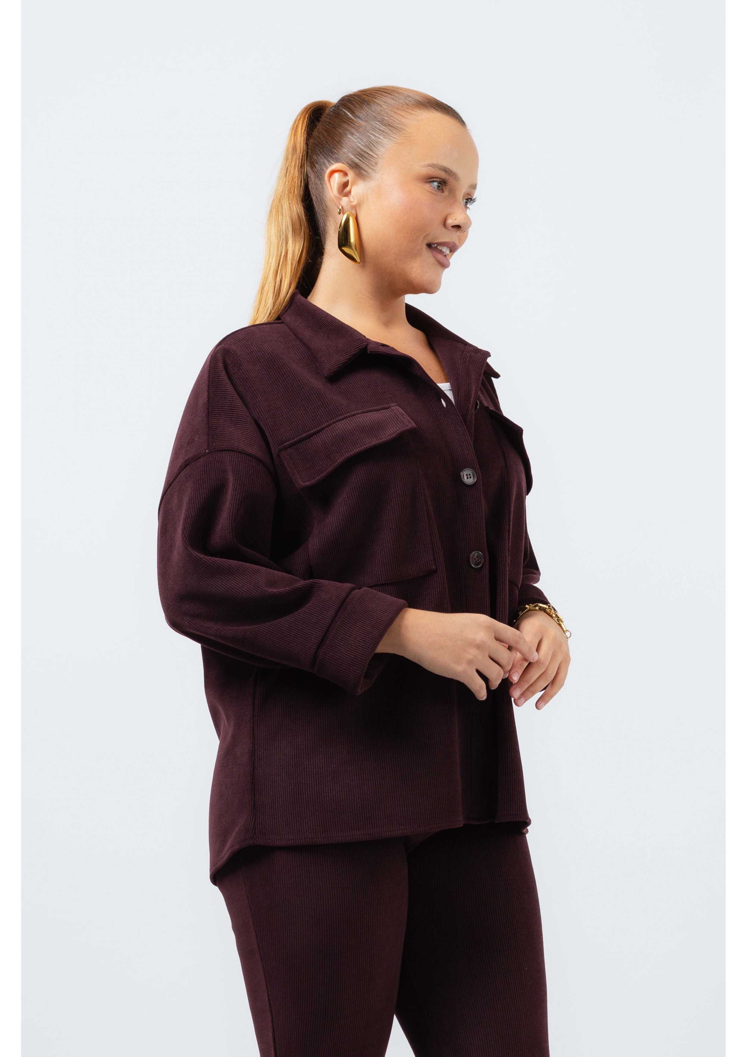 Casaco em malha lisa, bombazine. Modelo tipo camiseiro, manga francesa com punho dobrado não cravado, Bolsos de chapa com pala na frente, Decote com gola colarinho. Aperta com 6 botões. Costa com pinças inferiores.