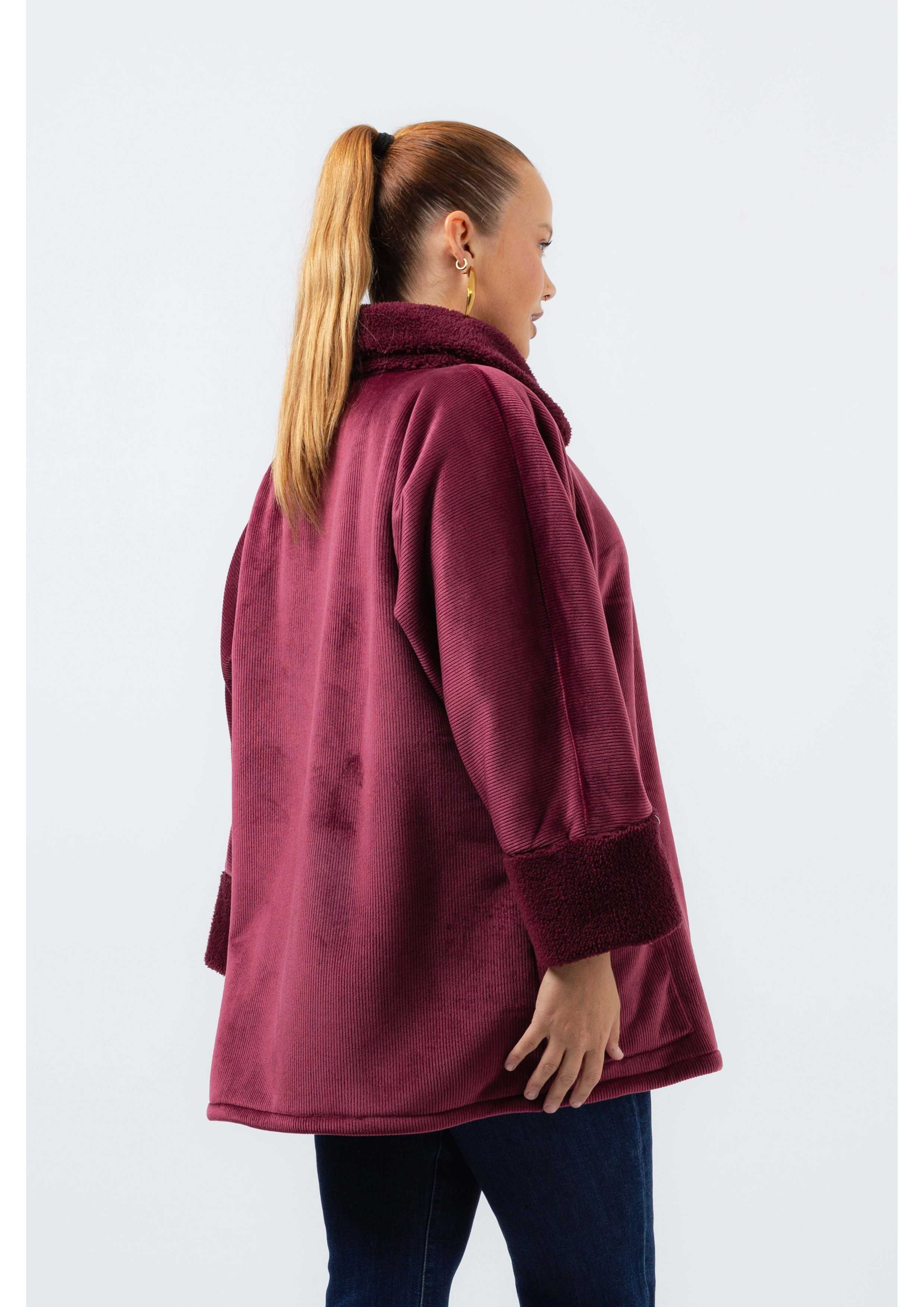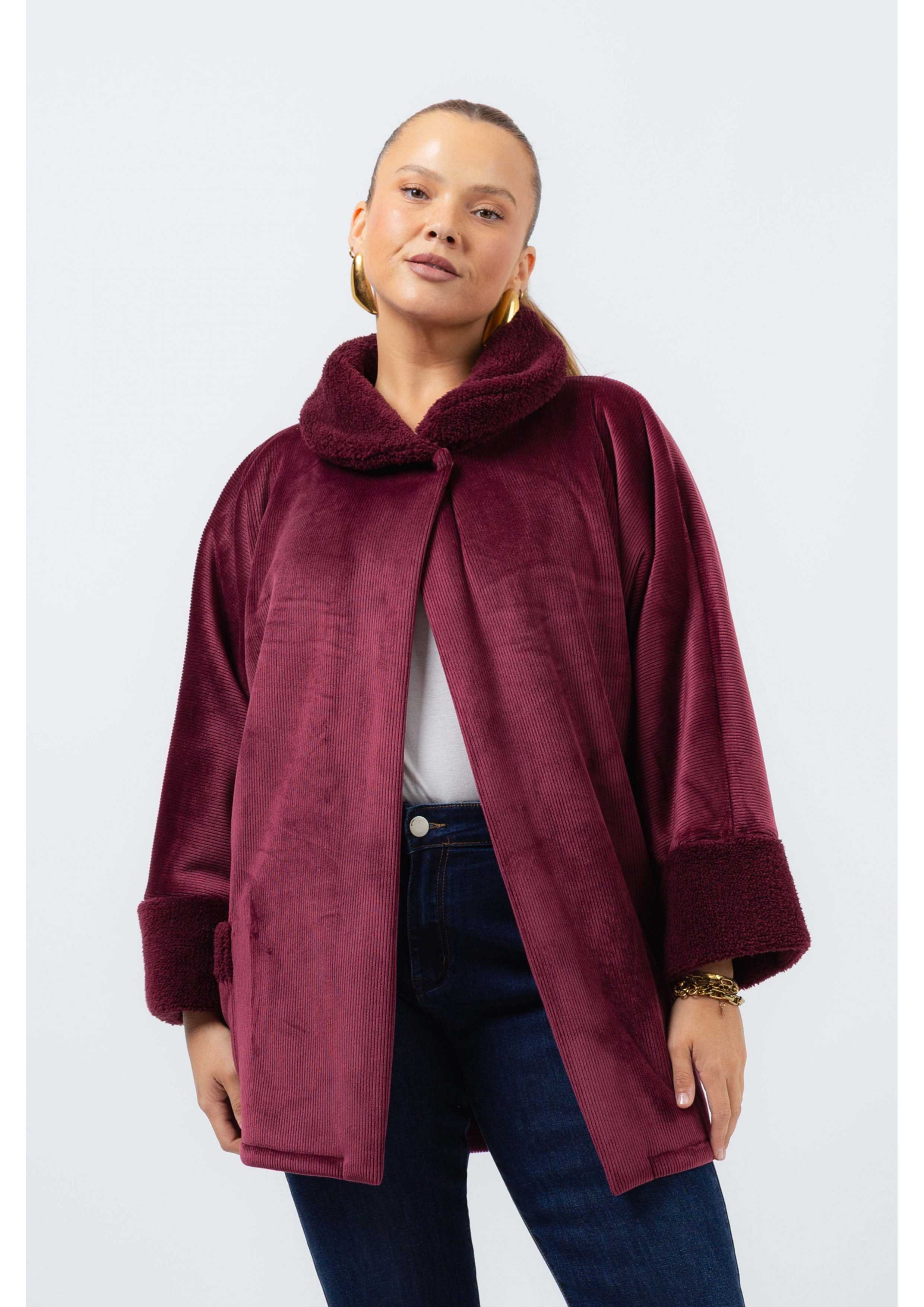 Capa em malha lisa, efeito bombazine. Manga comprida. Interior em pêlo. Gola punhos e pala bolso pêlo/avesso. Aperta com uma mola em trespasse. Disponível em Tamanhos Grandes Produto de desenho e fabrico próprio. Somos uma marca de confeção de vestuário com mais de 50 anos de experiência Modelo: Altura 1.70m e está a vestir o tamanho XL.