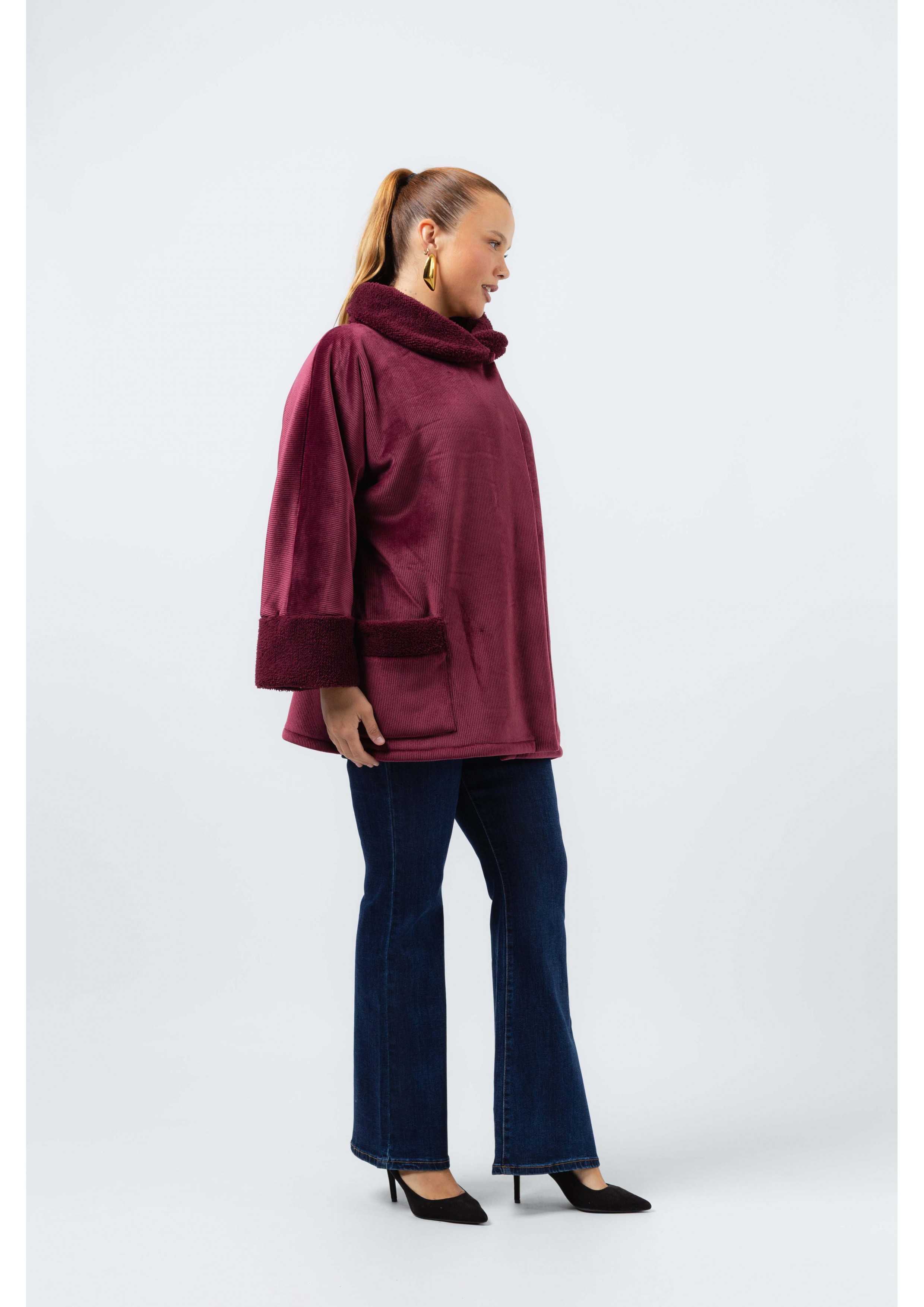 Capa em malha lisa, efeito bombazine. Manga comprida. Interior em pêlo. Gola punhos e pala bolso pêlo/avesso. Aperta com uma mola em trespasse.