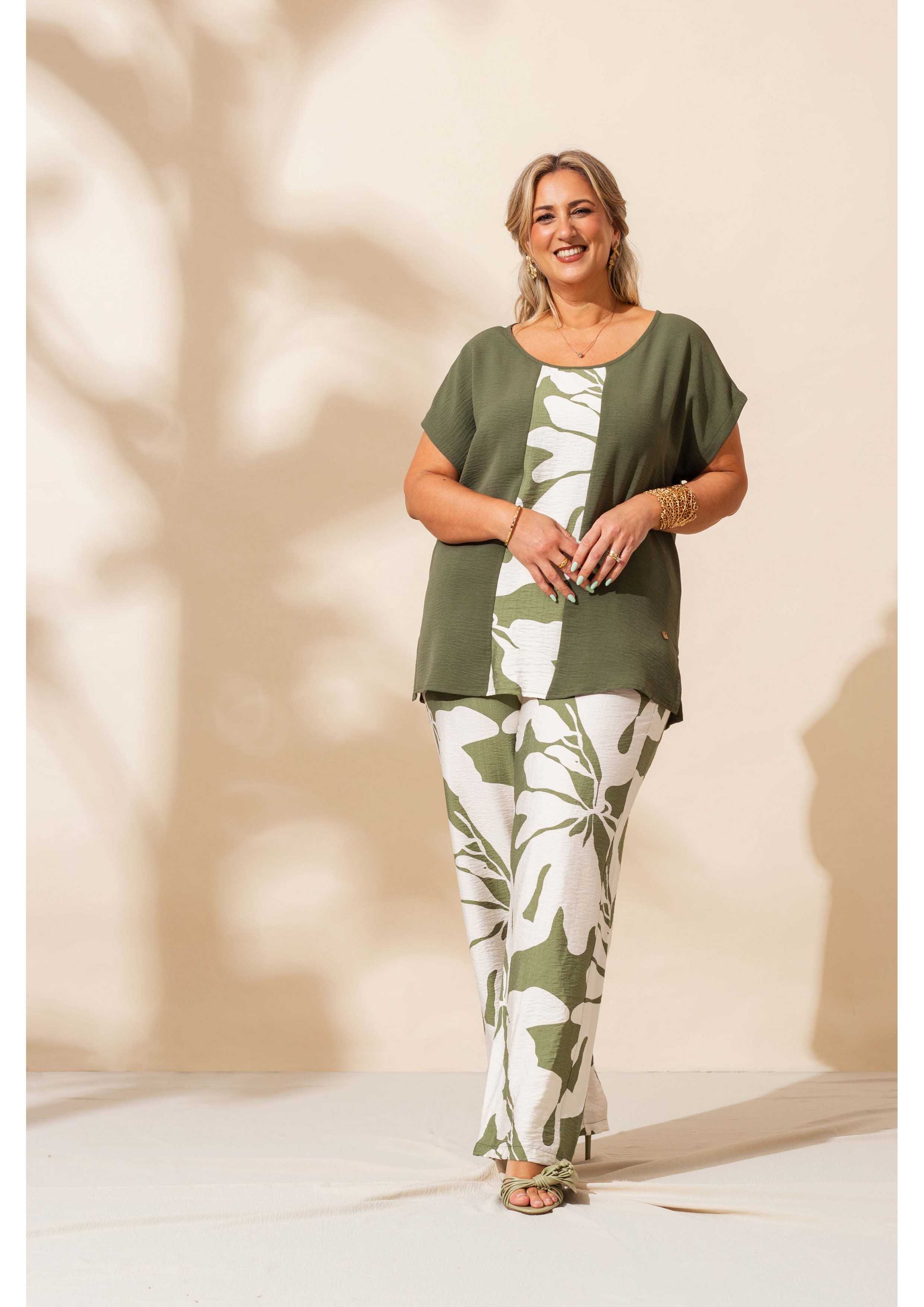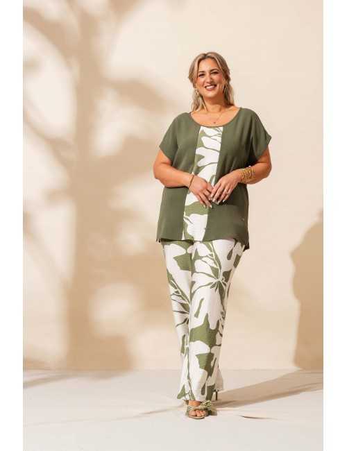 Conjunto em tecido estampado e com encaixes lisos. Calça com bolsos laterais, cinto alto com elástico, peça toda estampada. Túnica lisa com encaixe ombros e frente estampada, rachas laterais, decote redondo. Modelo: Altura 1.65m e está a vestir o tamanho 2XL.