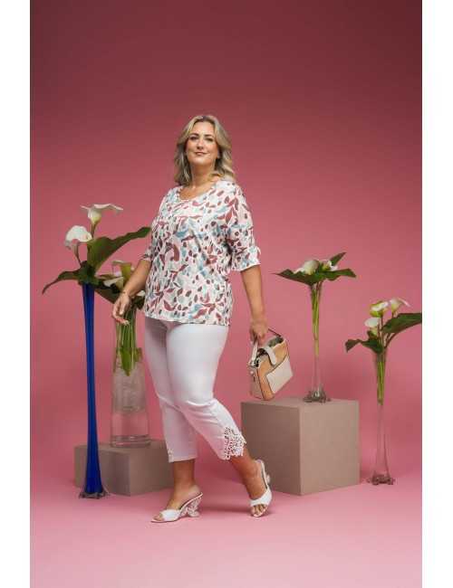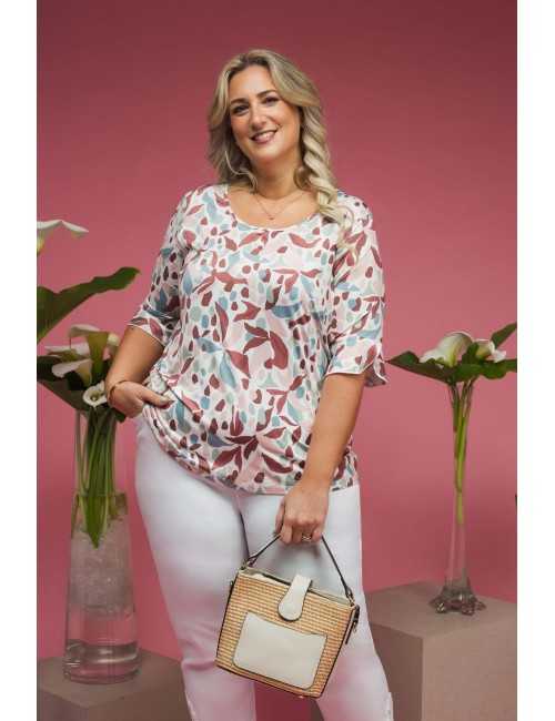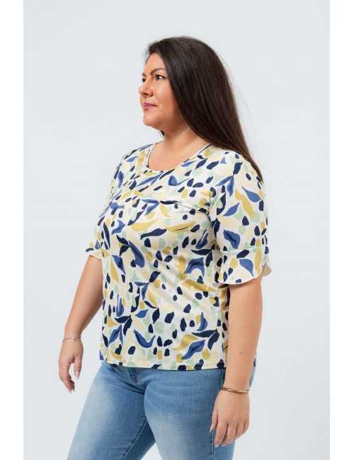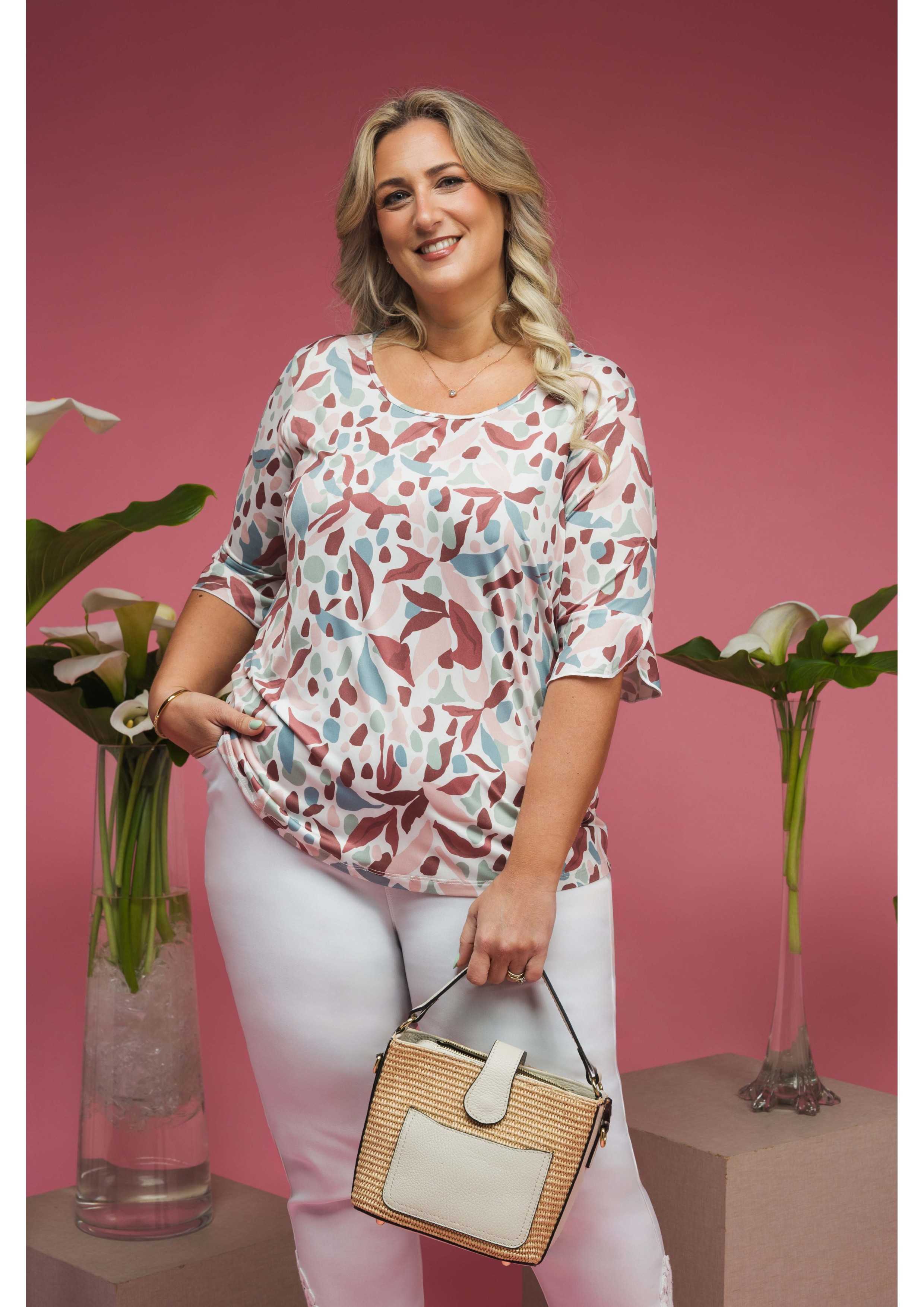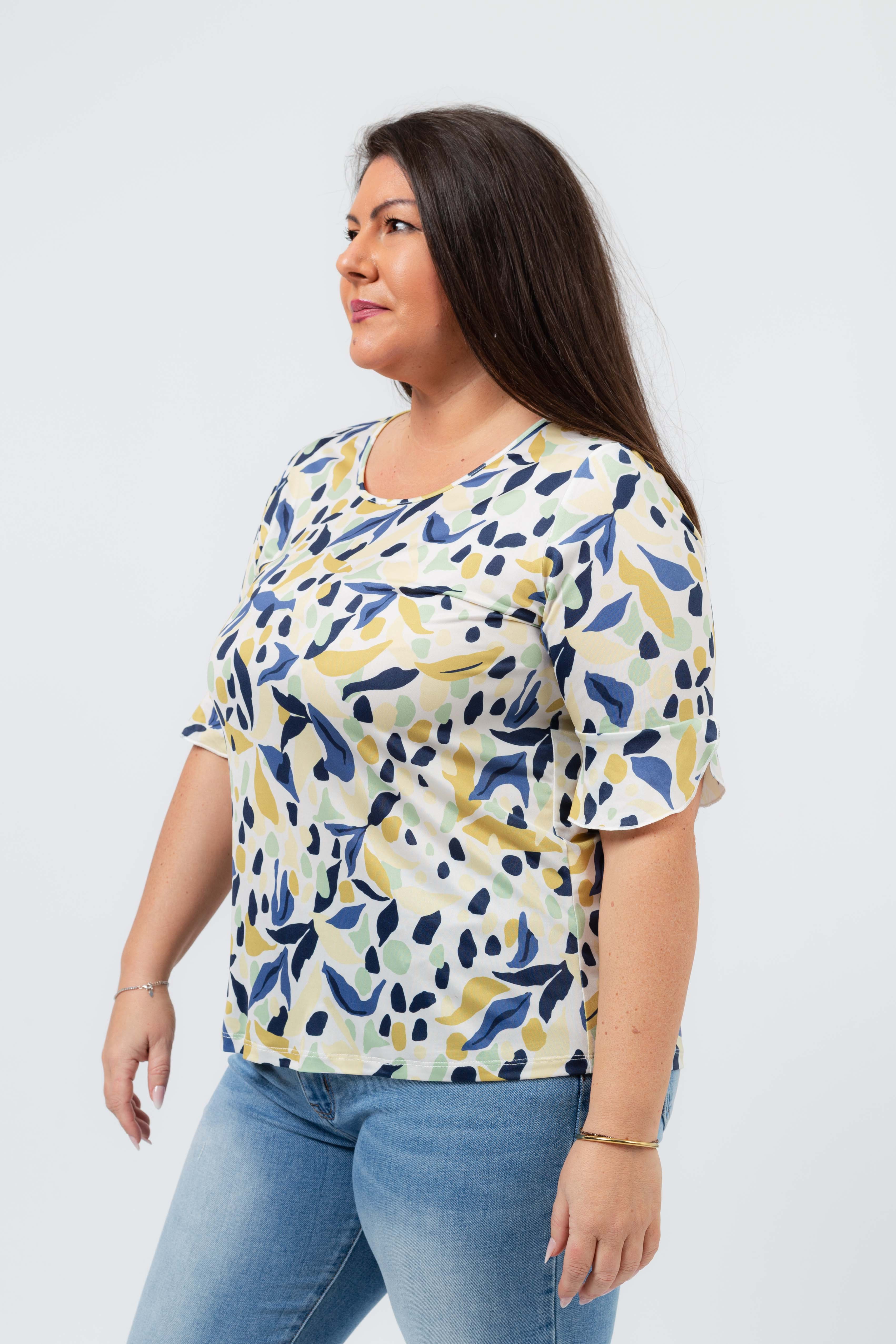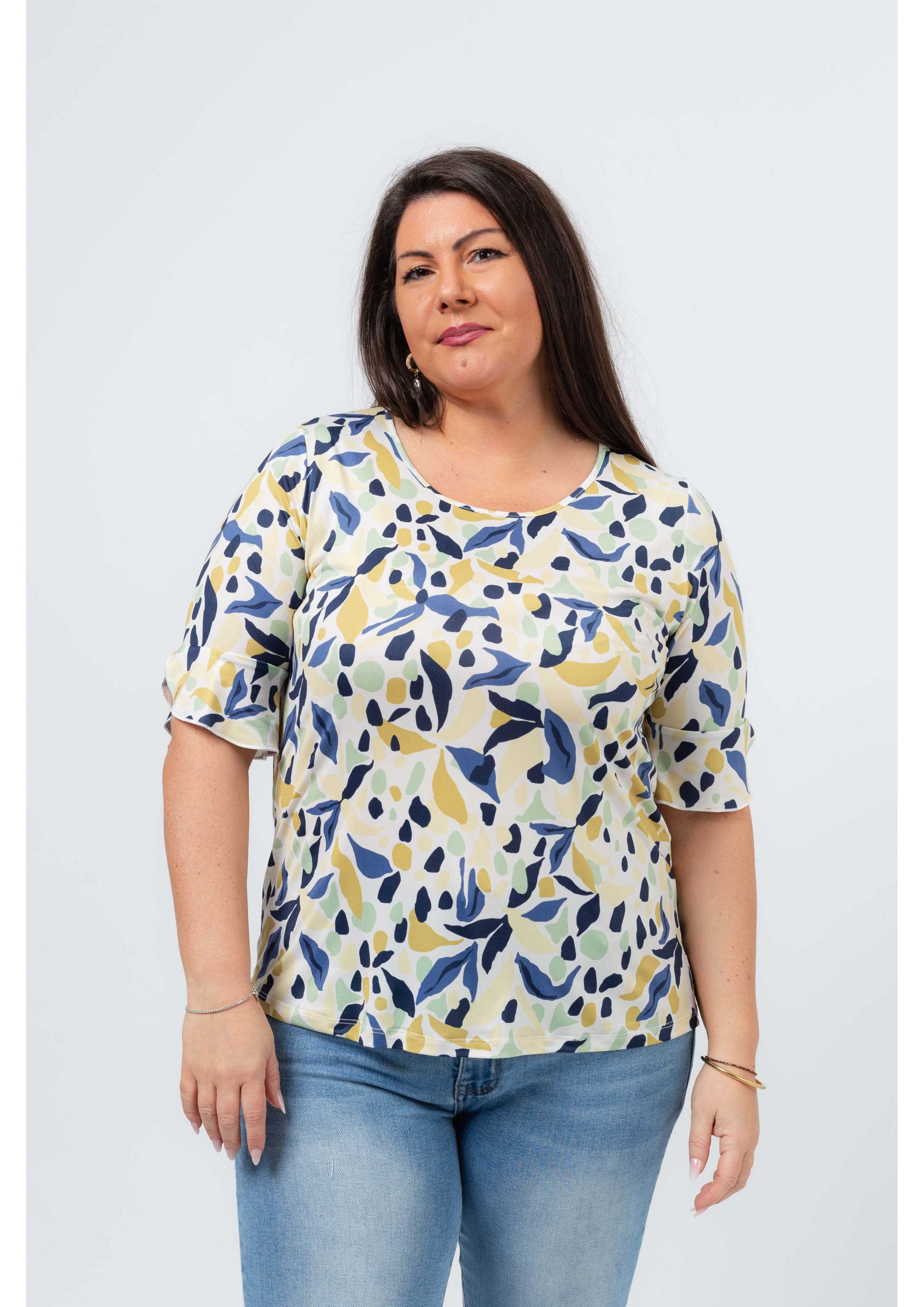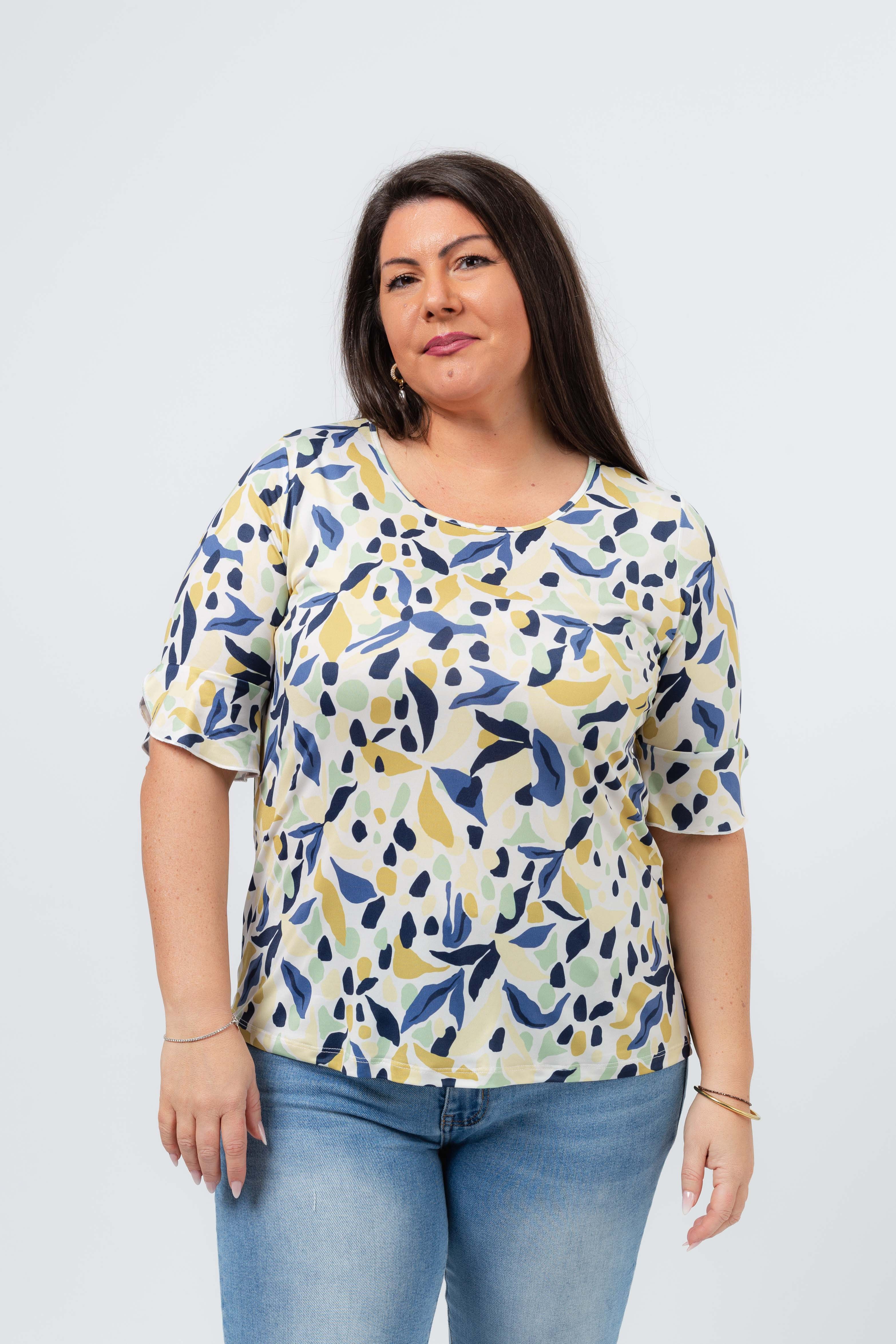 Camisola em malha estampada, manga 3/4 com folho aplicado com acabamento em rolinho. Base arredondada, modelo ligeiramente evasé. Disponível em Tamanhos Grandes Produto de desenho e fabrico próprio. Somos uma marca de confeção de vestuário com mais de 50 anos de experiência