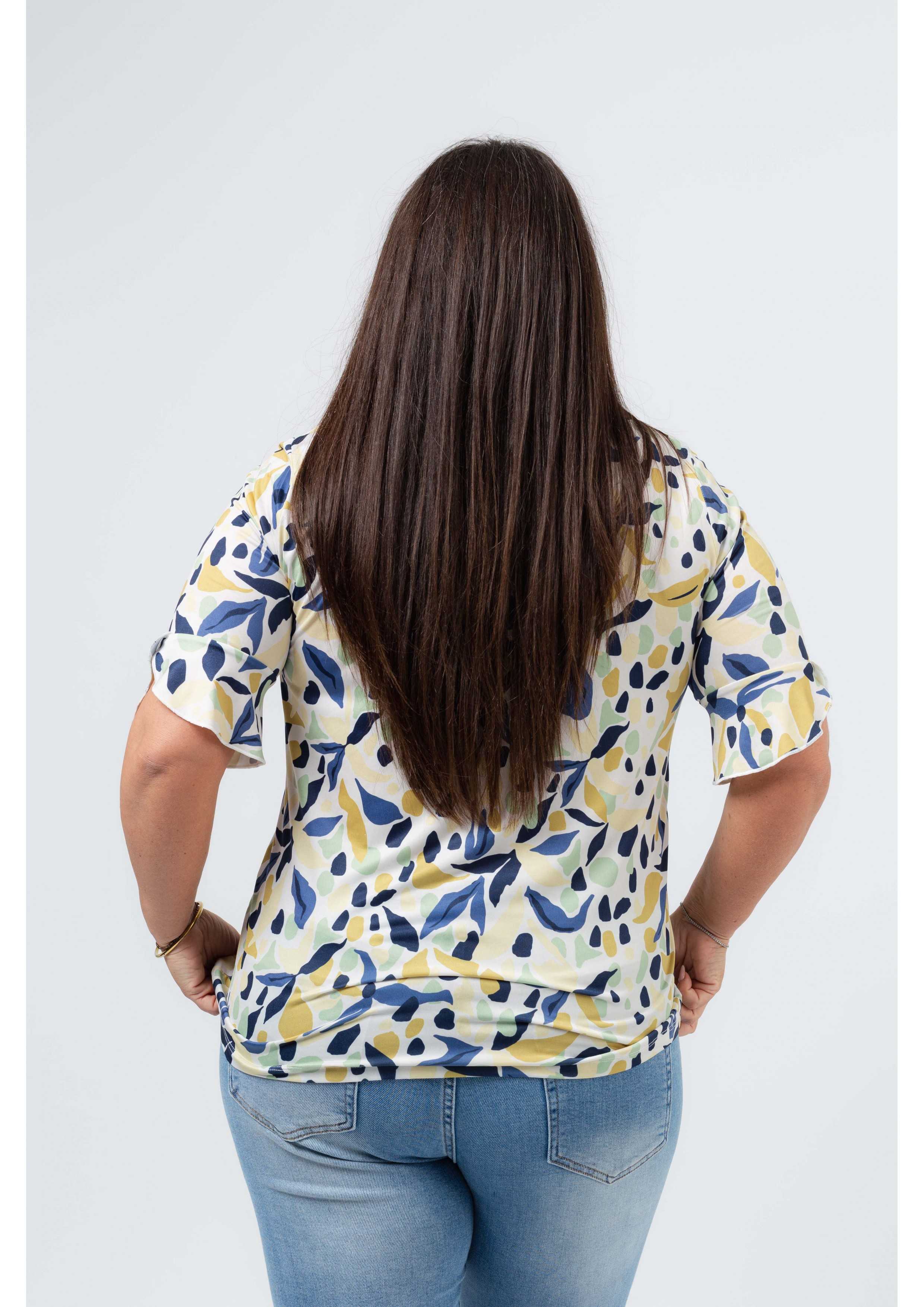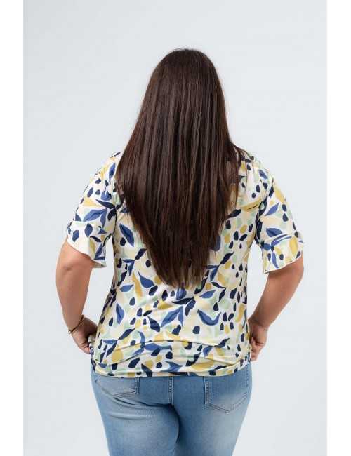 Camisola em malha estampada, manga 3/4 com folho aplicado com acabamento em rolinho. Base arredondada, modelo ligeiramente evasé.