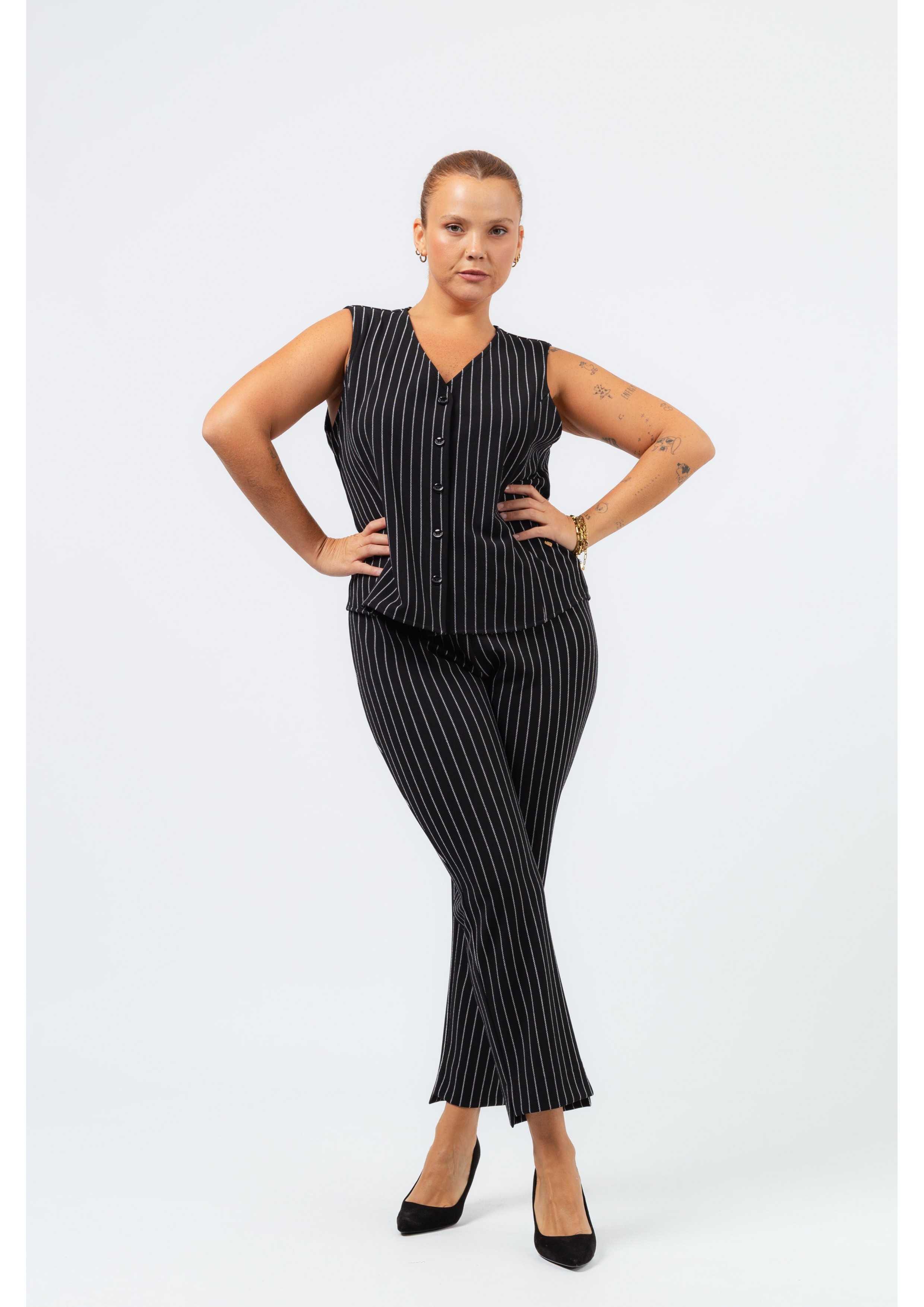 Conjunto, calça e colete, malha risca,