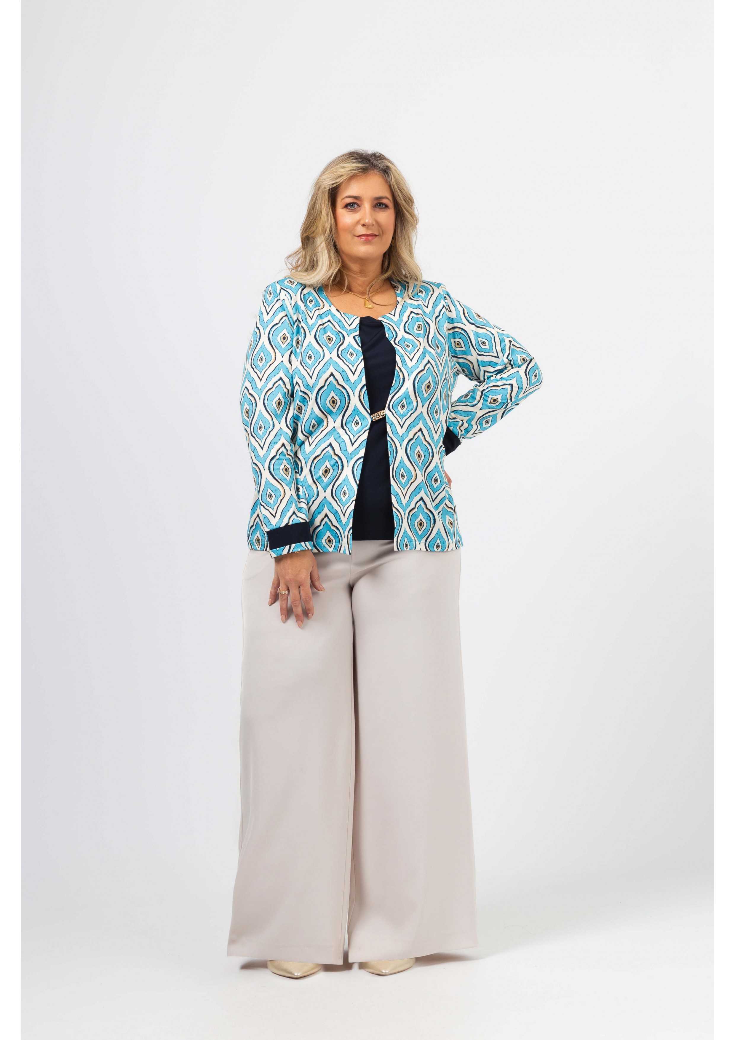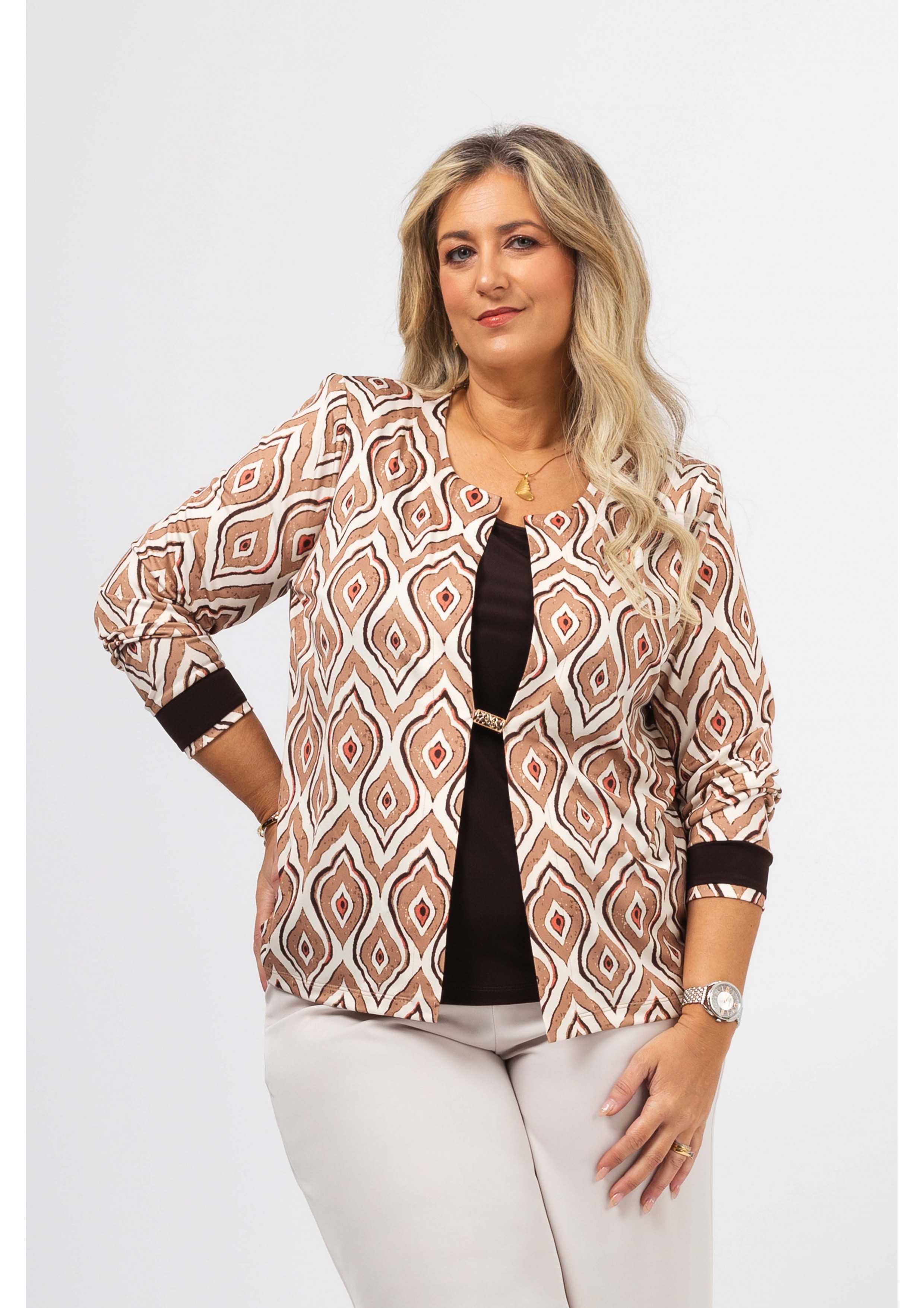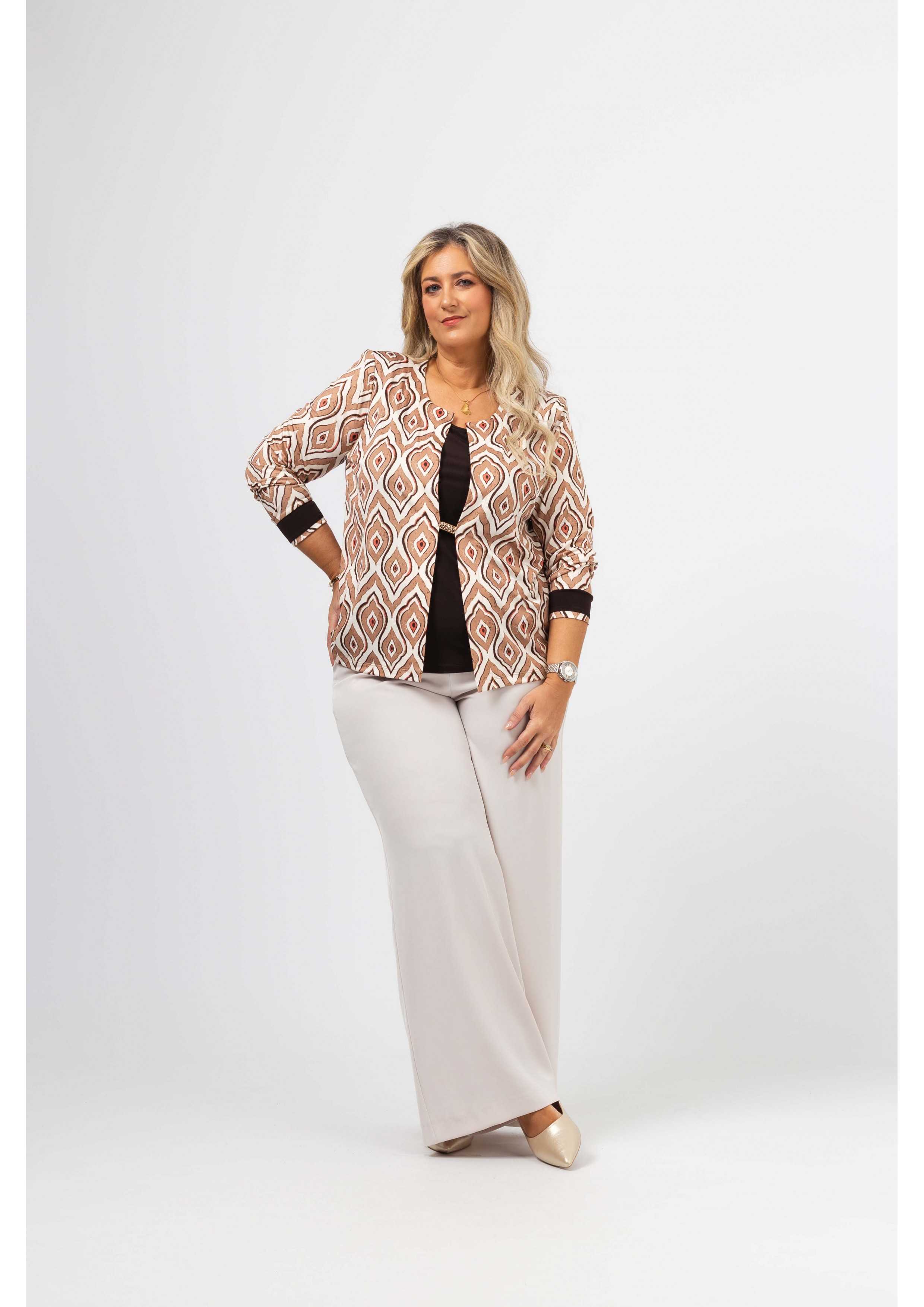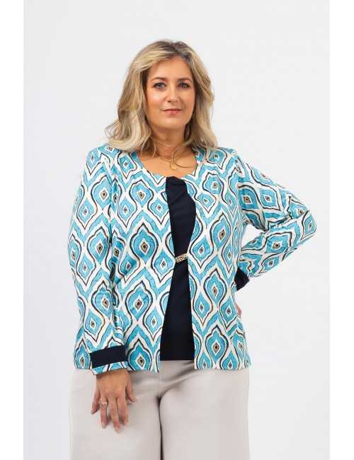 Conjunto em malha lisa e estampada, modelo 2 em 1. Casaco estampado decote redondo manga comprida com encaixe lisa. Aplique na frente. Camisola só frente presa no casaco.Lleva ombreiras.