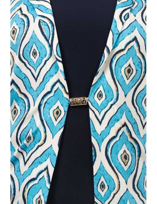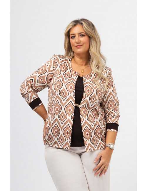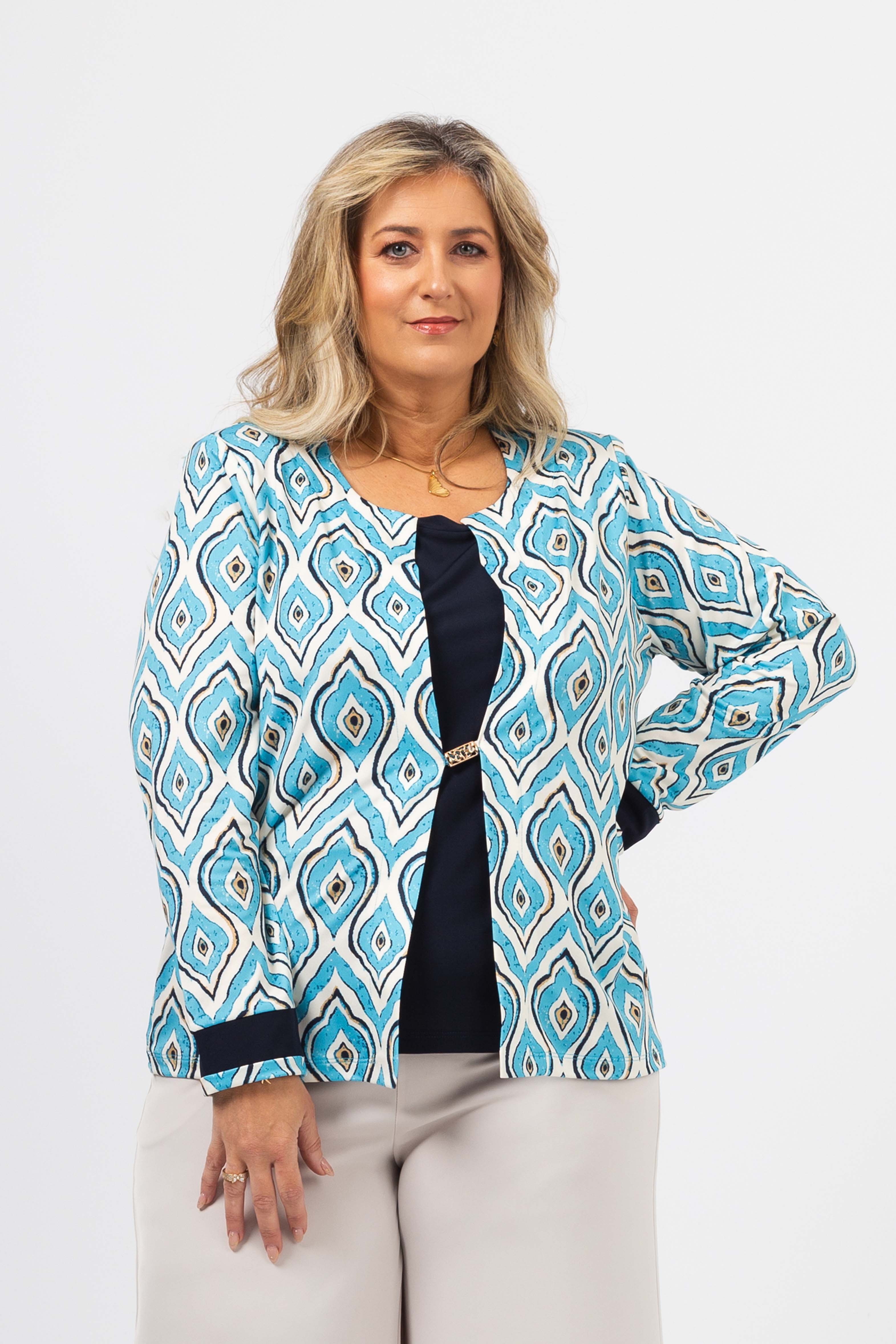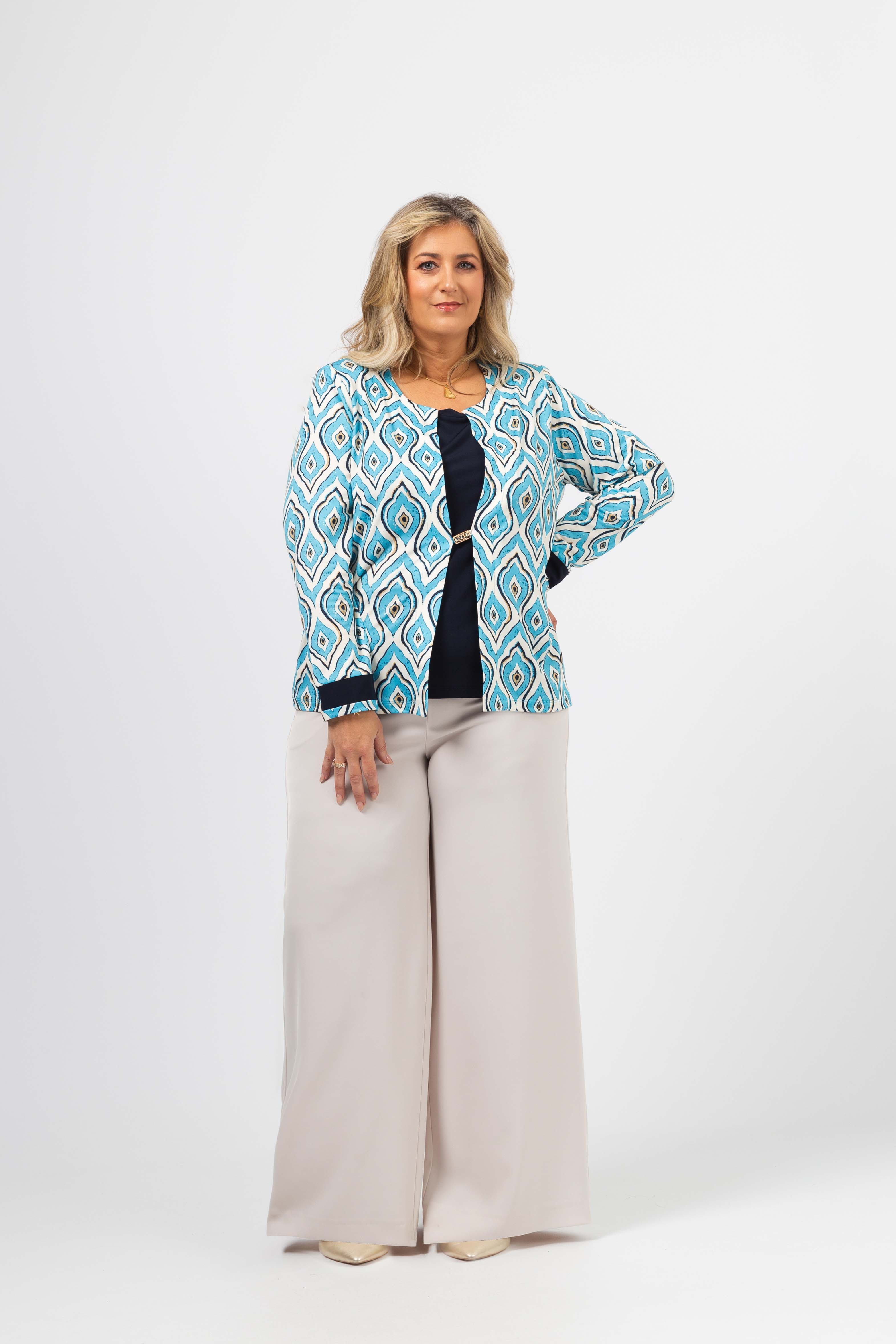 Conjunto em malha lisa e estampada, modelo 2 em 1. Casaco estampado decote redondo manga comprida com encaixe lisa. Aplique na frente. Camisola só frente presa no casaco.Lleva ombreiras.
