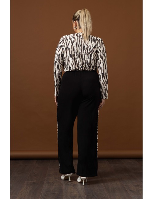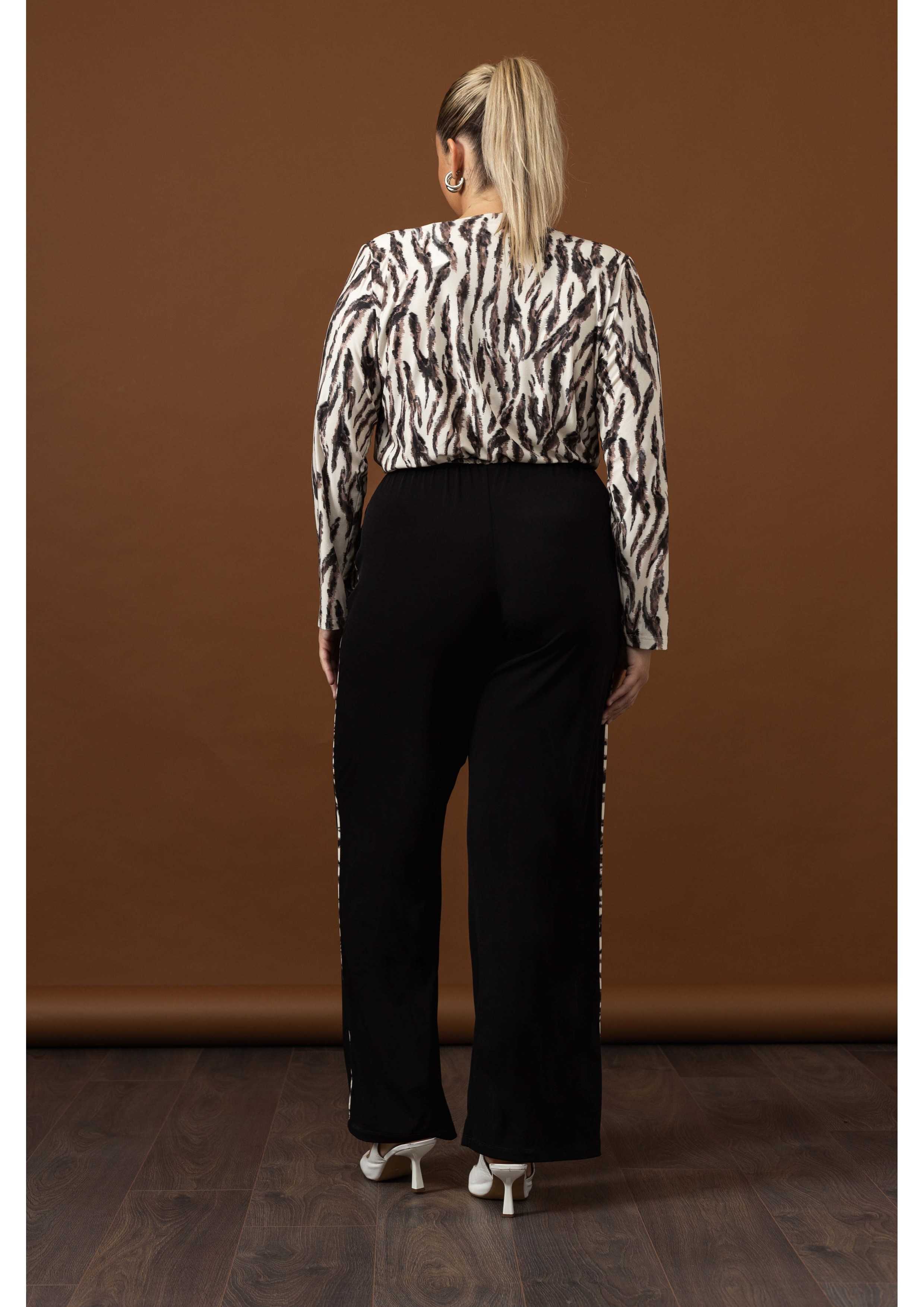 Macacão em malha lisa e estampado tigresa, decote em trespasse, manga comprida, calça com bolsos laterais e vivo, corpo estampado, calça lisa. Leva cinto de metal. Modelo: Altura 1.70m e está a vestir o tamanho 2XL, na cor preto. |