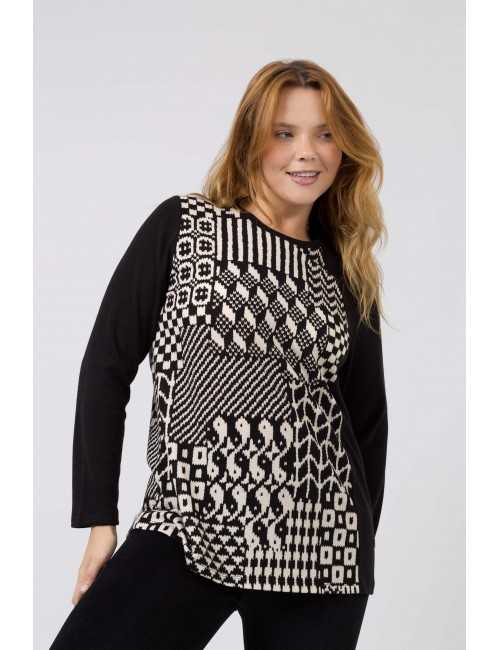 Camisola em malha lisa com encaixe frente e costas em malha estampada. Decote redondo. Disponível em Tamanhos Grandes Produto de desenho e fabrico próprio. Somos uma marca de confeção de vestuário com mais de 50 anos de experiência Modelo: Altura 1.70m e está a vestir o tamanho XL.
