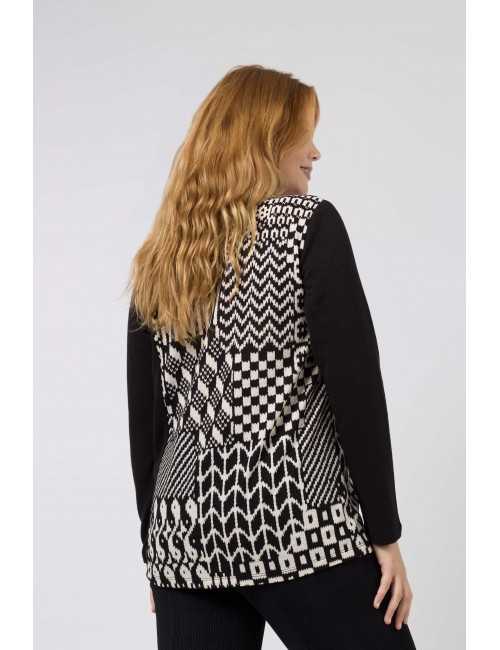 Camisola em malha lisa com encaixe frente e costas em malha estampada. Decote redondo.