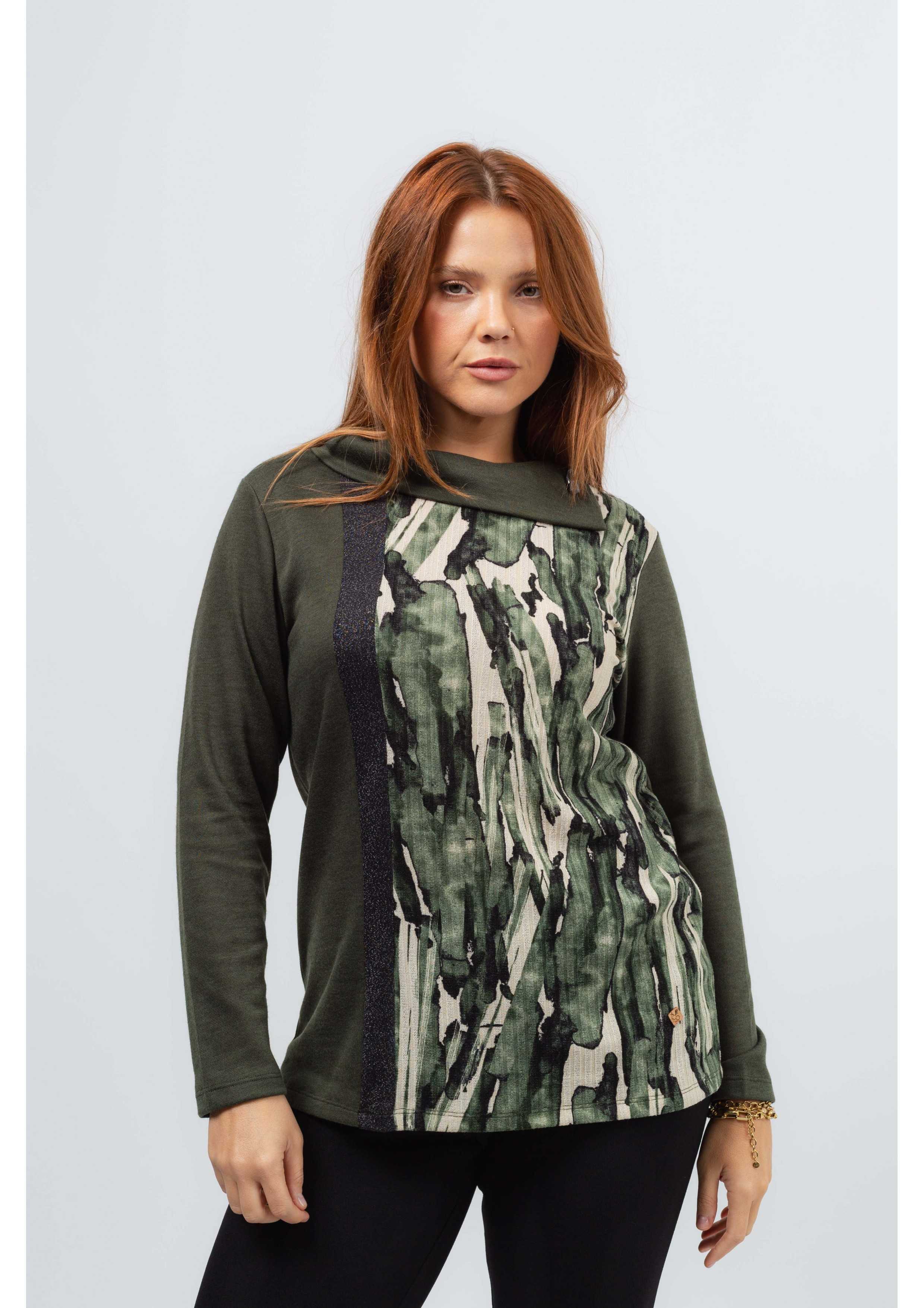 Camisola em malha lisa, com dois encaixes na frente, um estampado outro em malha lurex. Manga comprida. Decote redondo com gola caída aberta na lateral com botão fantasia. Disponível em Tamanhos Grandes Produto de desenho e fabrico próprio. Somos uma marca de confeção de vestuário com mais de 50 anos de experiência Modelo: Altura 1.70m e está a vestir o tamanho XL.