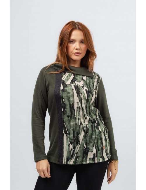 Camisola em malha lisa, com dois encaixes na frente, um estampado outro em malha lurex. Manga comprida. Decote redondo com gola caída aberta na lateral com botão fantasia.