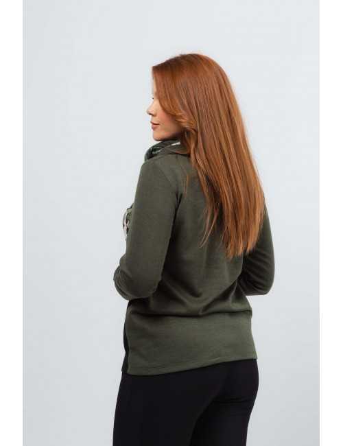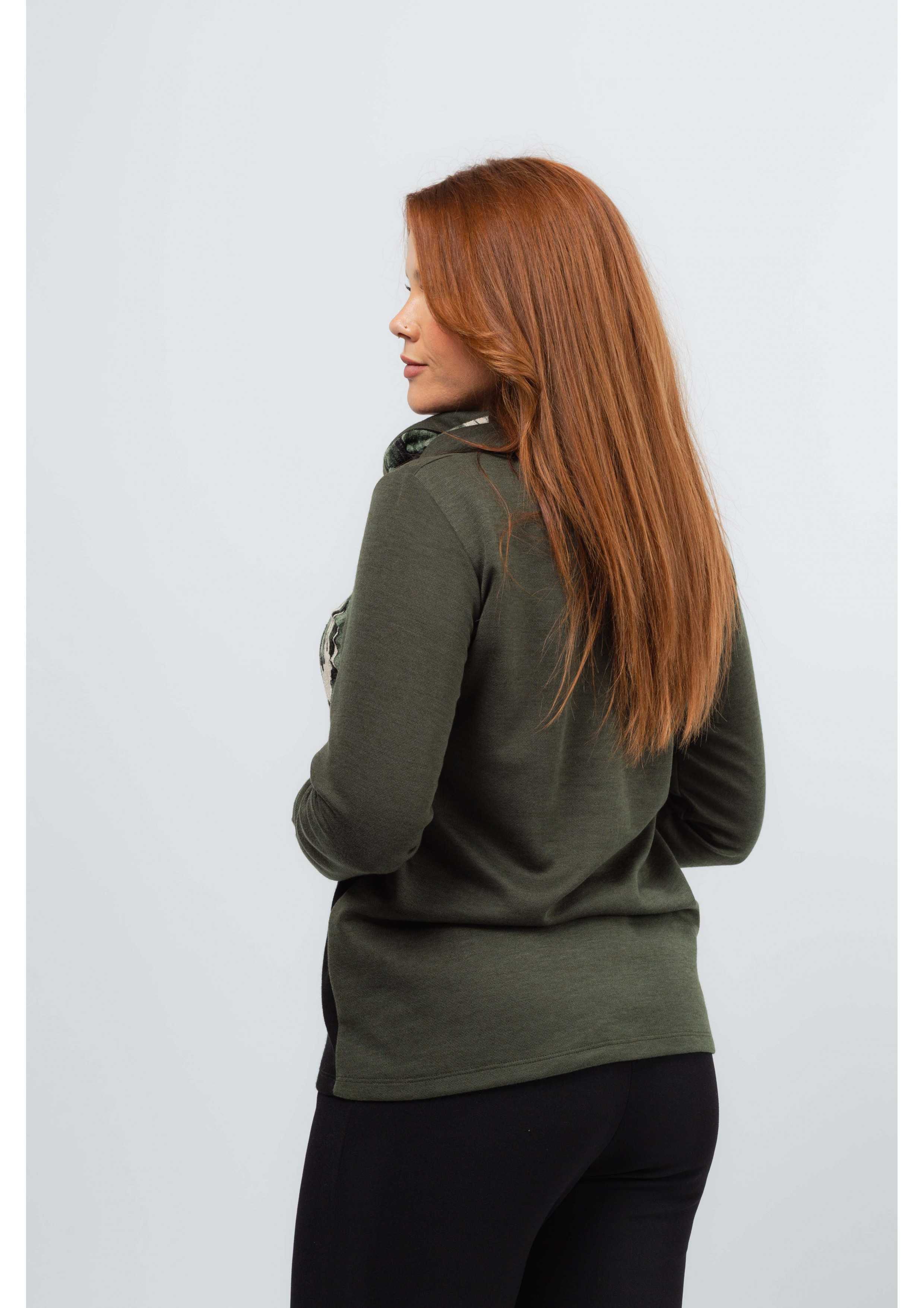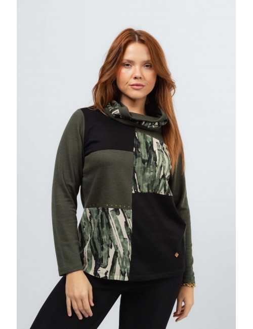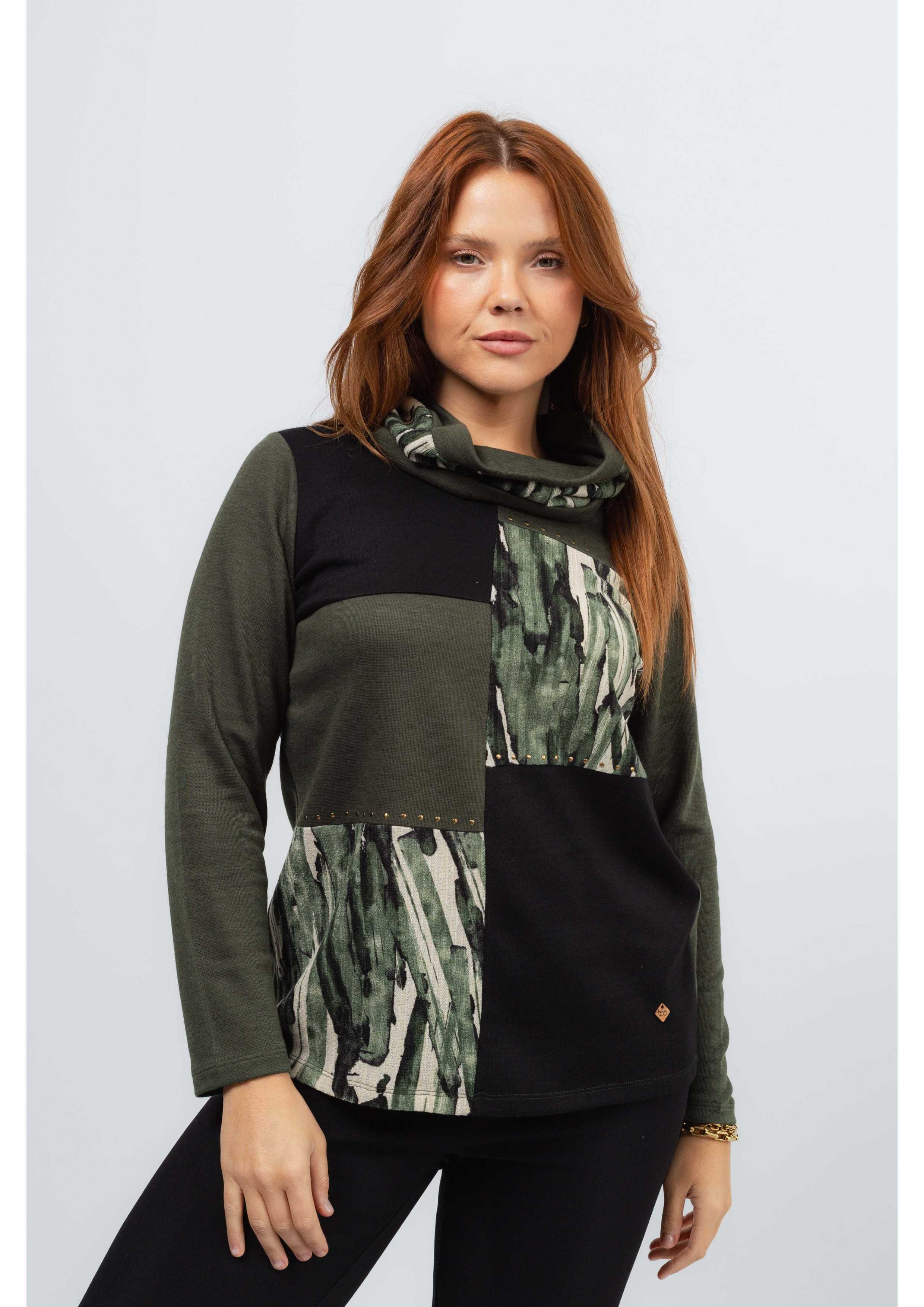 Túnica em malha lisa, com encaixes na frente lisos e estampados tons verdes. Levas tranfer em pedras nos encaixes. Manga comprida, decote redondo. Rachas laterais. Gola 2 cores solta.