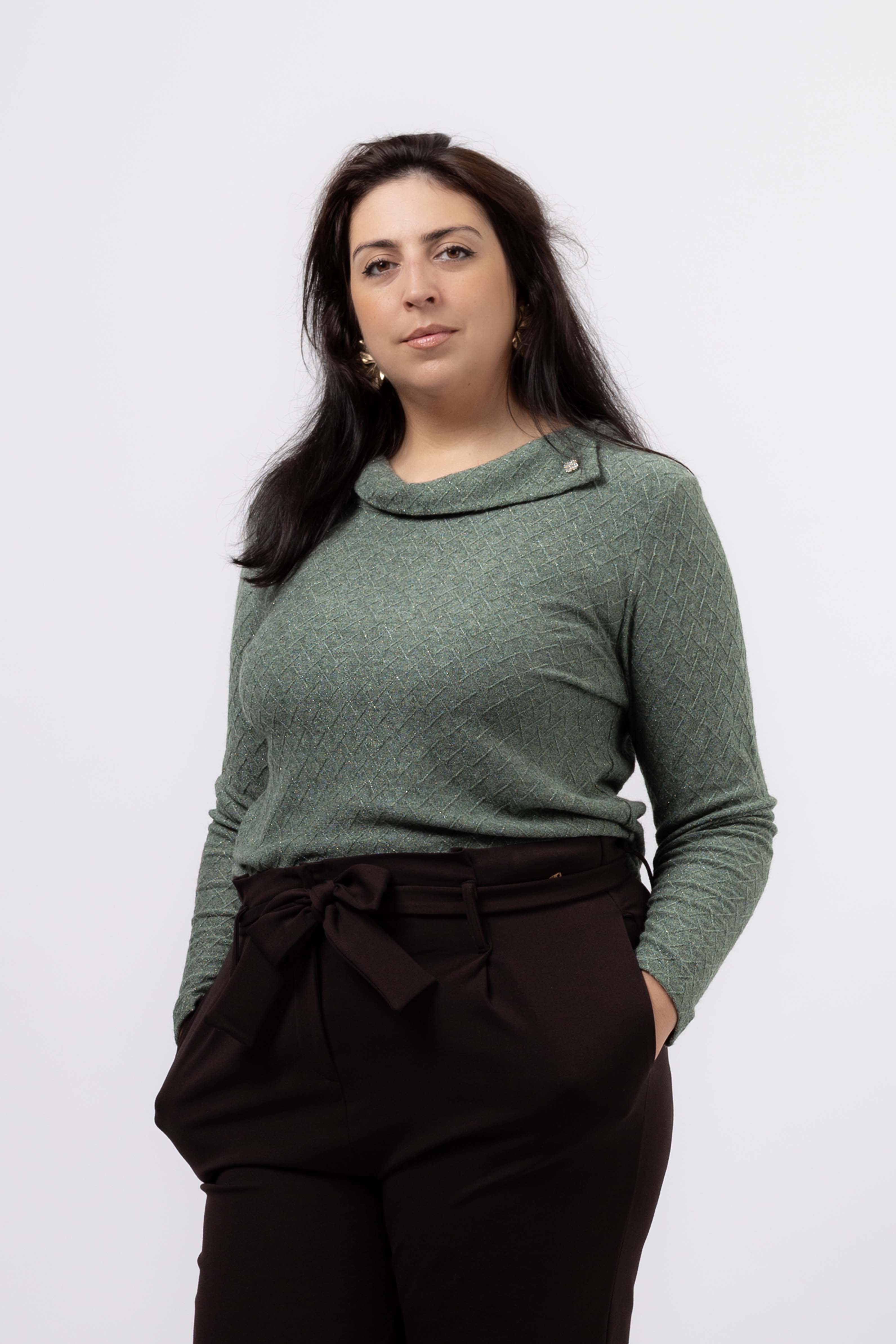 Camisola em malha com brilho, fola aberta na lateral caída. Leva um brilhante aplicado. Manga comprida, corte a direito.