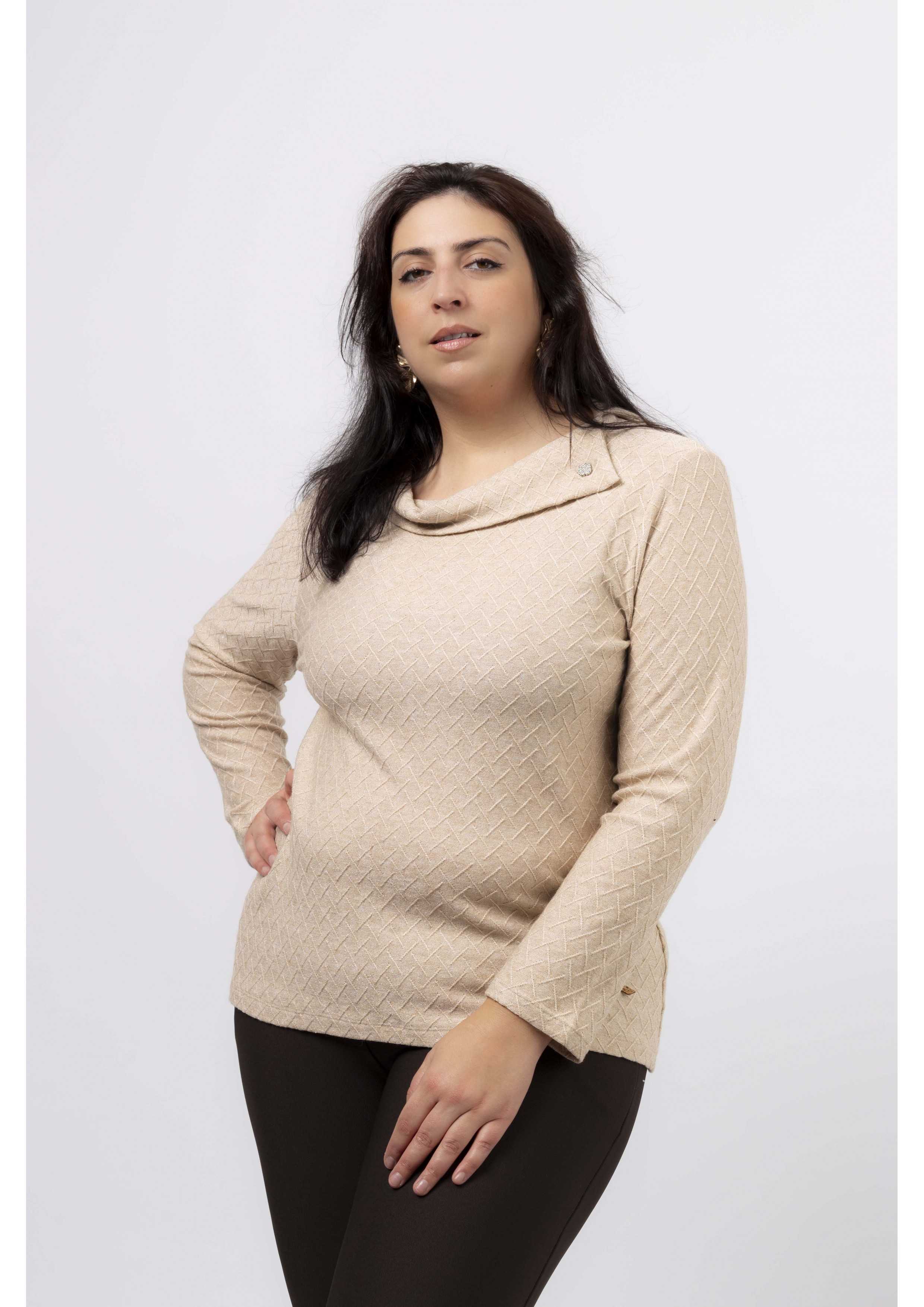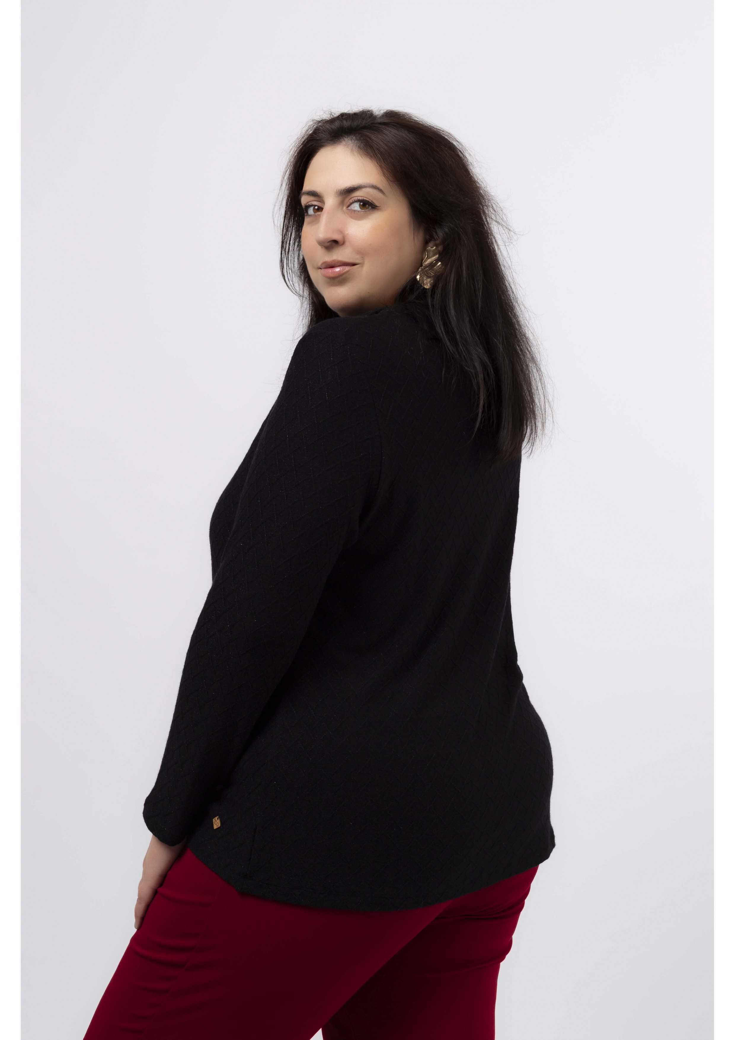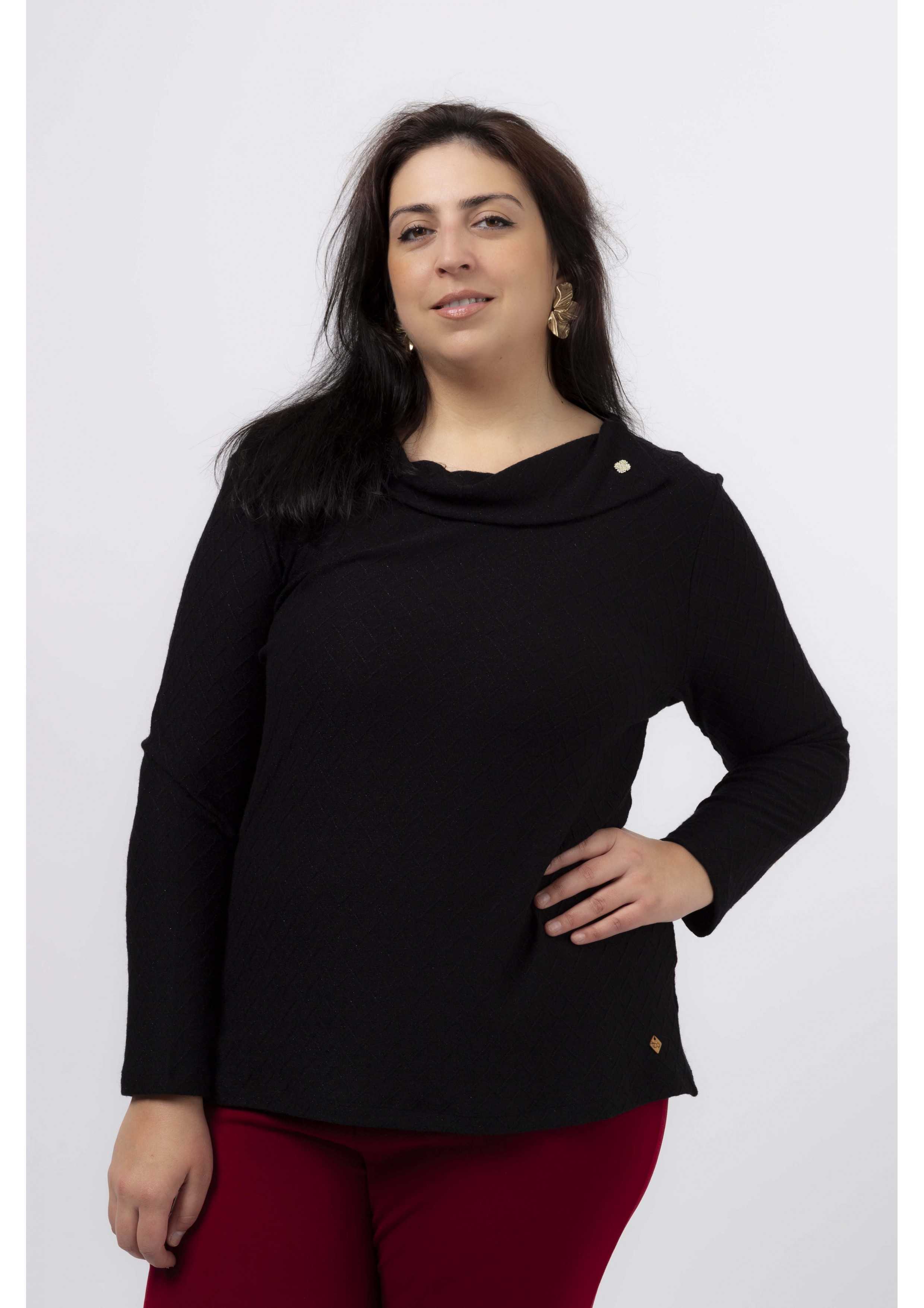 Camisola em malha com brilho, fola aberta na lateral caída. Leva um brilhante aplicado. Manga comprida, corte a direito. Disponível em Tamanhos Grandes Produto de desenho e fabrico próprio. Somos uma marca de confeção de vestuário com mais de 50 anos de experiência Modelo: Altura 1.82m e está a vestir o tamanho 3XL.