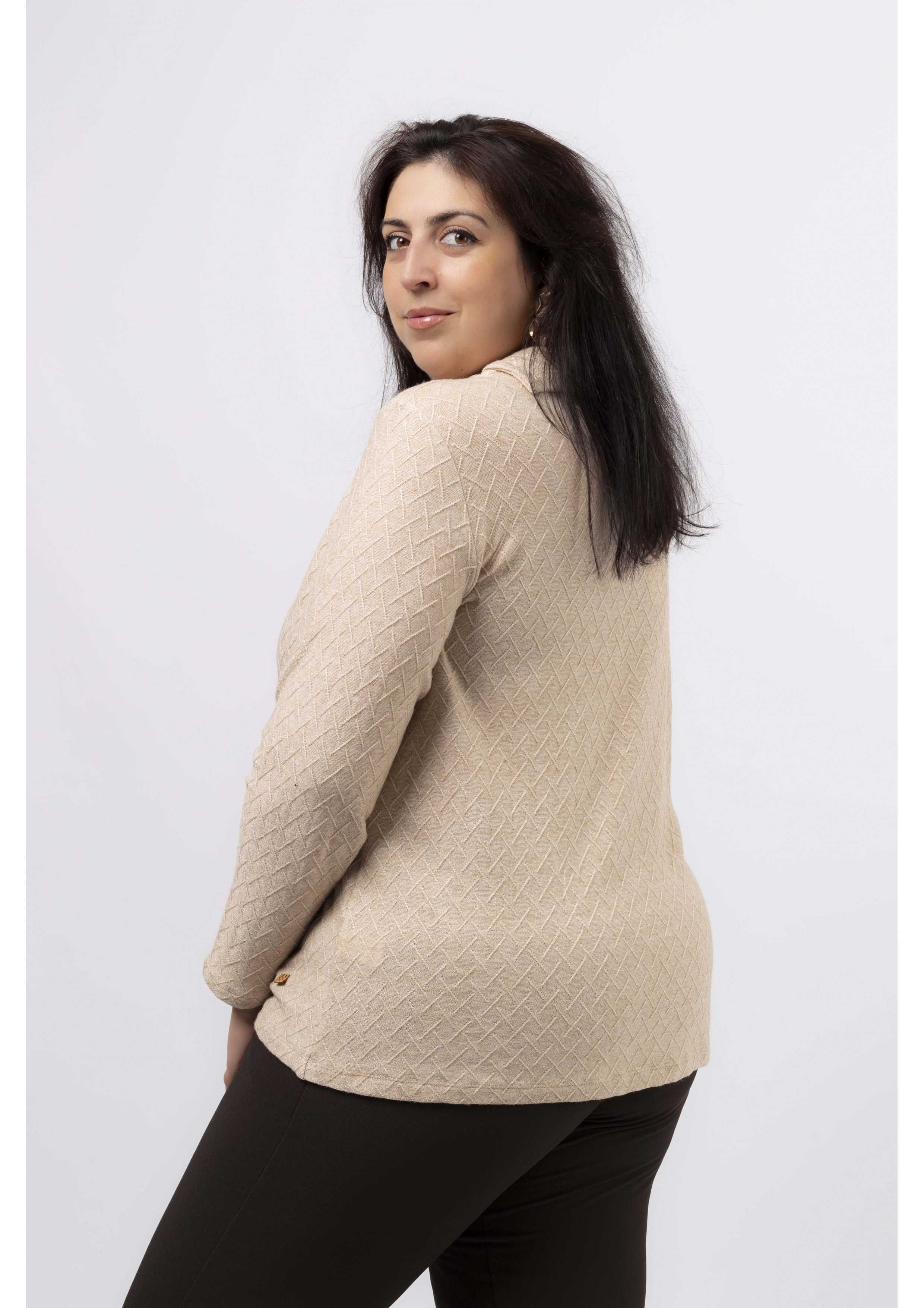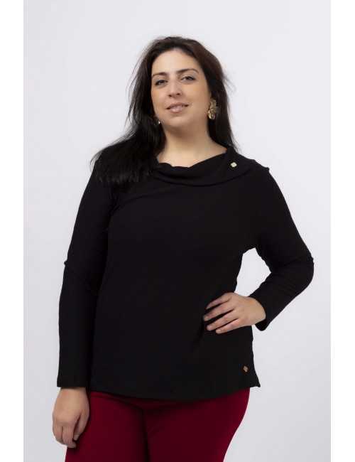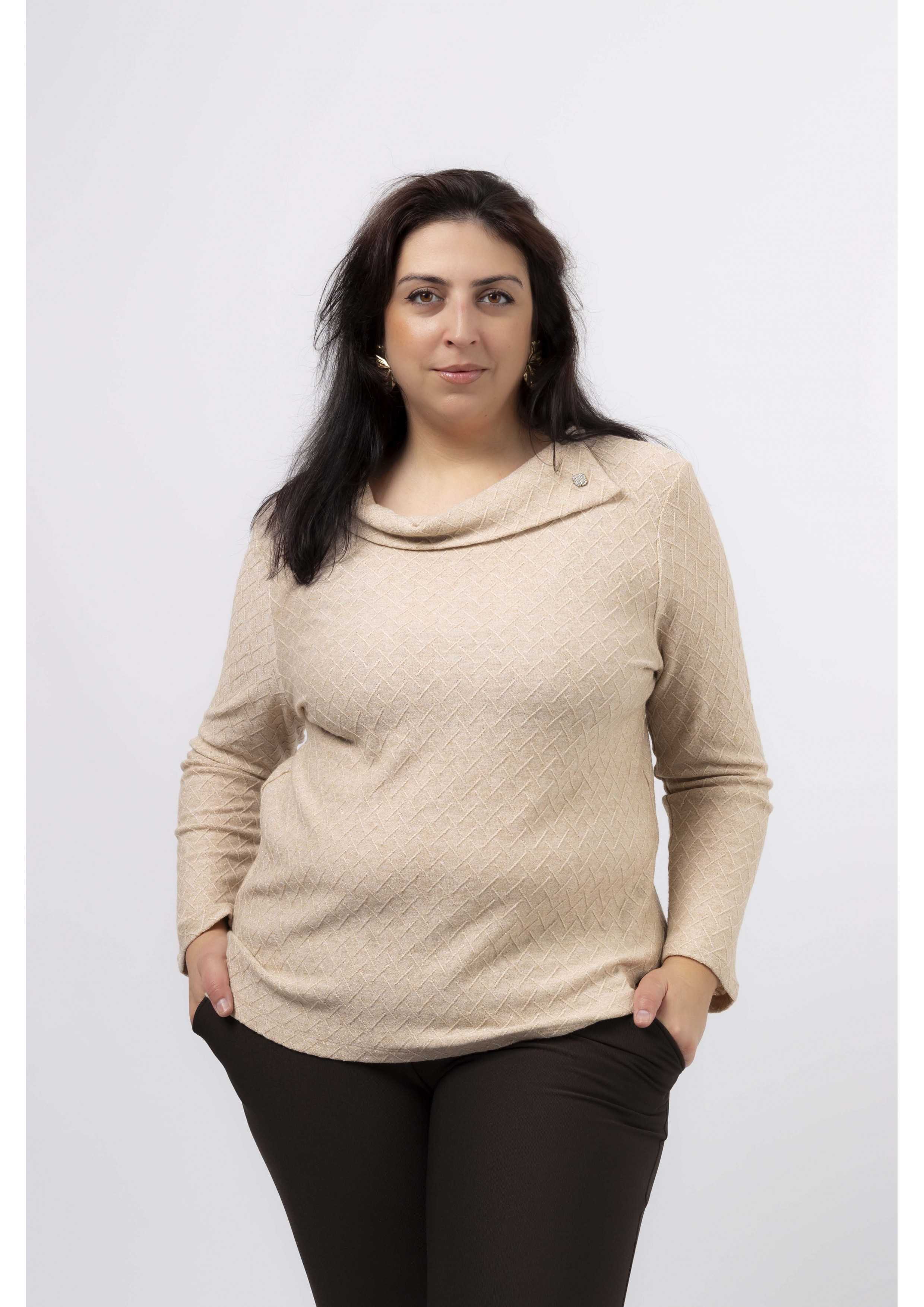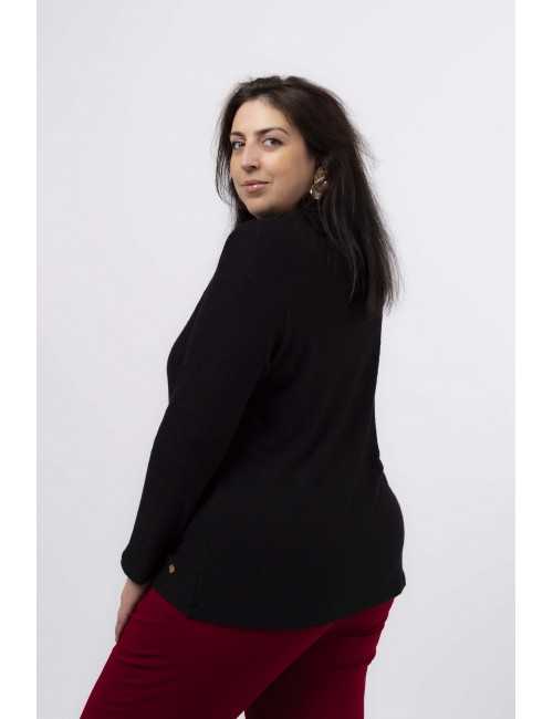 Camisola em malha com brilho, fola aberta na lateral caída. Leva um brilhante aplicado. Manga comprida, corte a direito. Disponível em Tamanhos Grandes Produto de desenho e fabrico próprio. Somos uma marca de confeção de vestuário com mais de 50 anos de experiência Modelo: Altura 1.82m e está a vestir o tamanho 3XL.