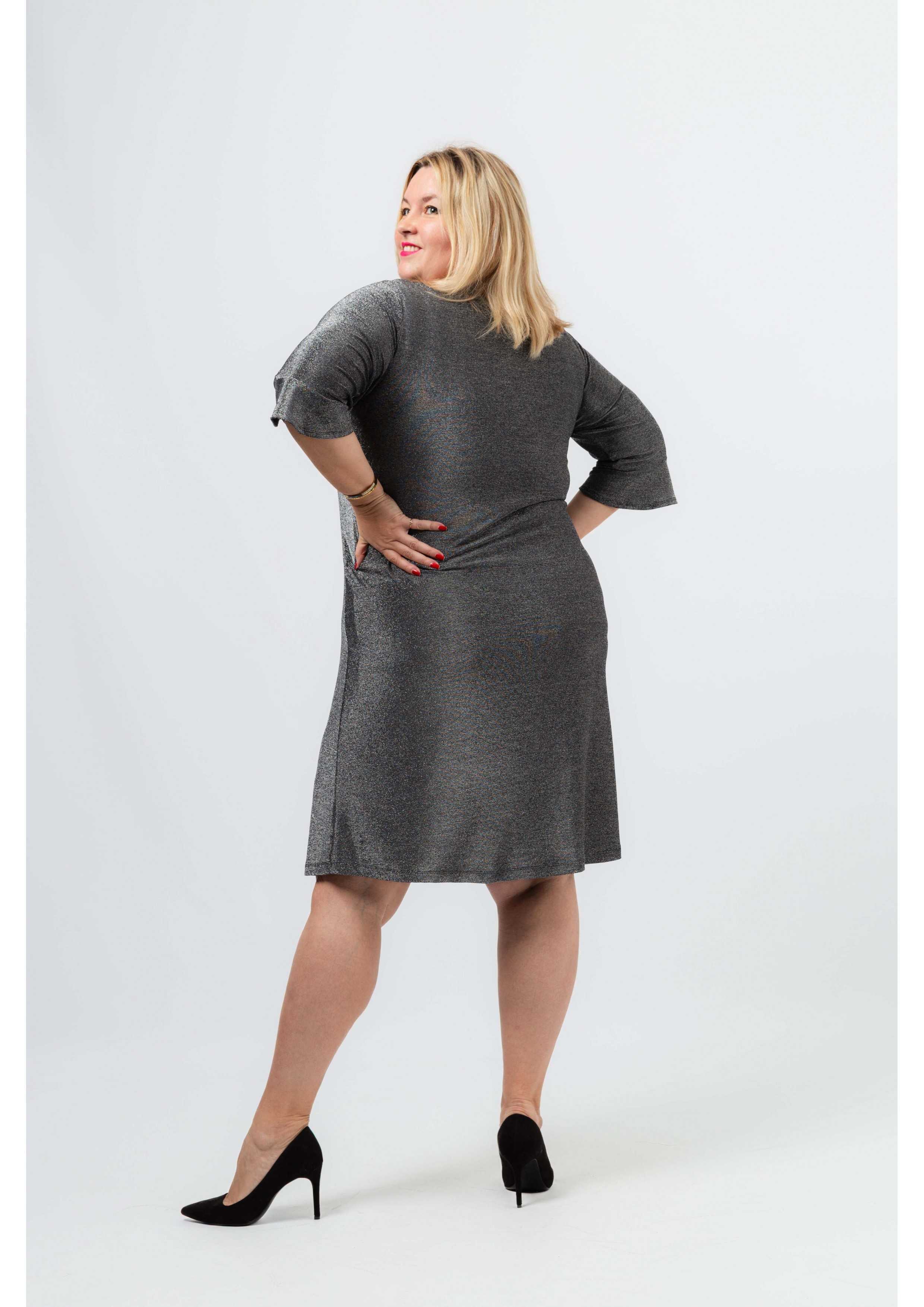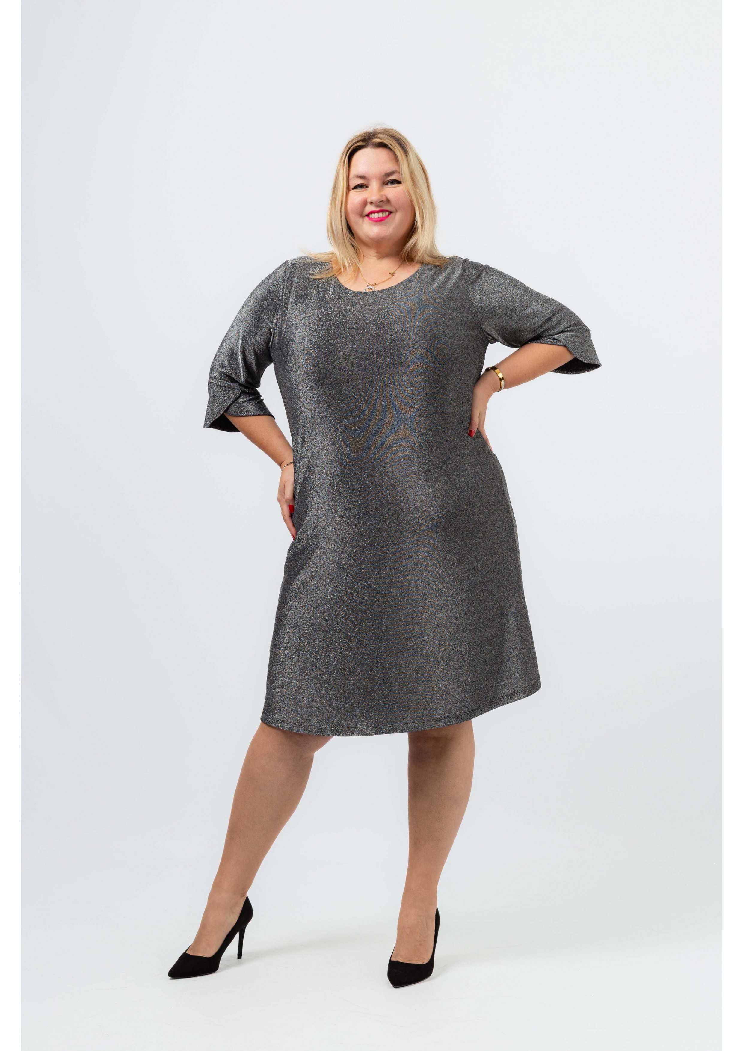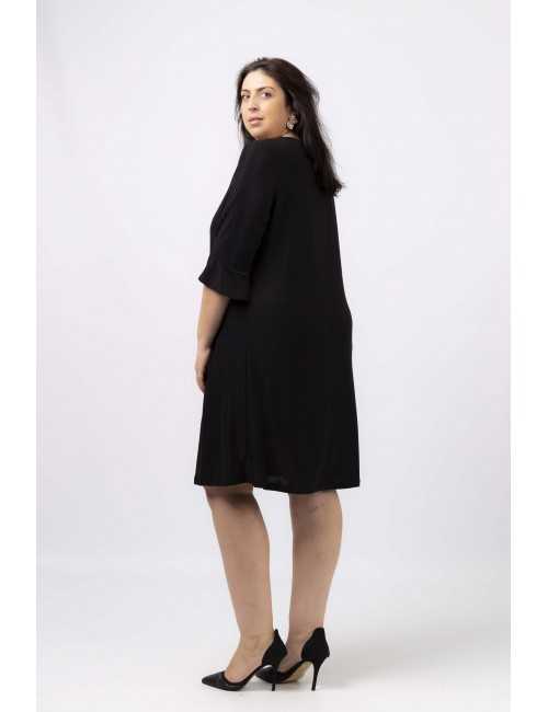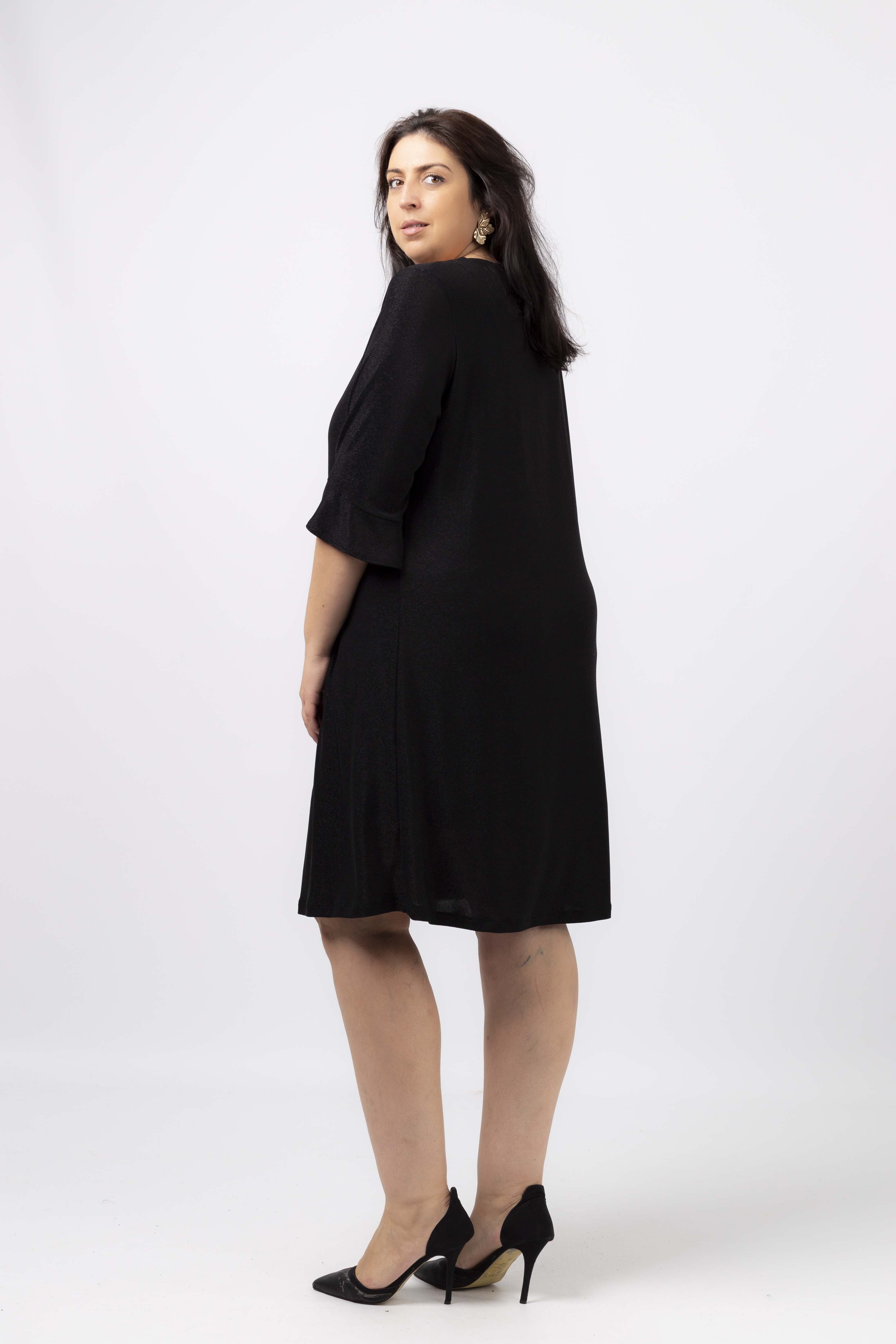 Vestido em malha lisa, lurex. manga 3/4 com folho aplicado em trespasse. Decote redondo. Modelo forrado ligeiramente evasé.