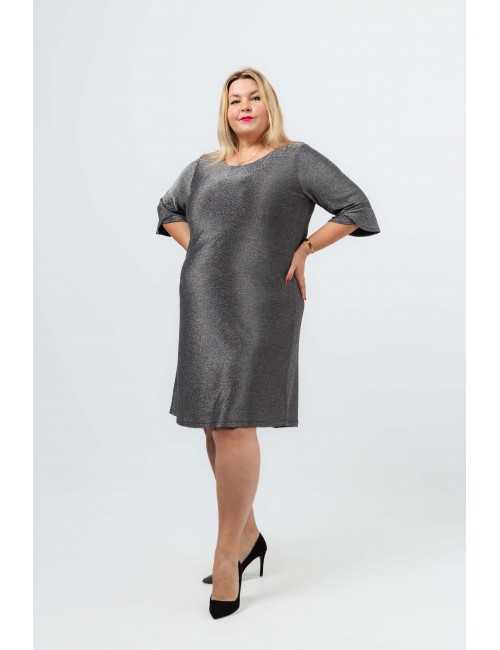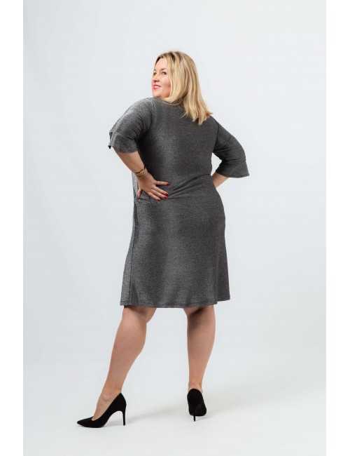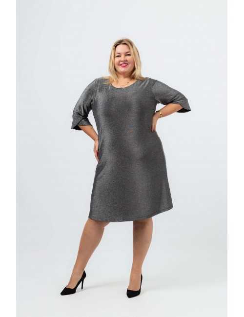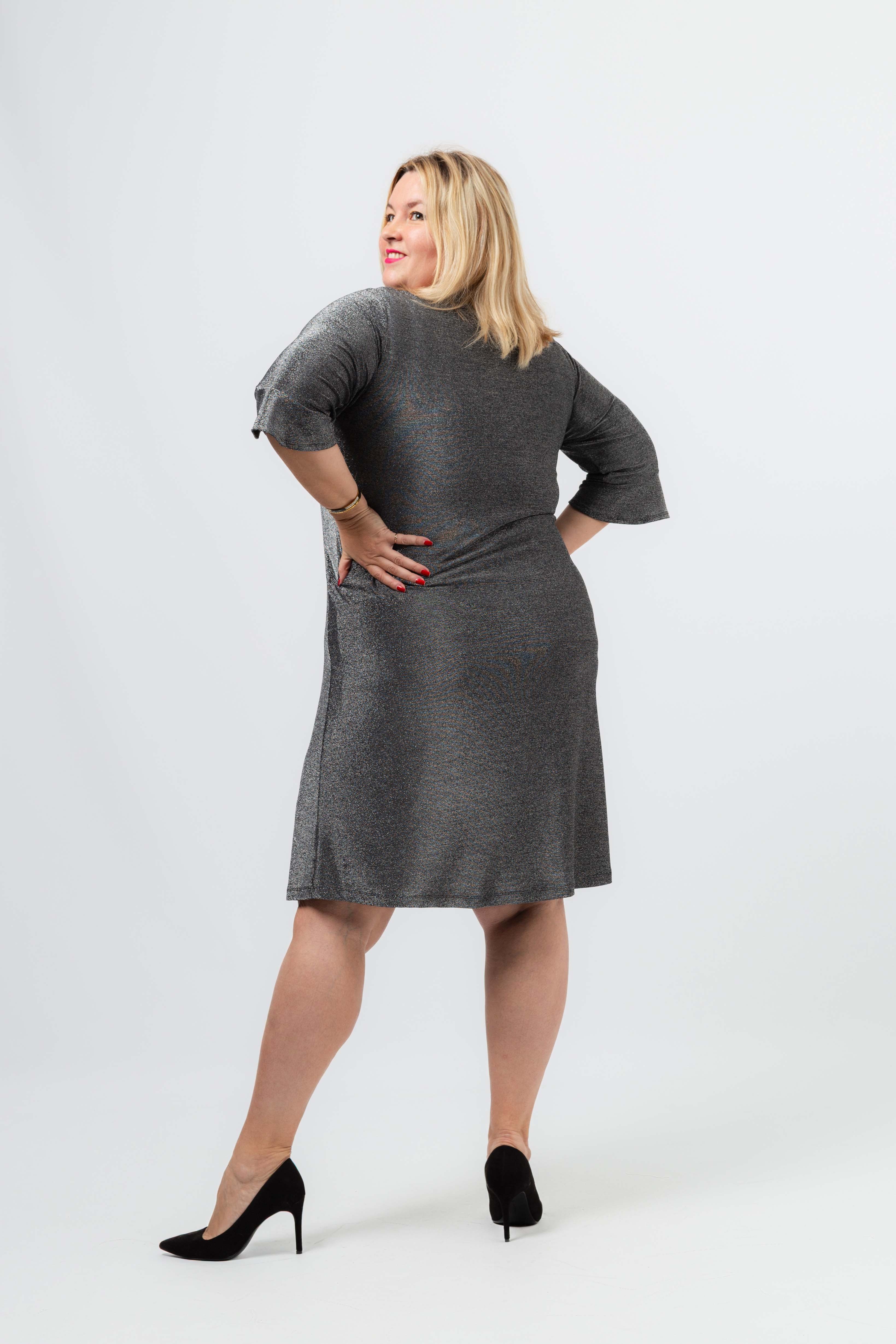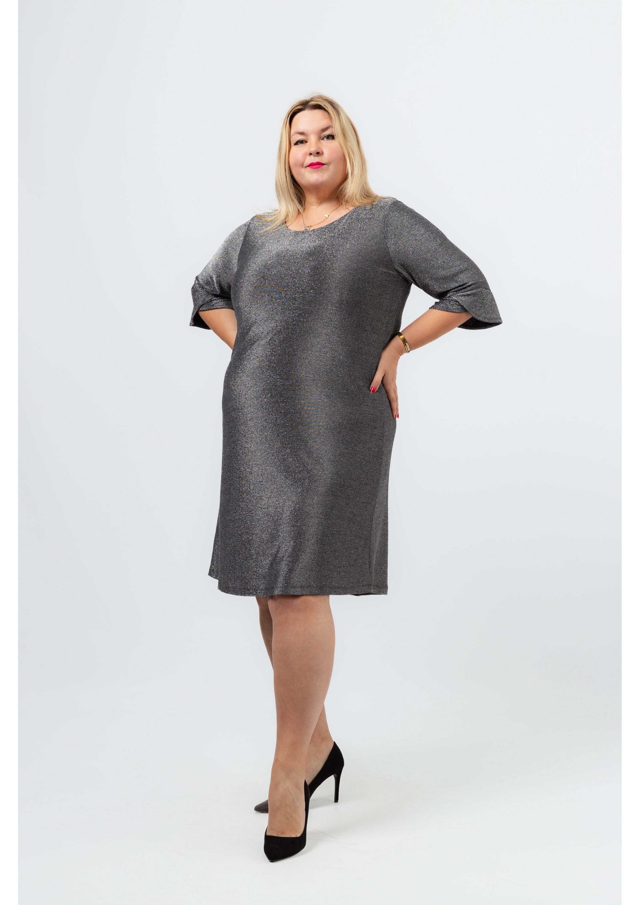 Vestido em malha lisa, lurex. manga 3/4 com folho aplicado em trespasse. Decote redondo. Modelo forrado ligeiramente evasé.
