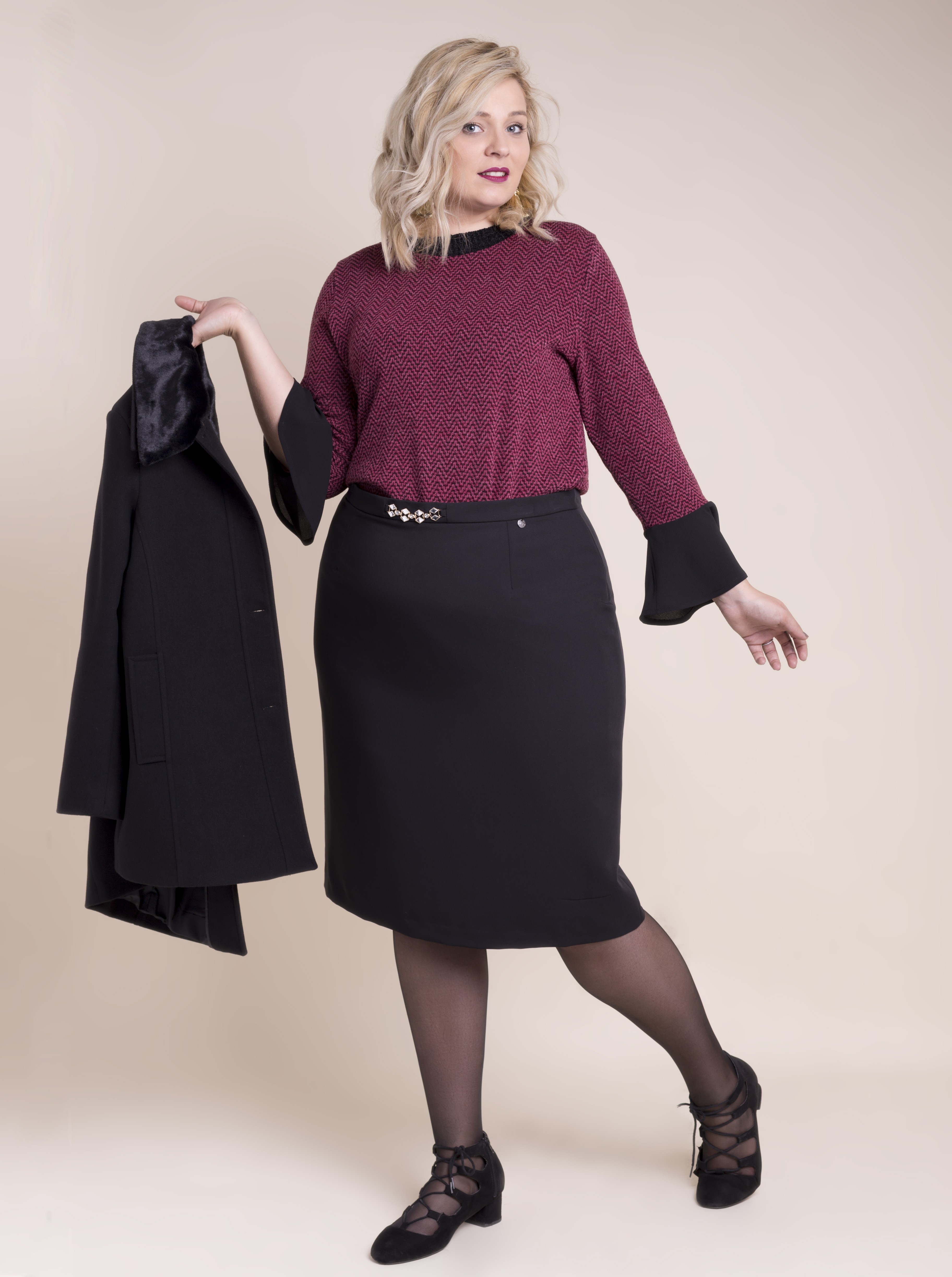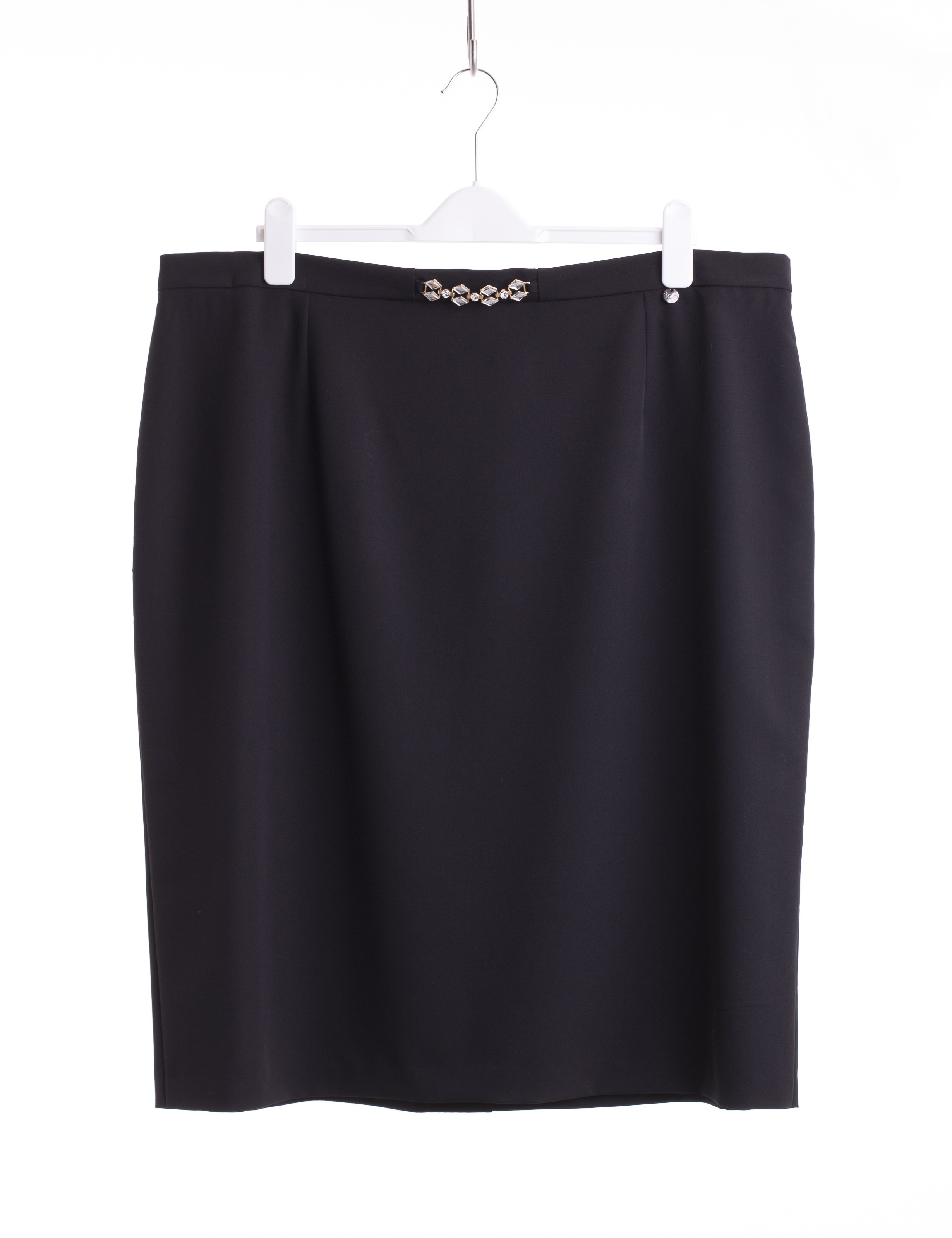 Saia Lisa Aplicação de pedras na Frente. Coleção: Primavera Verão Modelo: Altura 1.70m e está a vestir o tamanho 2XL. 70%poliester 25%viscose 5%elastano |