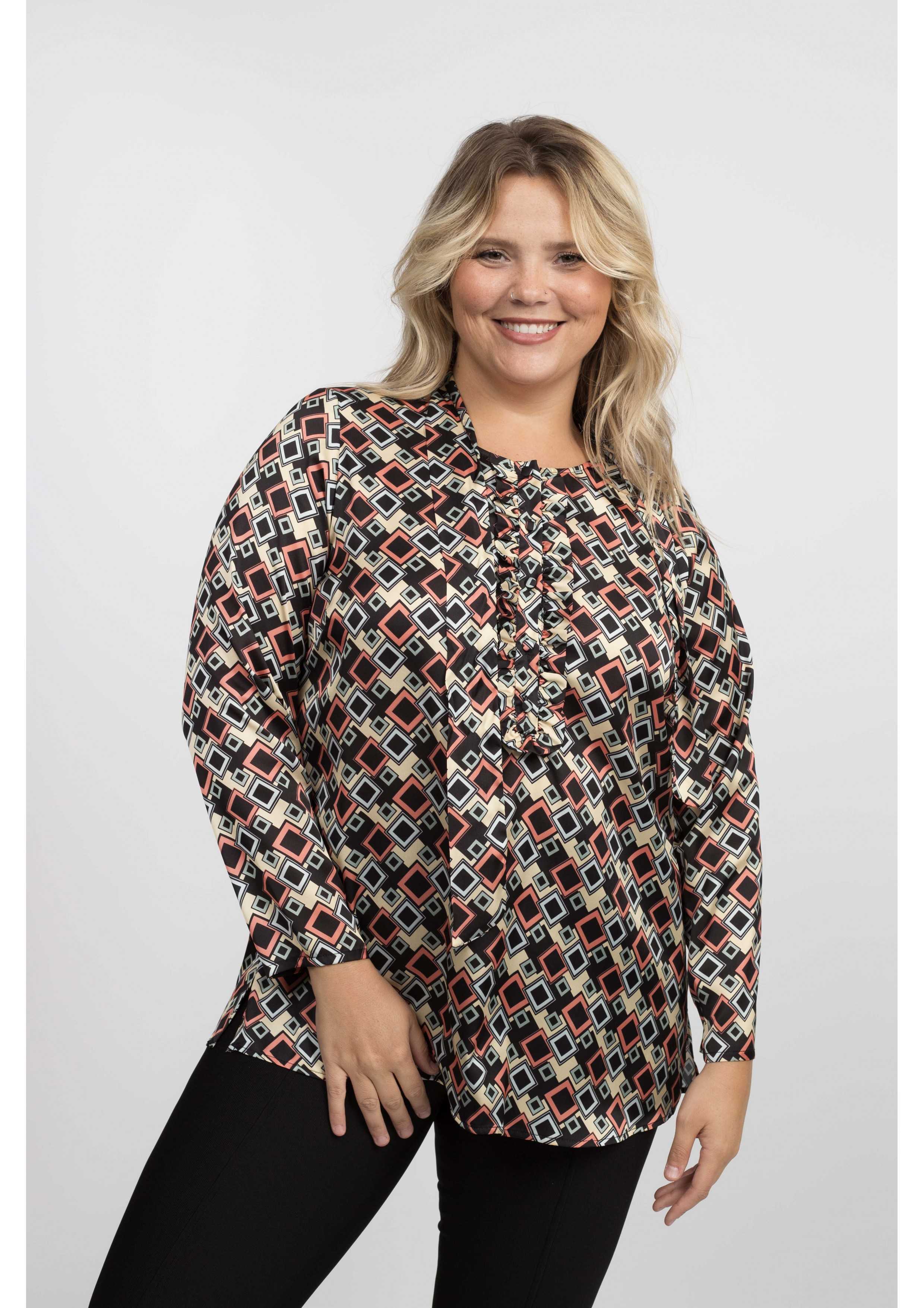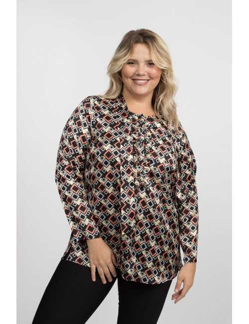 Blusa de manga comprida, folho na frente e laço no decote. Coleção: Outono Inverno Disponível em Tamanhos Grandes Produto de desenho e fabrico próprio. Somos uma marca de confeção de vestuário com mais de 50 anos de experiência Modelo: Altura 1.70m e está a vestir o tamanho 2XL.