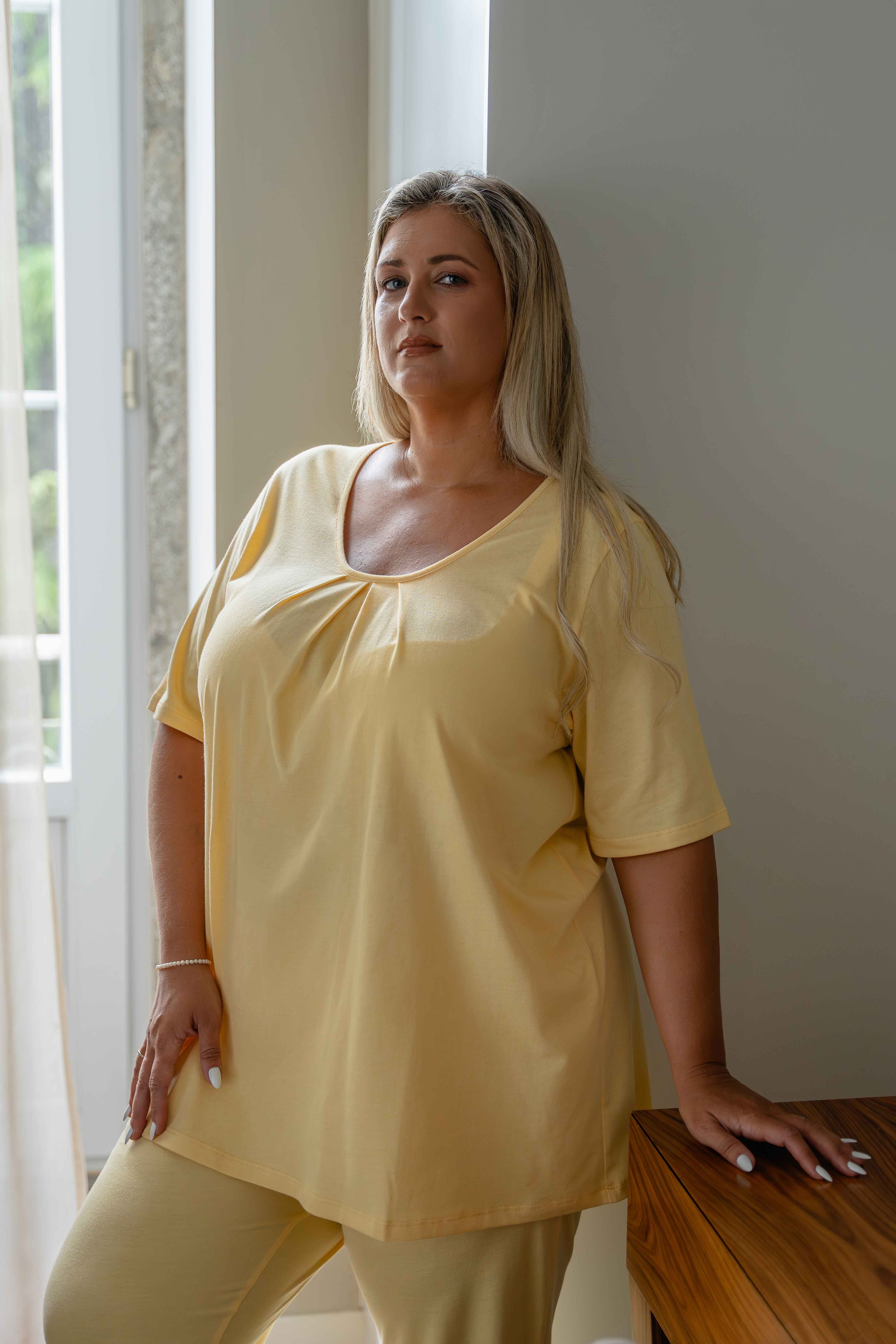 Pijama composto por t-shirt e corsário em malha lisa. Coleção: Primavera Verão Produto de desenho e fabrico próprio. Modelo: Altura 1.65m e está a vestir o tamanho 3XL. |