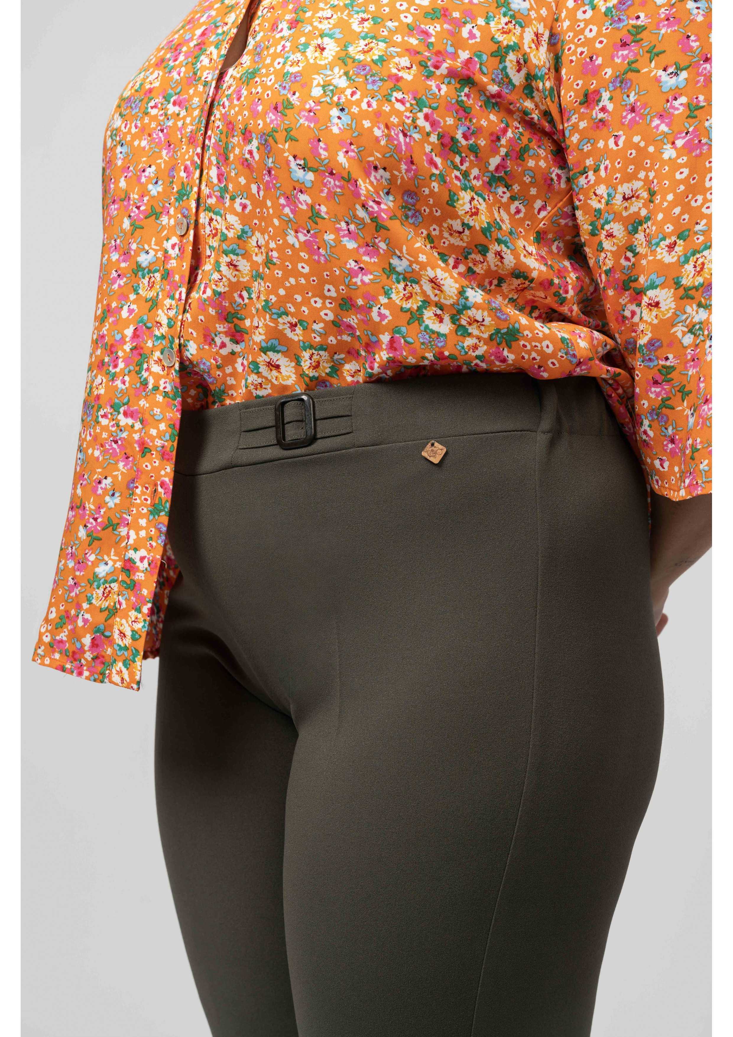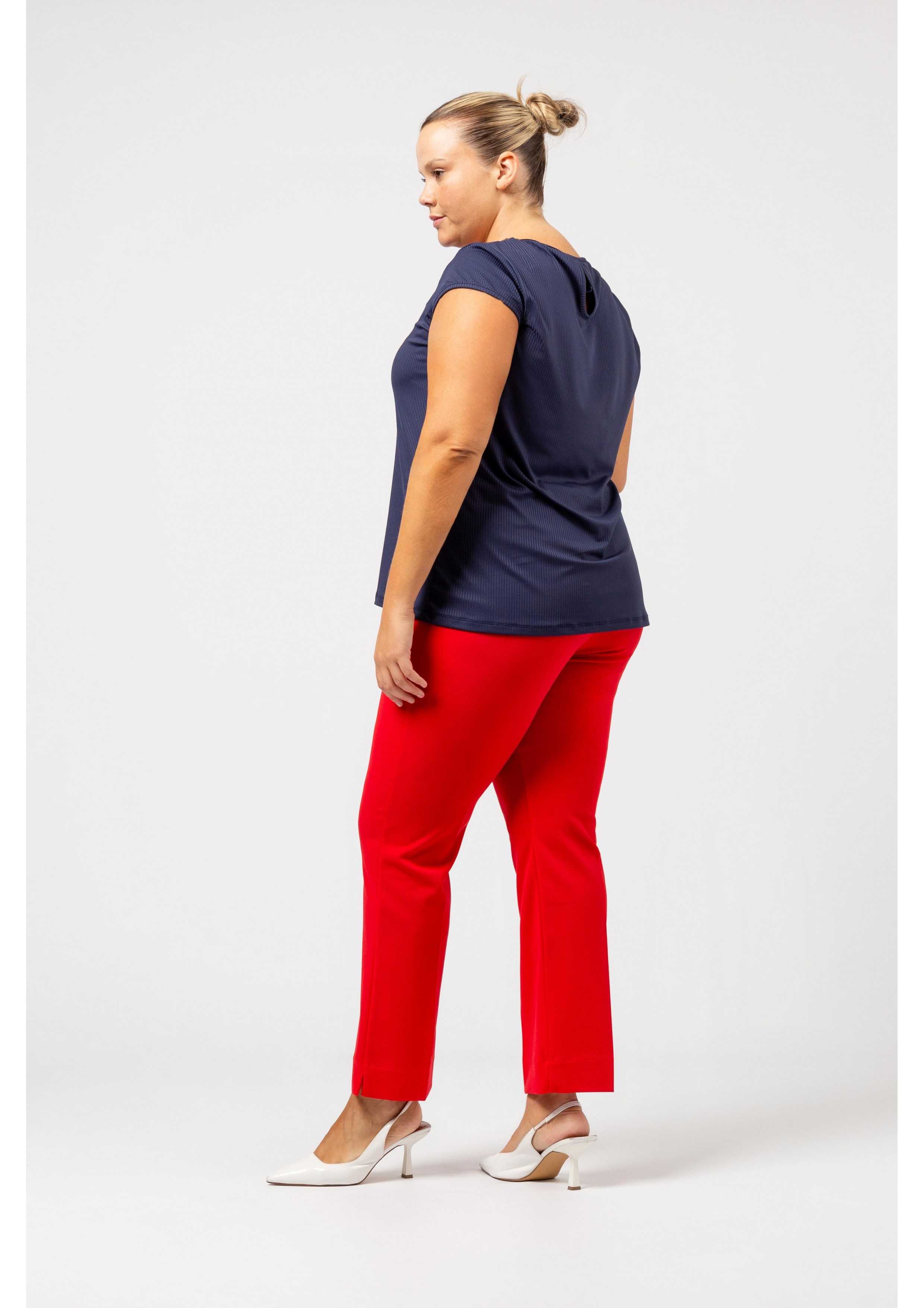 Calça em malha lisa com rachas nas laterais e cinto com duas fivelas a feitio e elástico na costa | Coleção: Primavera Verão | Modelo 1: Altura 1,67m e está a vestir o tamanho G na cor azulão | Modelo 2: Altura 1,70m e está a vestir o tamanho 2XL |