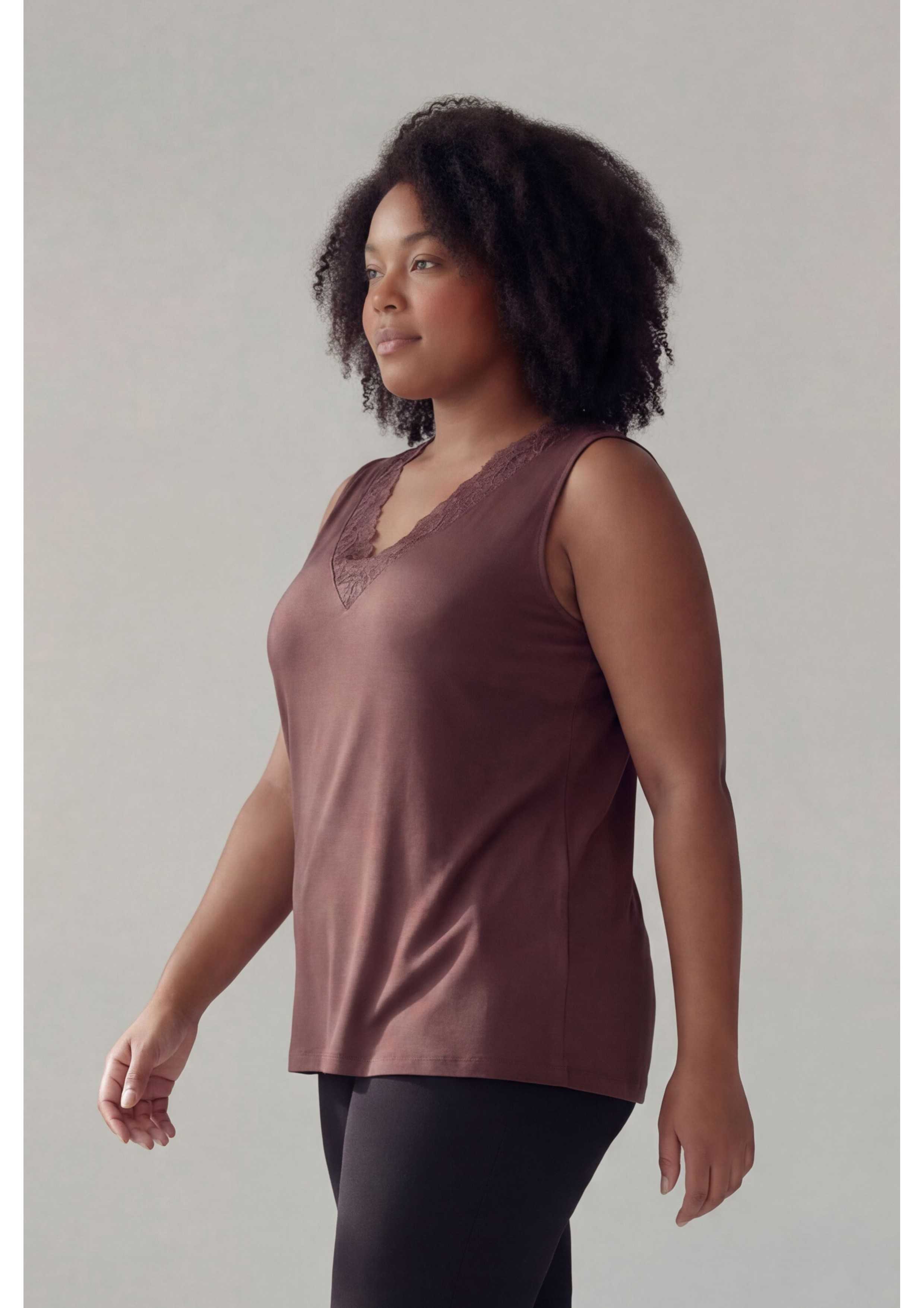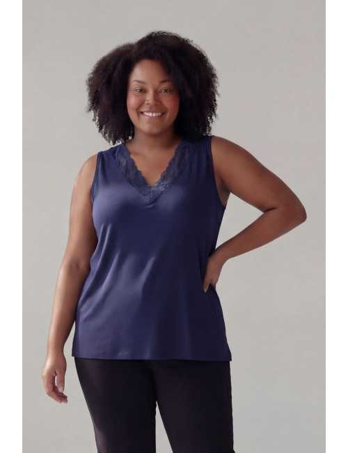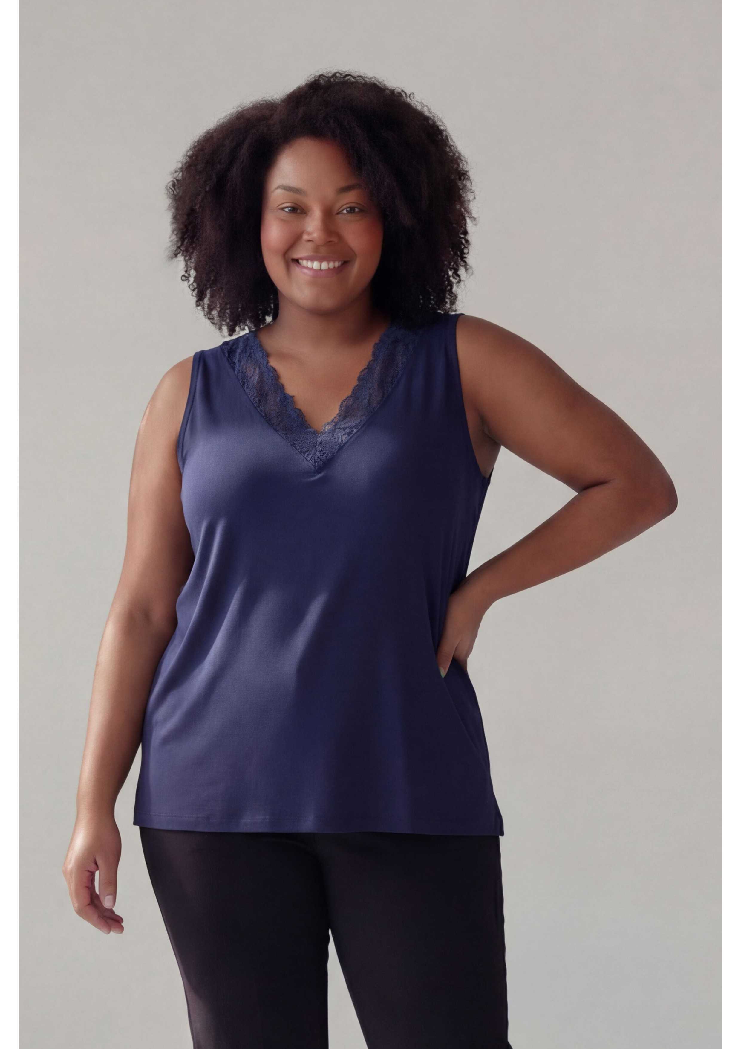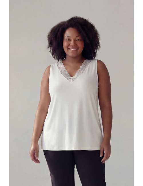 Top em malha lisa, corte a direito, decote em bico com aplicação de renda. Modelo: Altura 1.70m e está a vestir o tamanho XL. |