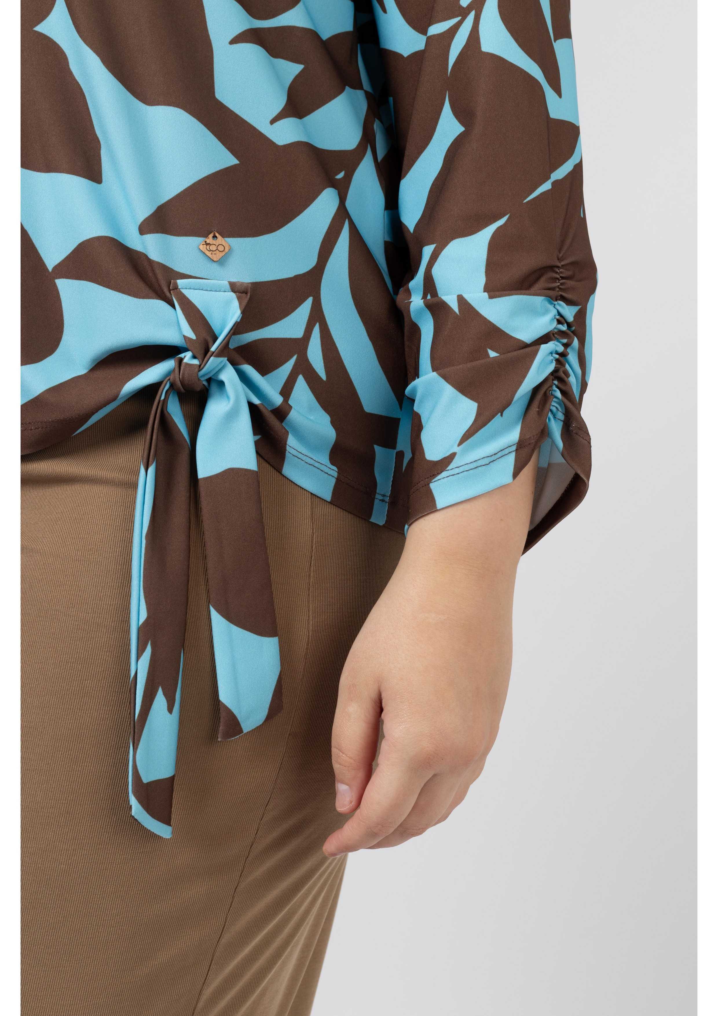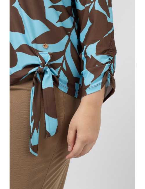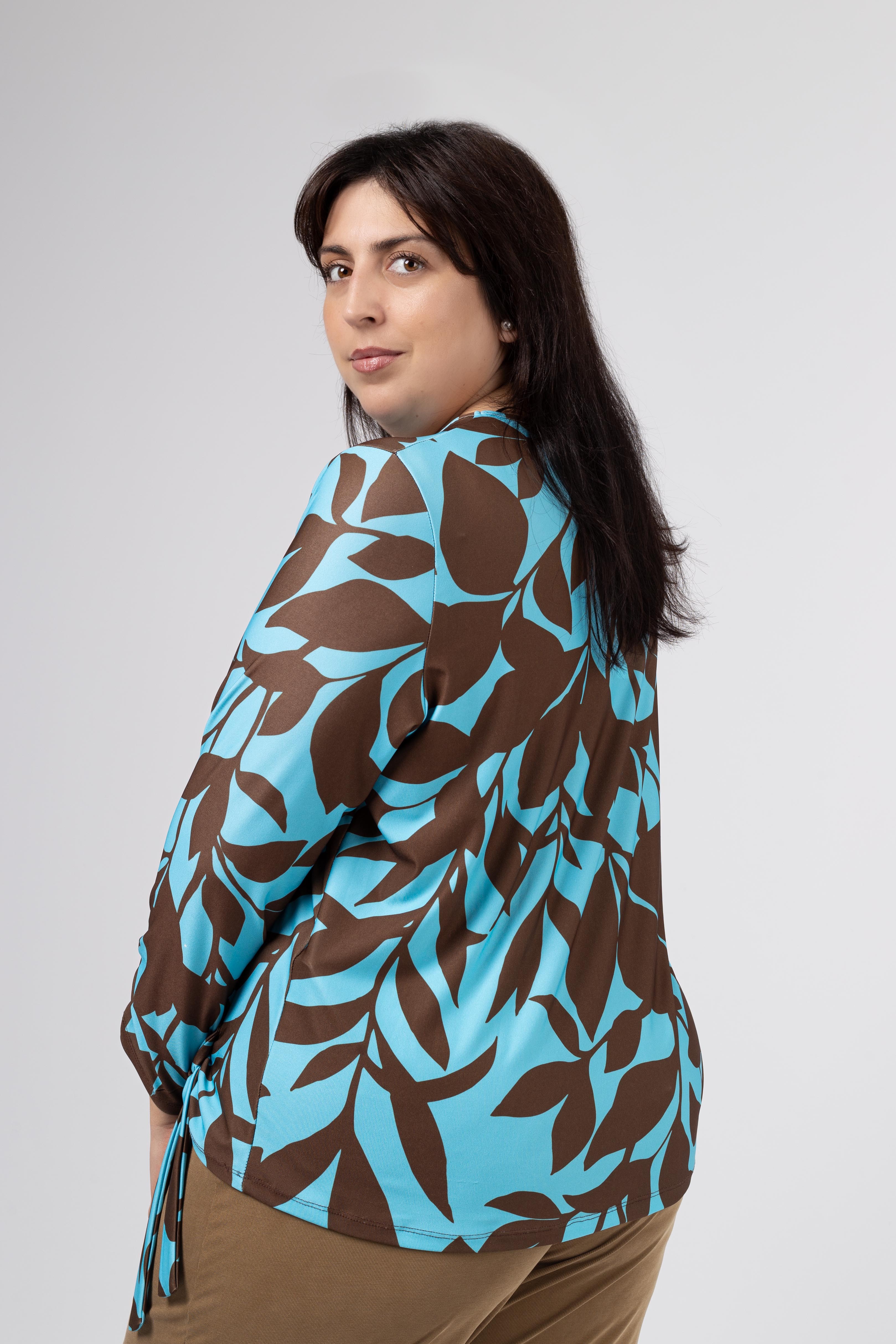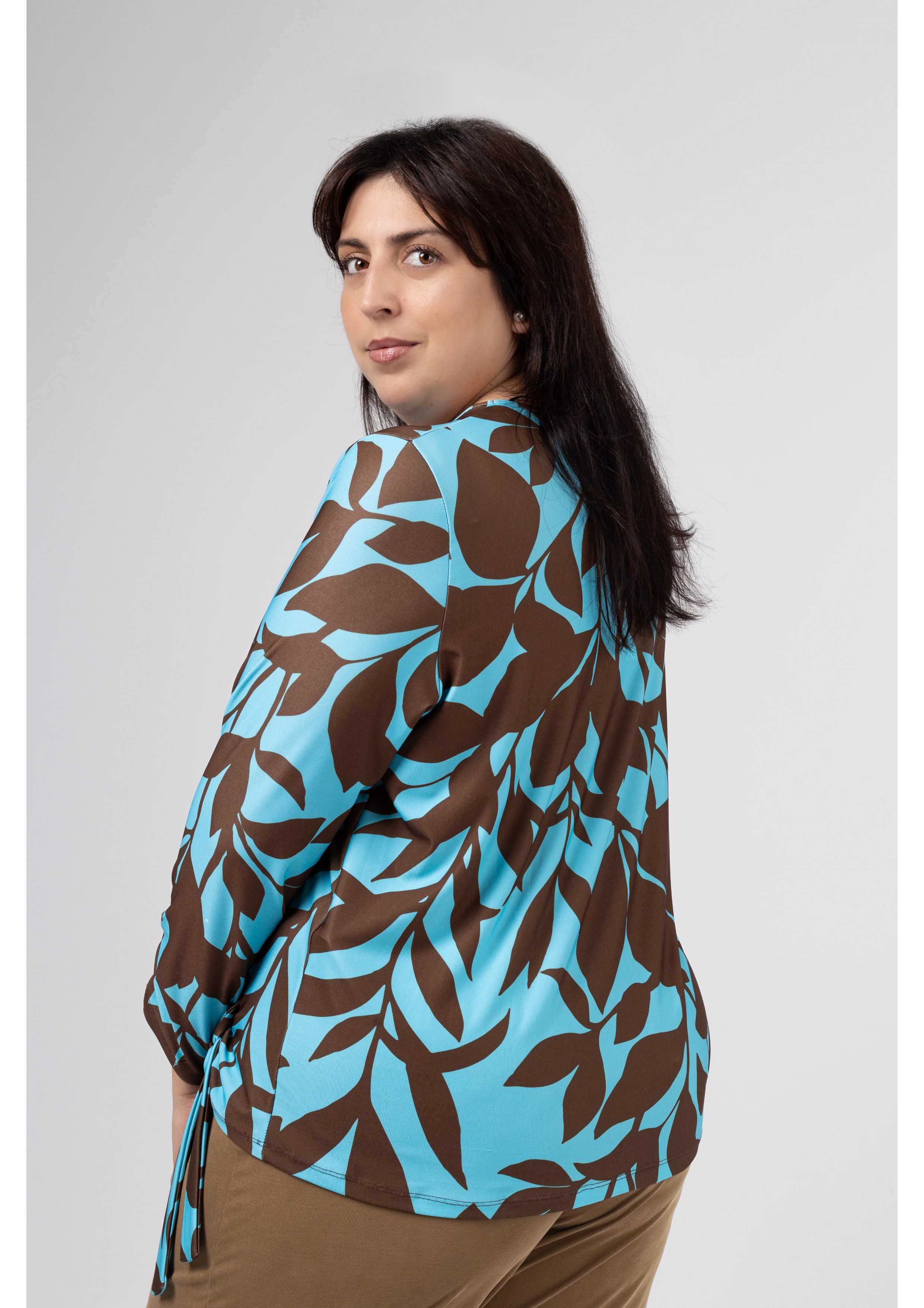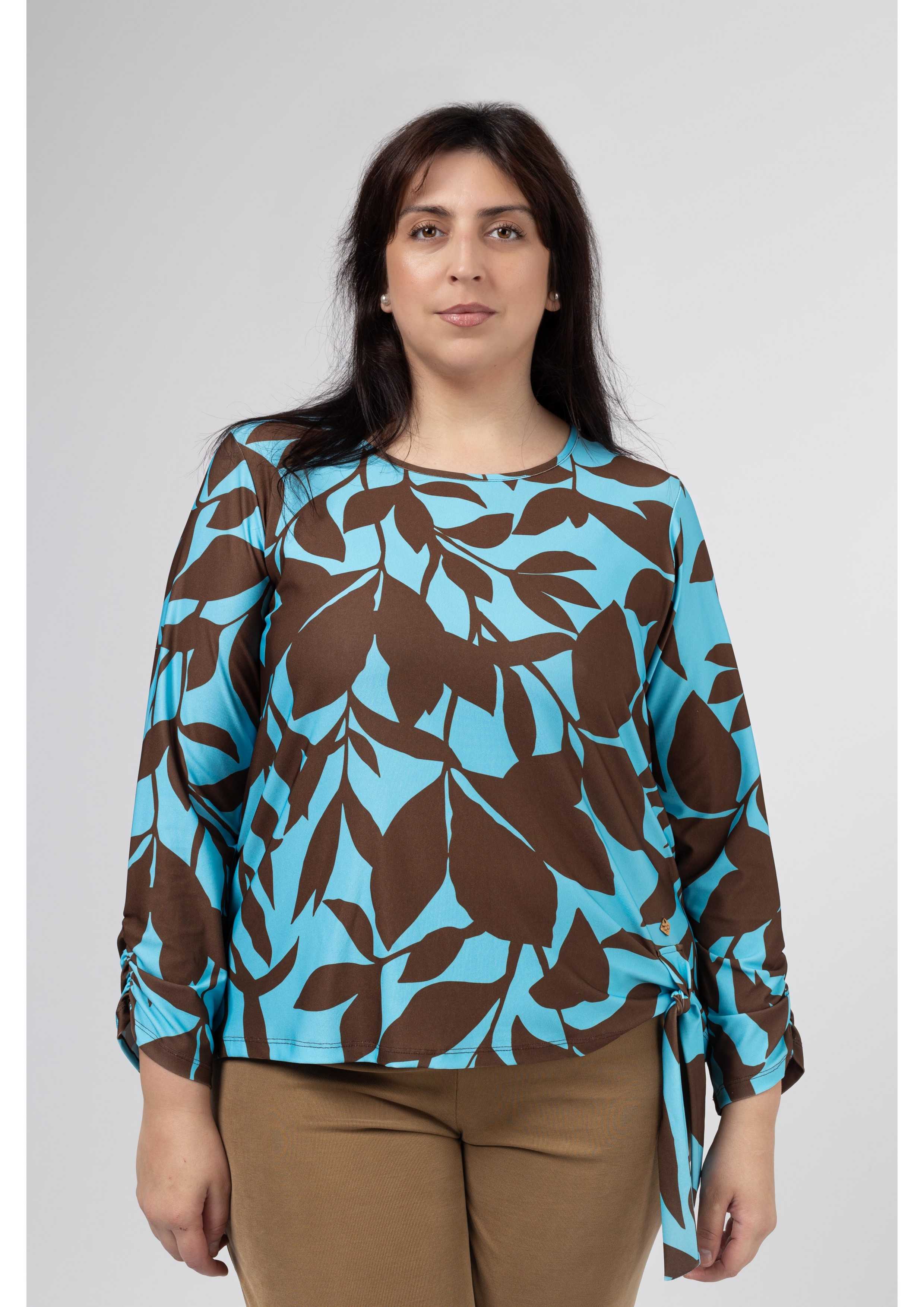 Túnica em malha estampada, decote redondo, manga comprida com elástico a rufar. Lateral esquerda com tira a fazer laço.