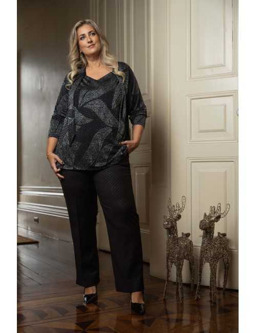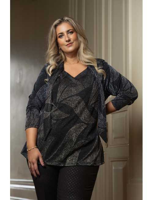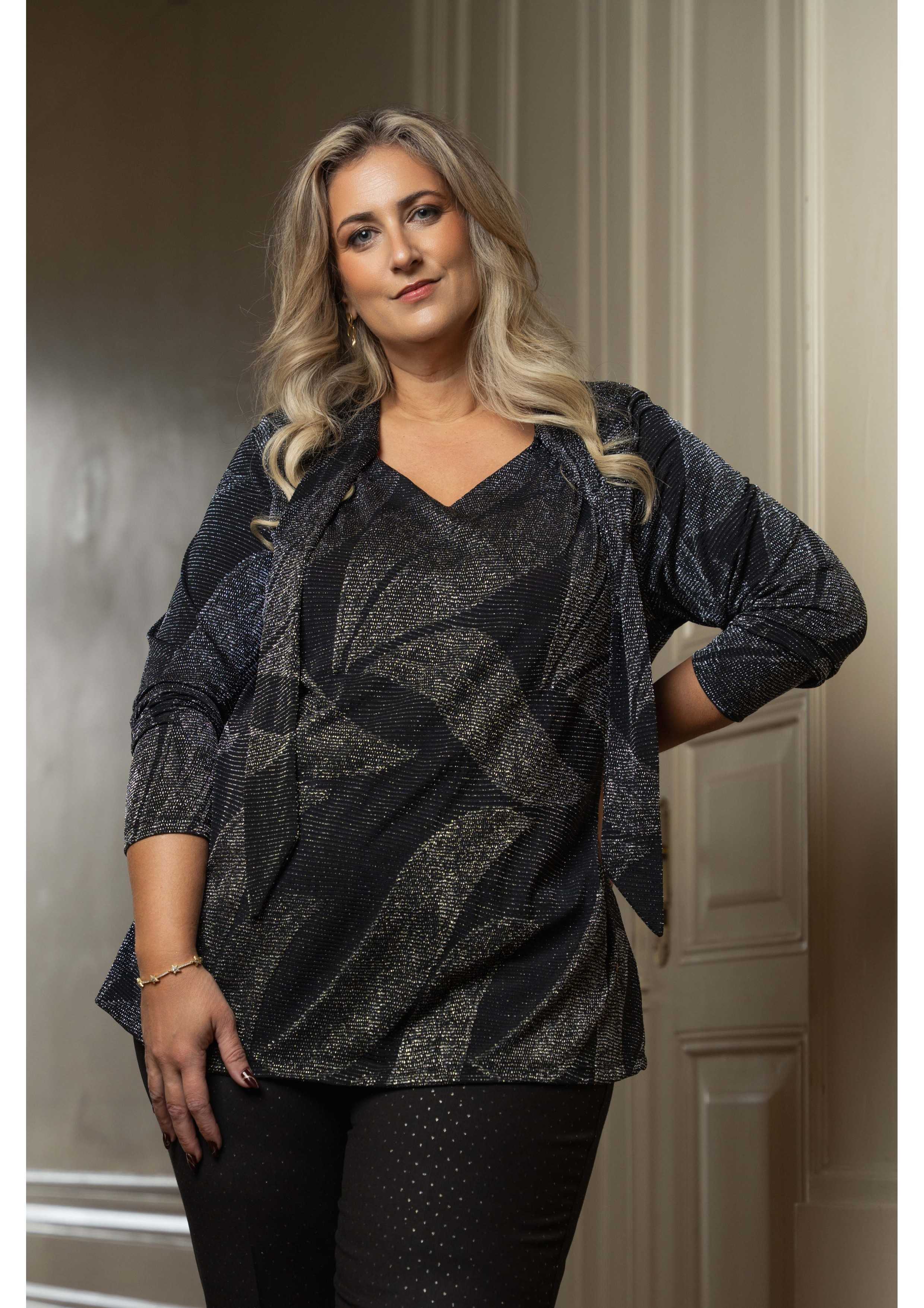 Túnica em malha lisa, com fio lurex. manga comprida, decote em bico com laço apertado, franza nos ombros caídos, modelo ligeiramente evasé. Disponível em Tamanhos Grandes Produto de desenho e fabrico próprio. Somos uma marca de confeção de vestuário com mais de 50 anos de experiência Modelo: Altura 1.82m e está a vestir o tamanho 3XL.